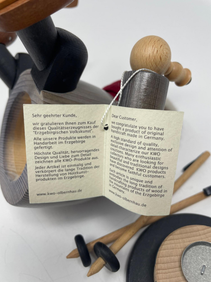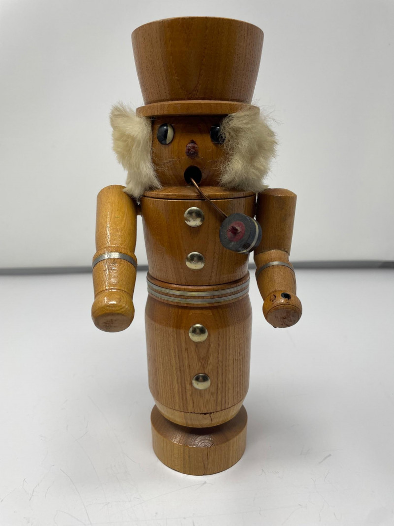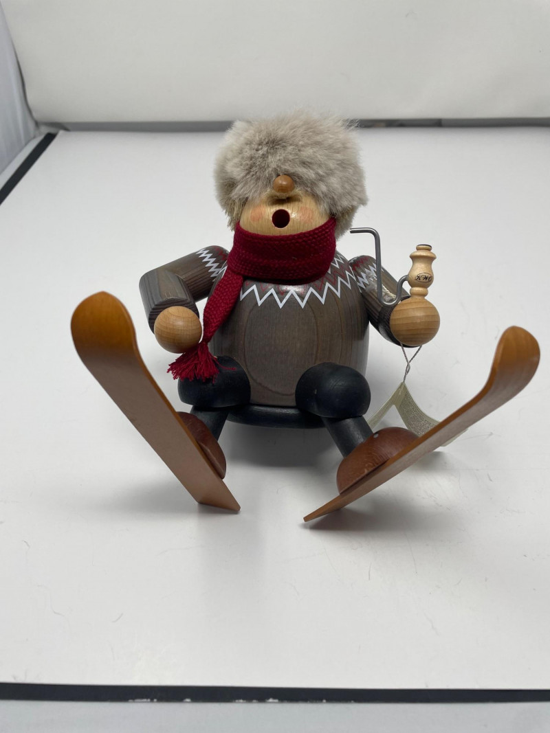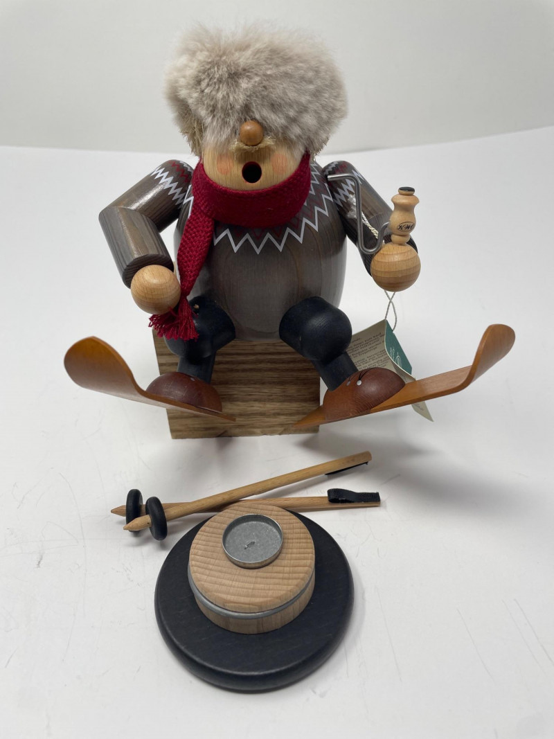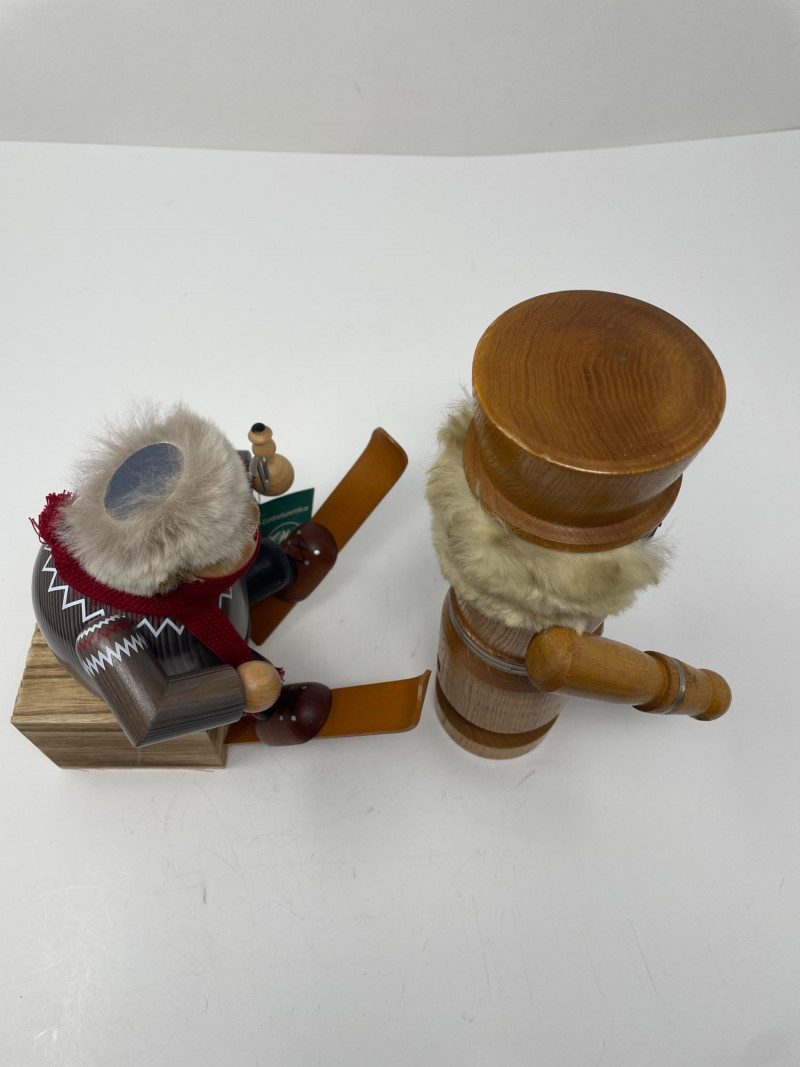 Skier Smoker: Seated figure with skis, red scarf, fur hat, and zigzag sweater Mounted on wooden block base Emits incense smoke through mouth when lit Soldier/Winter Character Smoker: Standing figure with tall cylindrical hat, fur earmuffs, and pipe Buttoned torso and upright posture Emits incense smoke through pipe Craftsmanship: Marked “ECHT HANDARBEIT” (genuine handmade) Rich in detail, texture, and traditional charm Ideal for collectors of German folk art or seasonal décor Measurements: Skier 7” x 7” and Wood Soldier 10”x 3”Two German Wood Incense Smokers – Handcrafted Erzgebirge Figures