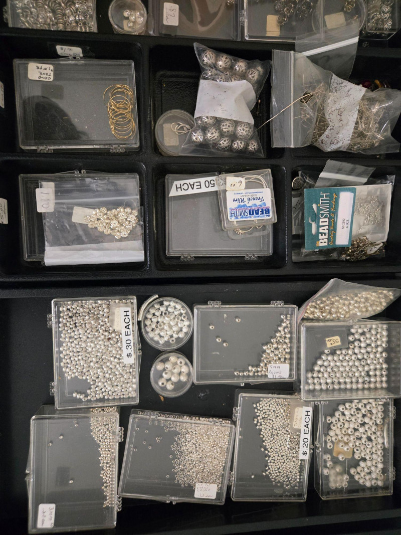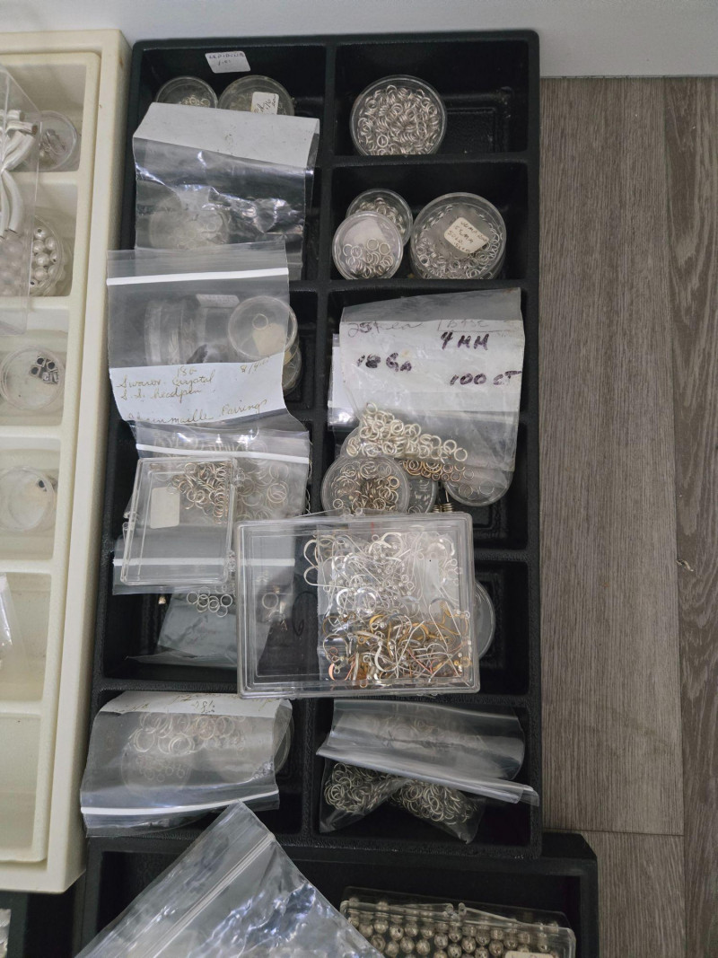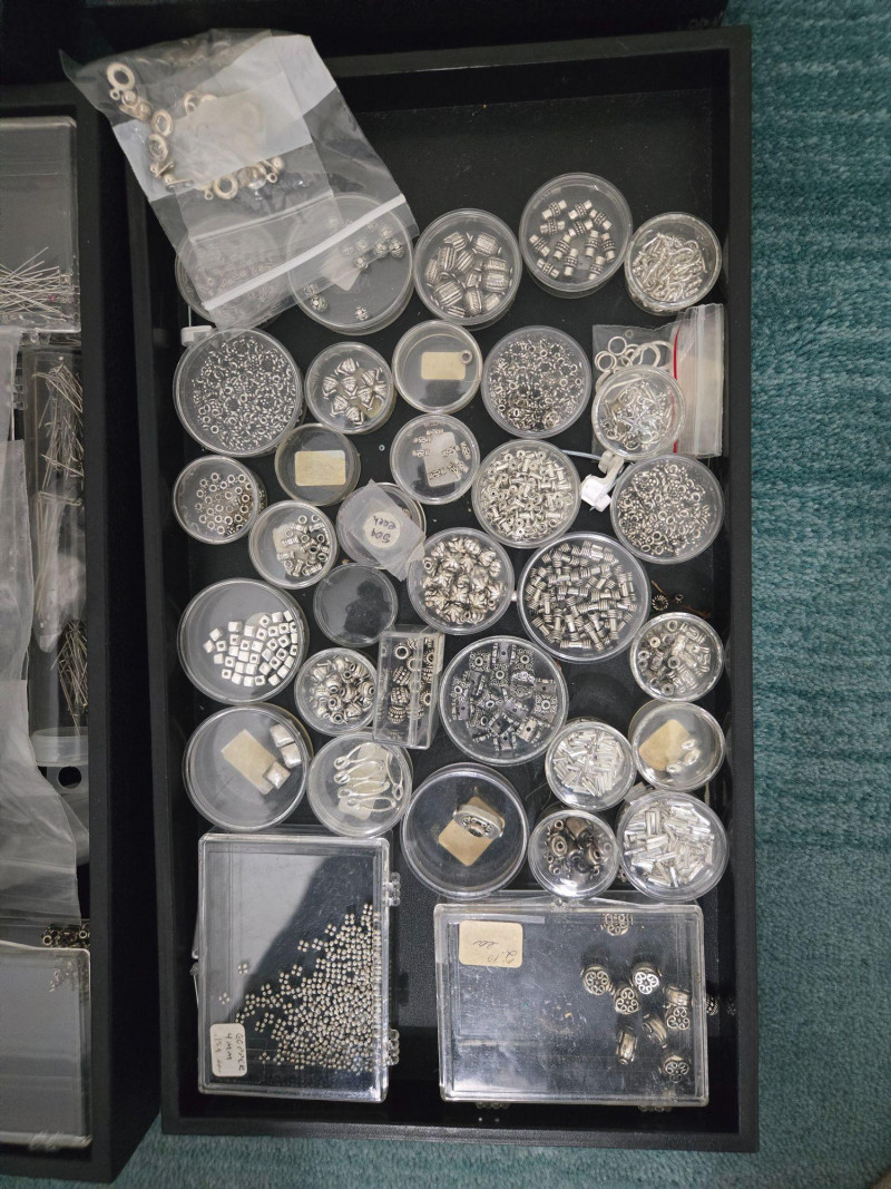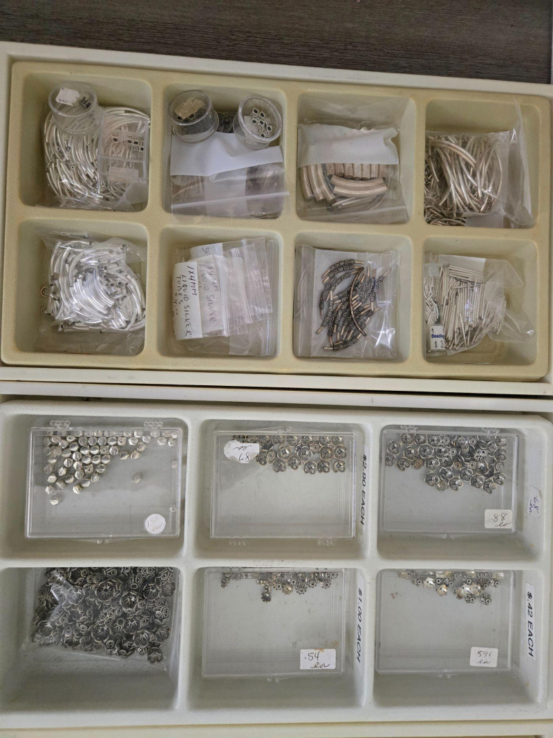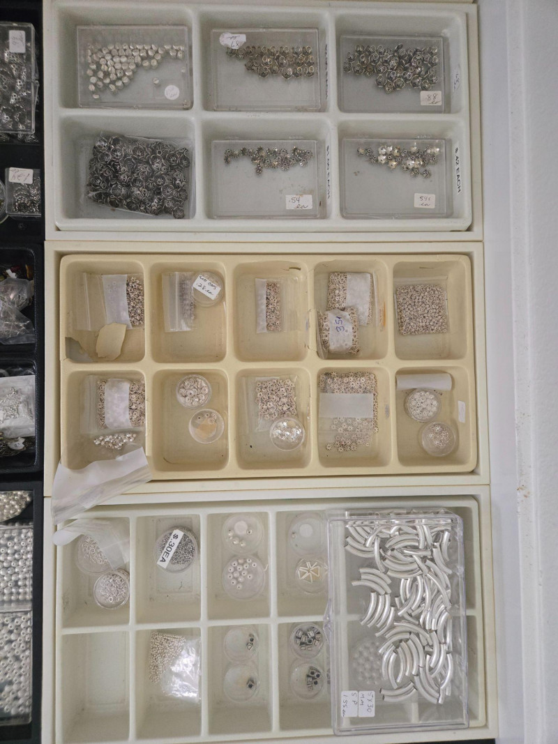 Materials & Styles: Predominantly silver-tone beads: polished, matte, antiqued, and textured finishes Includes jump rings, headpins, eye pins, crimp beads, spacers, clasps, and connectors Shapes: round, oval, tube, faceted, floral, and novelty forms Some trays include bagged micro components and labeled vials for precision sorting Organization: Professionally arranged in compartmentalized trays Labeled sections for easy identification and bundling Ideal for sorting by size, style, or project type Auction Terms: Bidding agreement required; pickup must be arranged unless shipping is pre-approved Full payment due by 8:00 p.m. the day after auction closes 10% buyer’s premium and sales tax apply unless re-seller license is provided15 Trays of Mostly Silver Beads – Beader’s Dream