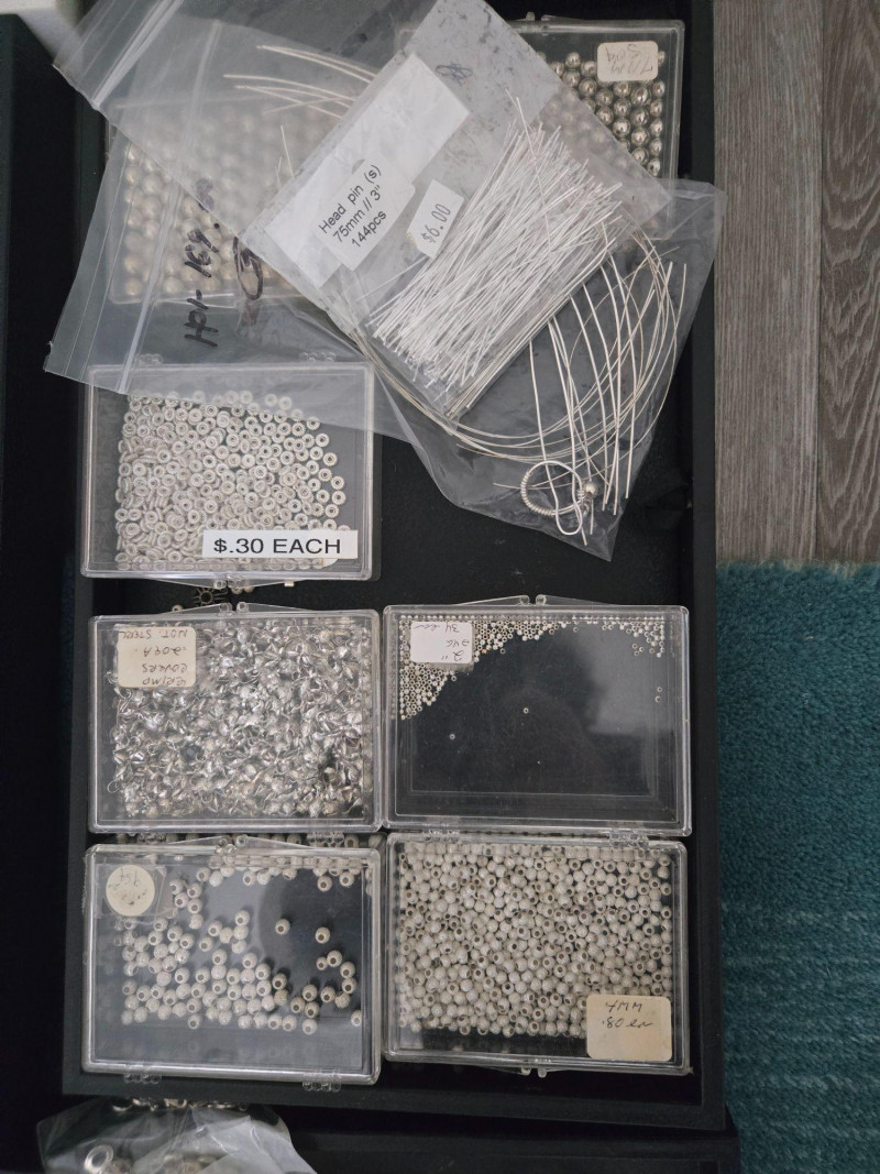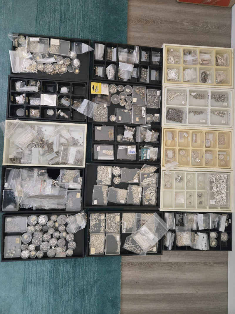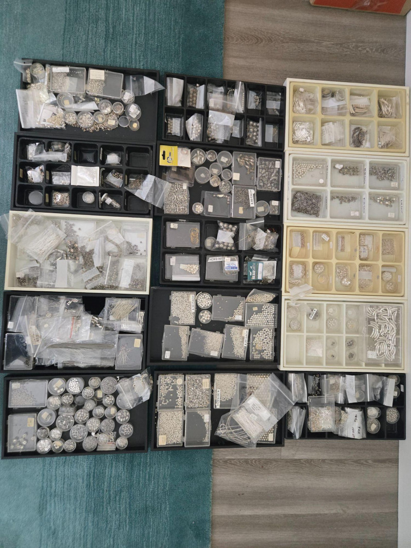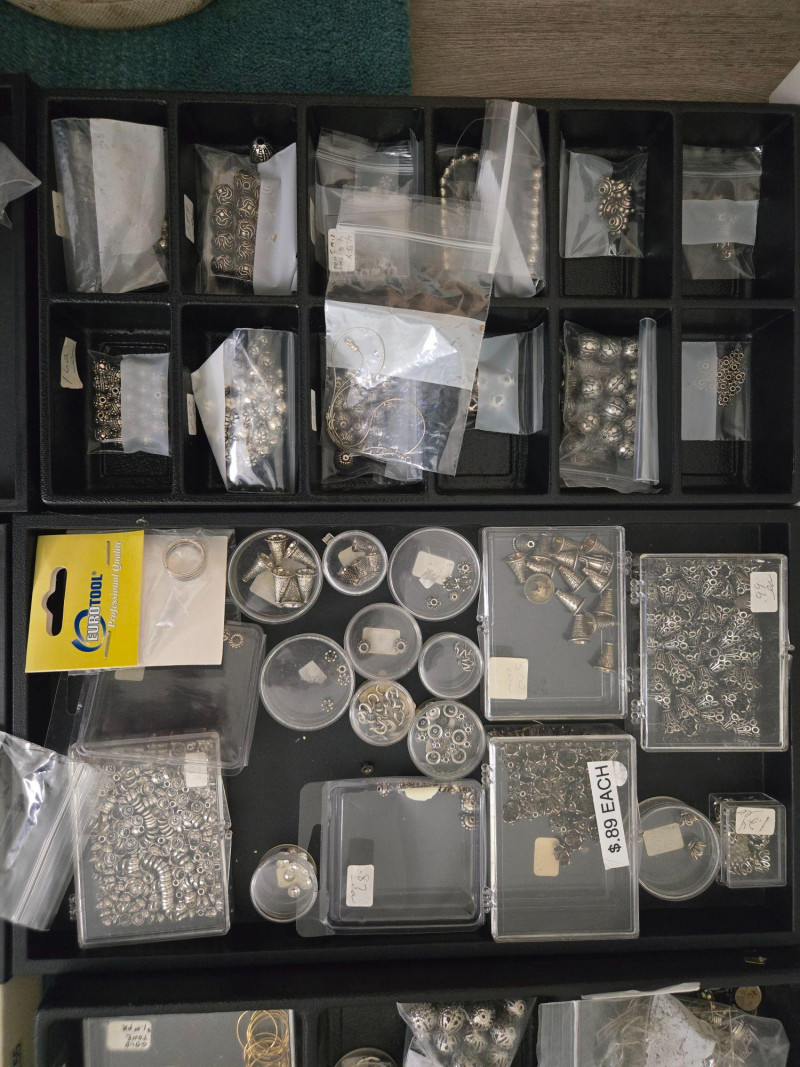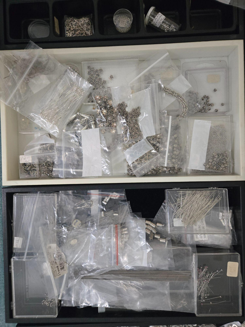 Materials & Styles: Predominantly silver-tone beads: polished, matte, antiqued, and textured finishes Includes jump rings, headpins, eye pins, crimp beads, spacers, clasps, and connectors Shapes: round, oval, tube, faceted, floral, and novelty forms Some trays include bagged micro components and labeled vials for precision sorting Organization: Professionally arranged in compartmentalized trays Labeled sections for easy identification and bundling Ideal for sorting by size, style, or project type Auction Terms: Bidding agreement required; pickup must be arranged unless shipping is pre-approved Full payment due by 8:00 p.m. the day after auction closes 10% buyer’s premium and sales tax apply unless re-seller license is provided15 Trays of Mostly Silver Beads – Beader’s Dream