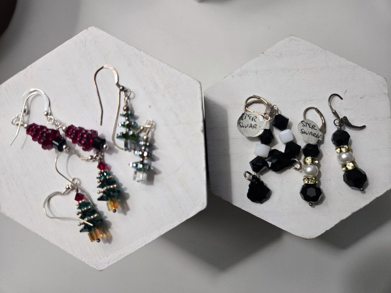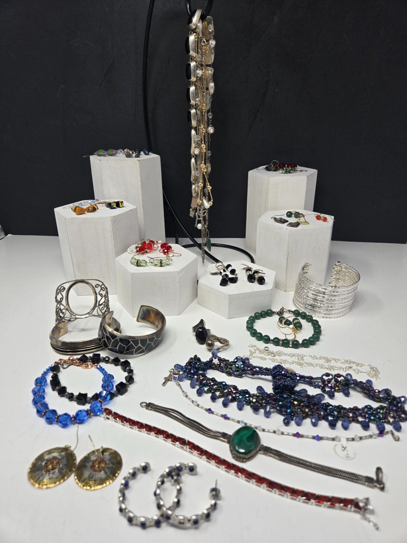 Swarovski Elements: Includes bead jewelry and crystal-accented pieces Ideal for collectors or crafters seeking authentic Swarovski sparkle Jewelry Variety: Rings with colorful stones and silver settings Beaded bracelets in blue, black, and green tones Statement earrings, ornate pendants, and layered necklaces Multiple chains displayed on vertical stand Presentation: Displayed on white pedestals and black backdrop for visual impact Includes risers, blocks, and hangers for organized viewing Ready for sorting by material, style, or color themeItem Highlights