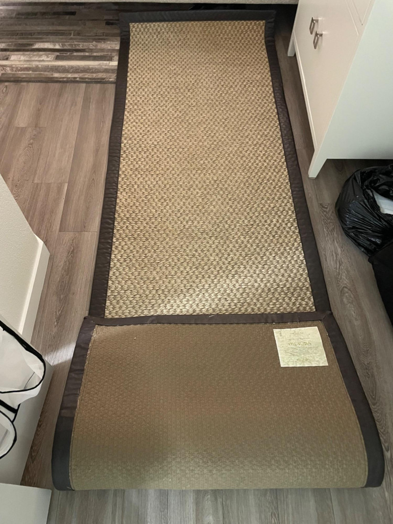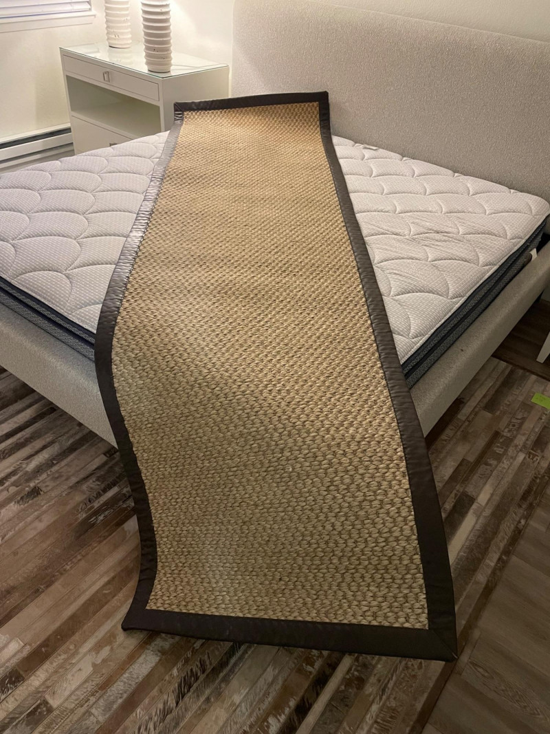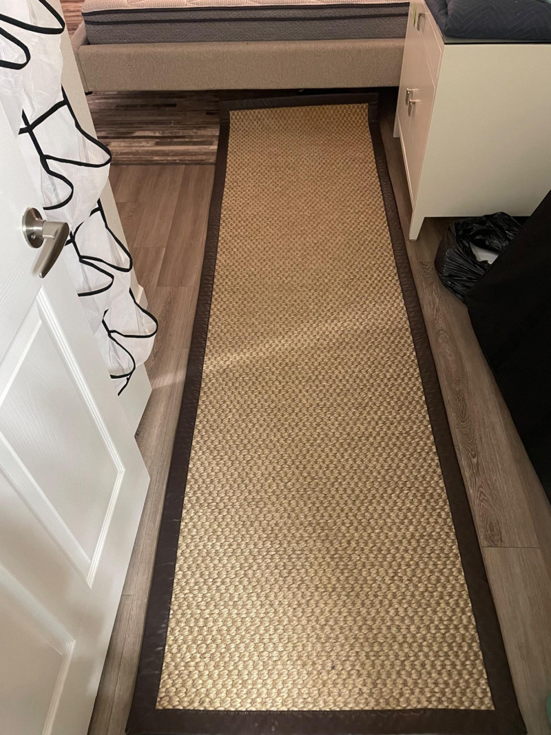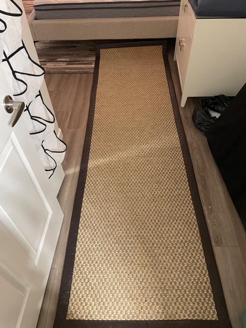 Design & Texture: Neutral-toned woven sisal with dark brown border Durable, eco-friendly, and ideal for high-traffic areas Provides natural warmth and texture to wood or tile floors Placement & Use: Perfect as a hallway runner, bedside accent, or entryway grounding piece Coordinates well with minimalist, coastal, or rustic interiors Adds organic charm and visual length to narrow spaces Presentation: Shown in situ beside bed and cabinet for scale and styling inspiration Ready for pickup—bring tools if removal from under furniture is neededMerida Sisal Runner Rug – 115" × 34" Natural Fiber Elegance