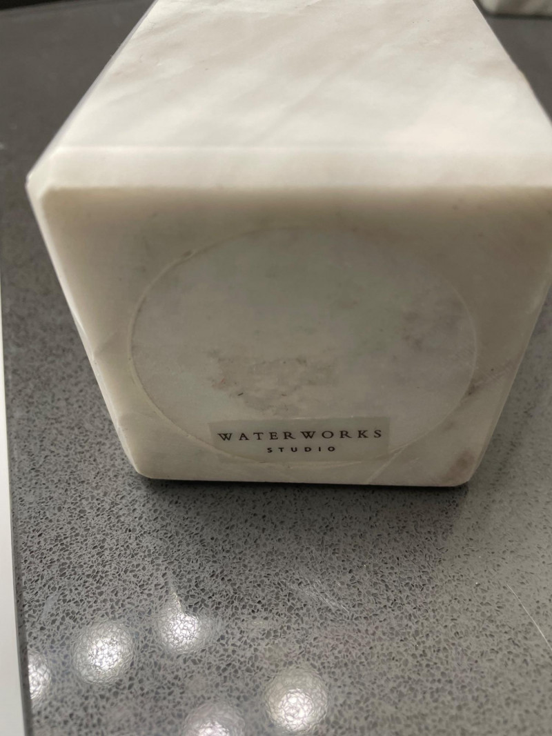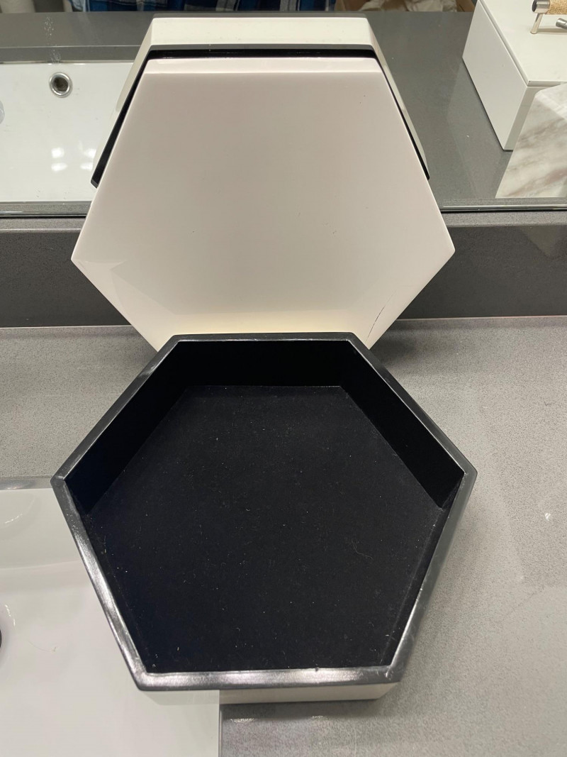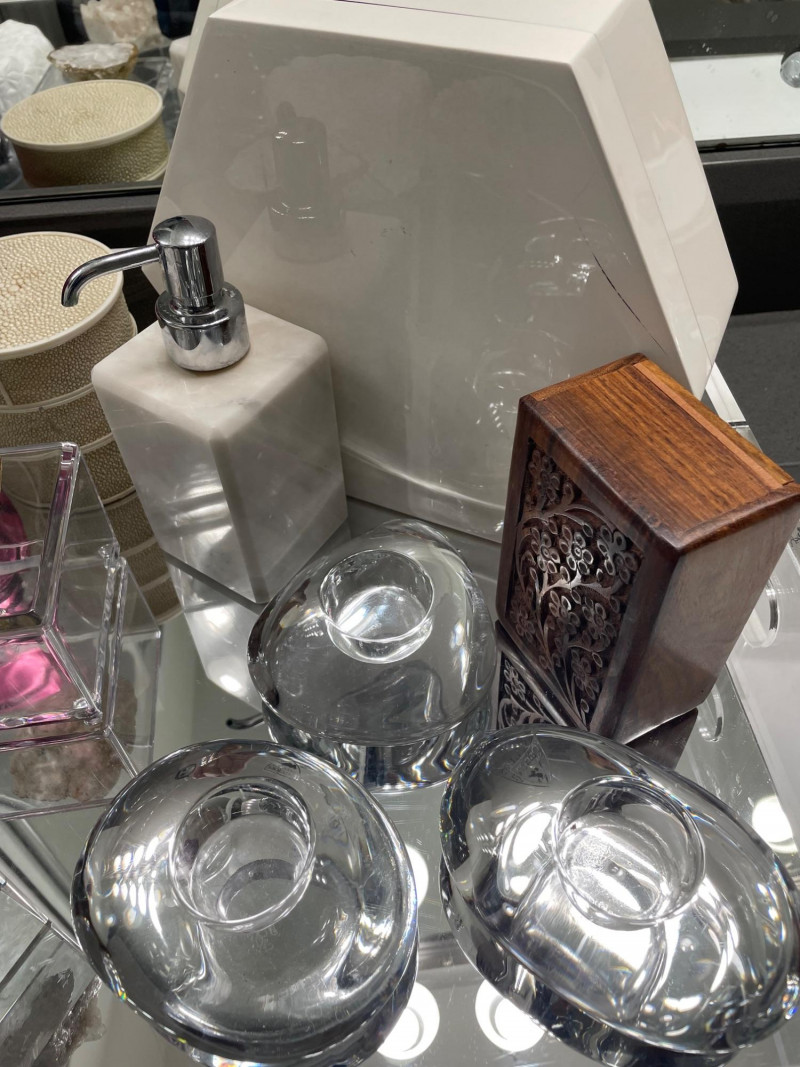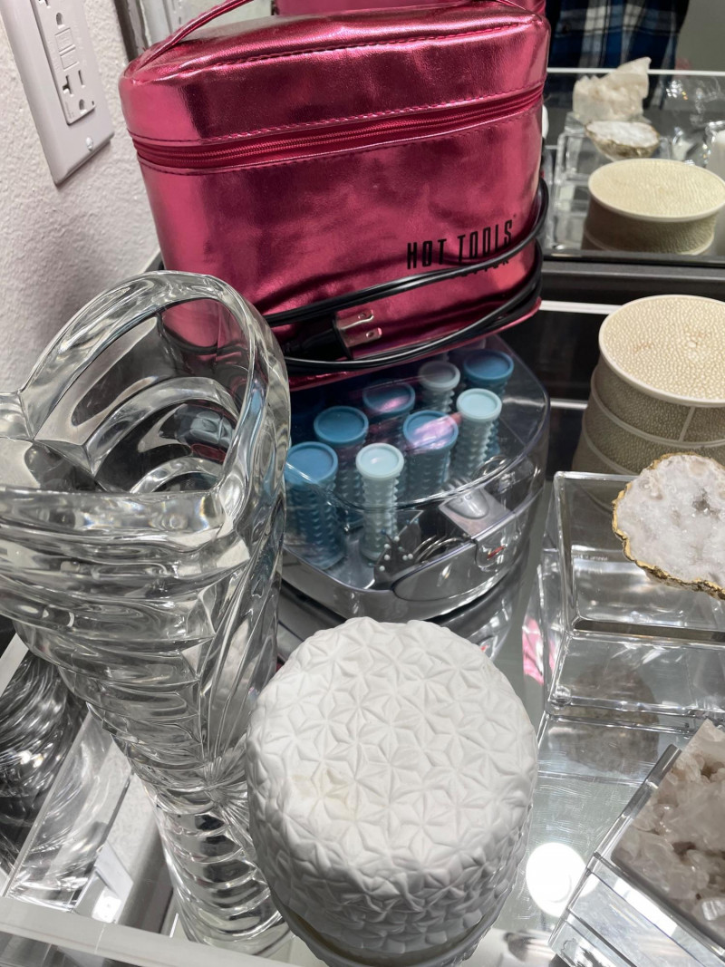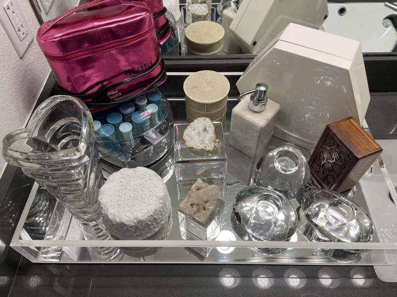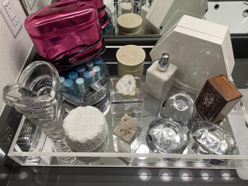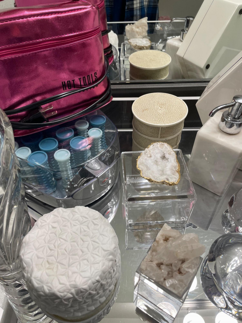 Decor & Storage: Mirrored vanity tray with elegant layout White textured containers, marble soap/lotion dispenser, and geometric accent pieces Carved wooden box and clear glass bowls for jewelry or cotton rounds Beauty & Grooming: “HOT TOOLS” metallic cosmetic pouch Assorted grooming items in circular holder (possibly curlers or skincare tubes) Tall glass vase with heart-shaped opening for brushes or florals Crystal Accents: Clear quartz cluster and gold-trimmed geode in display cubes Adds a touch of spa-like serenity and natural charmBath Decor, Hot Curl & Accessories – Vanity Tray with Beauty & Crystal Accents