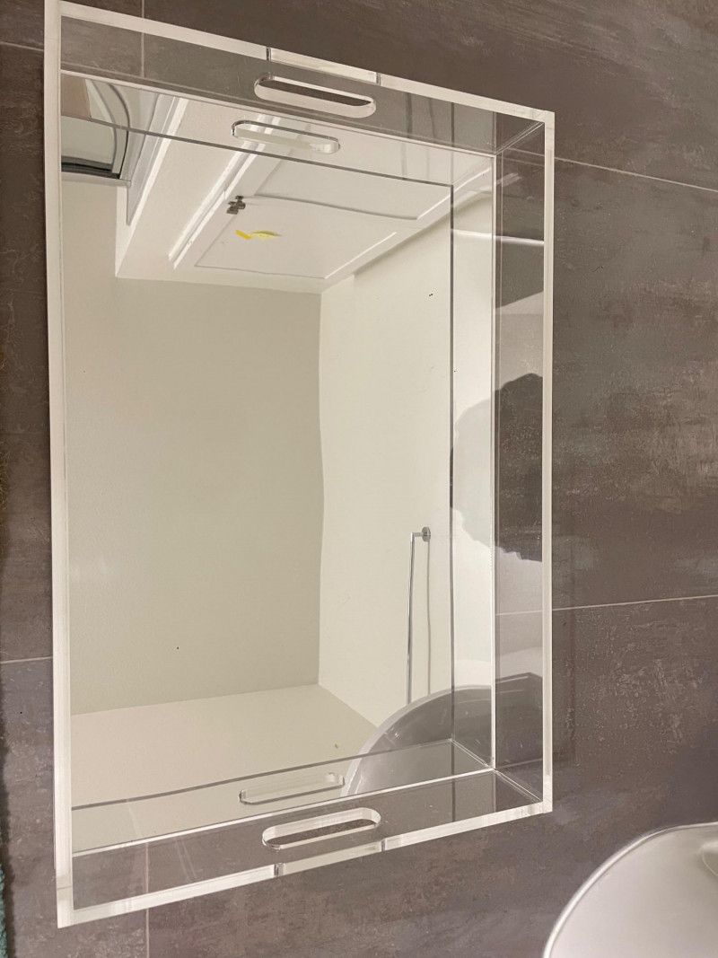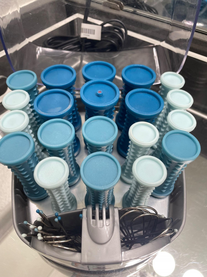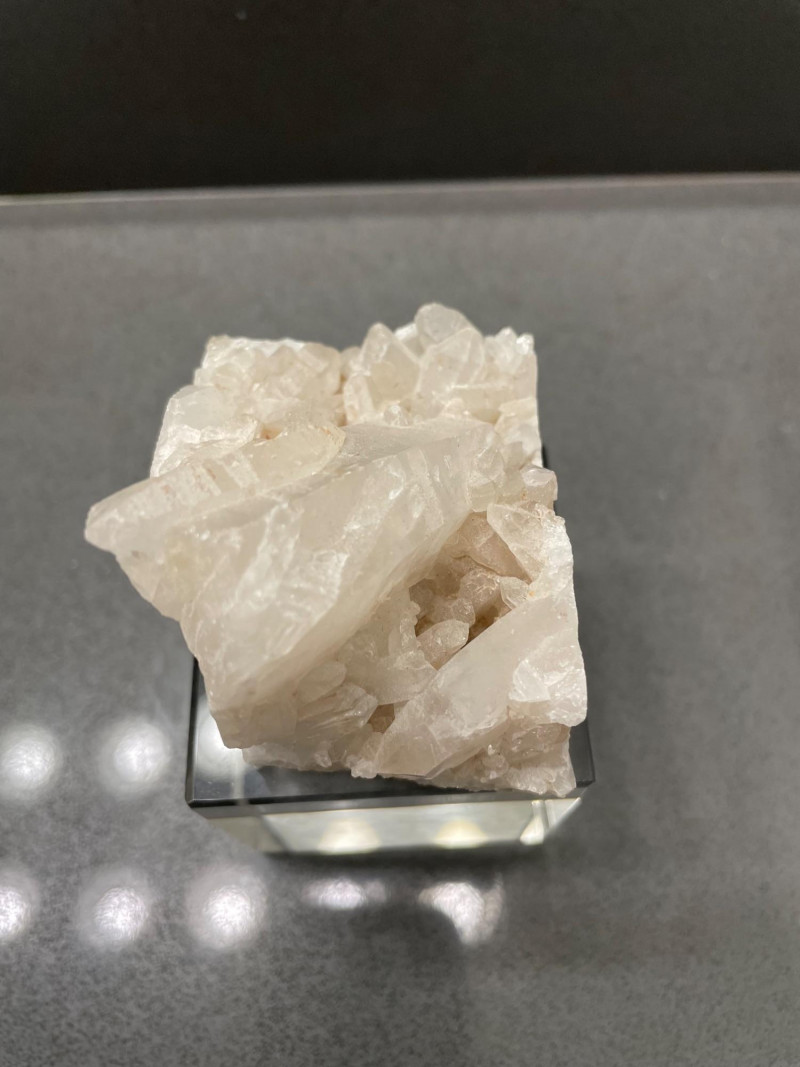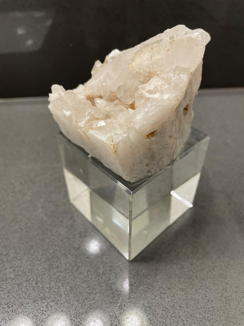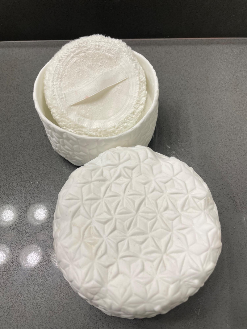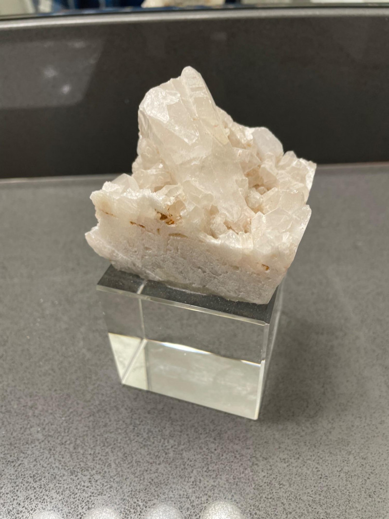 Decor & Storage: Mirrored vanity tray with elegant layout White textured containers, marble soap/lotion dispenser, and geometric accent pieces Carved wooden box and clear glass bowls for jewelry or cotton rounds Beauty & Grooming: “HOT TOOLS” metallic cosmetic pouch Assorted grooming items in circular holder (possibly curlers or skincare tubes) Tall glass vase with heart-shaped opening for brushes or florals Crystal Accents: Clear quartz cluster and gold-trimmed geode in display cubes Adds a touch of spa-like serenity and natural charmBath Decor, Hot Curl & Accessories – Vanity Tray with Beauty & Crystal Accents