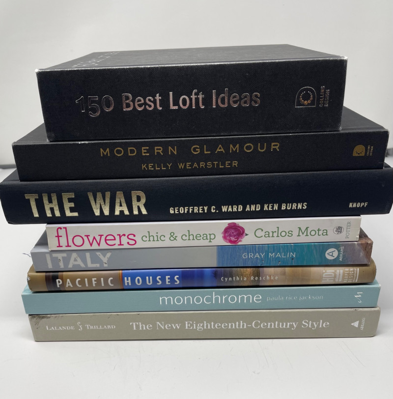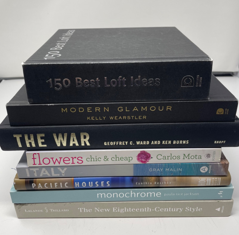 150 Best Loft Ideas – Collins Design Modern Glamour – Kelly Wearstler The War – Geoffrey C. Ward & Ken Burns Flowers Chic & Cheap – Carlos Mota Italy – Gray Malin Pacific Houses – Cynthia Reschke Monochrome – Paula Rice Jackson The New Eighteenth-Century Style – Lalande & TrillardGreat Book Lot – Shelf & Table Styling with Design, History & Lifestyle Themes
