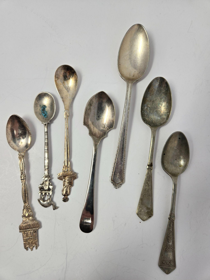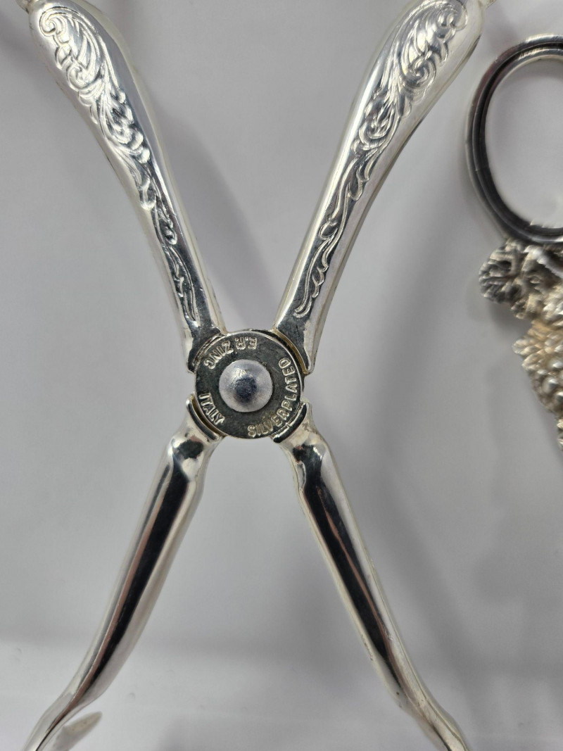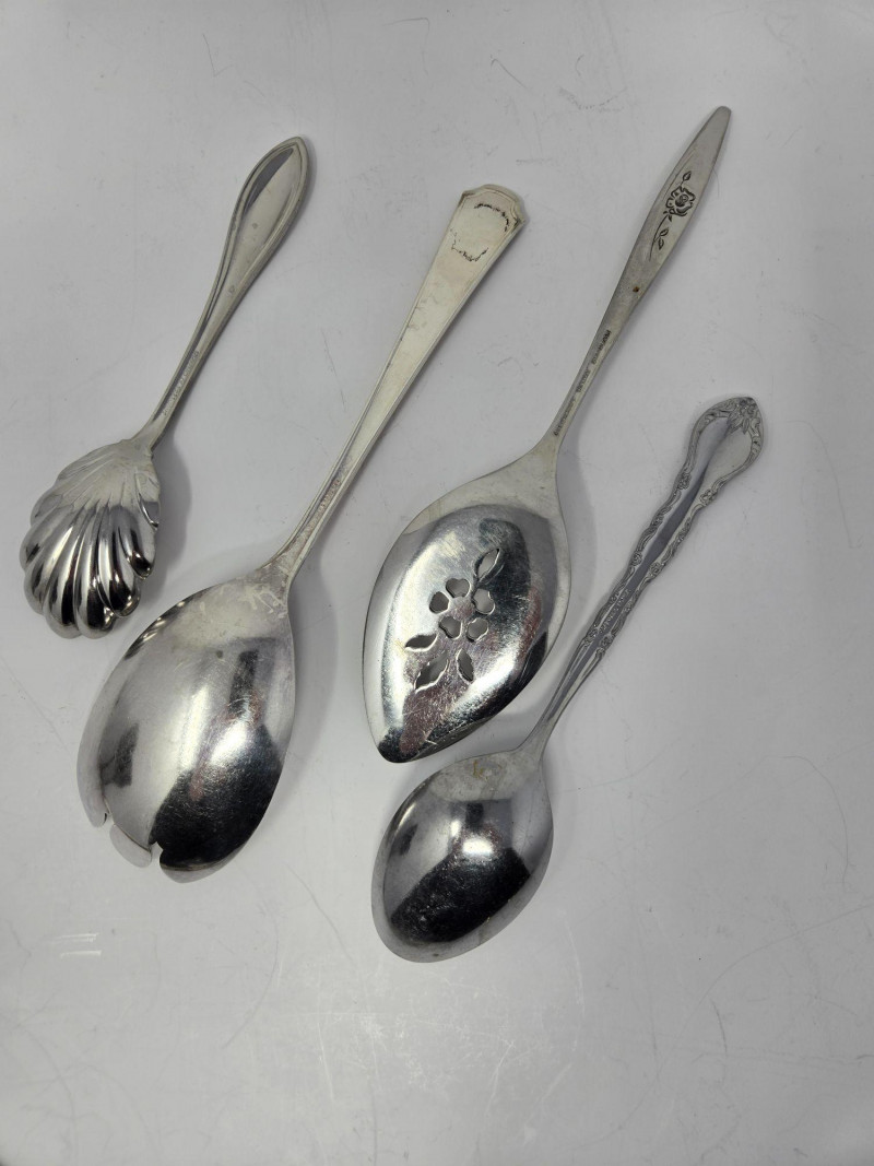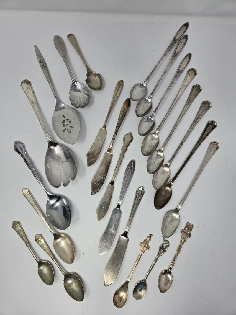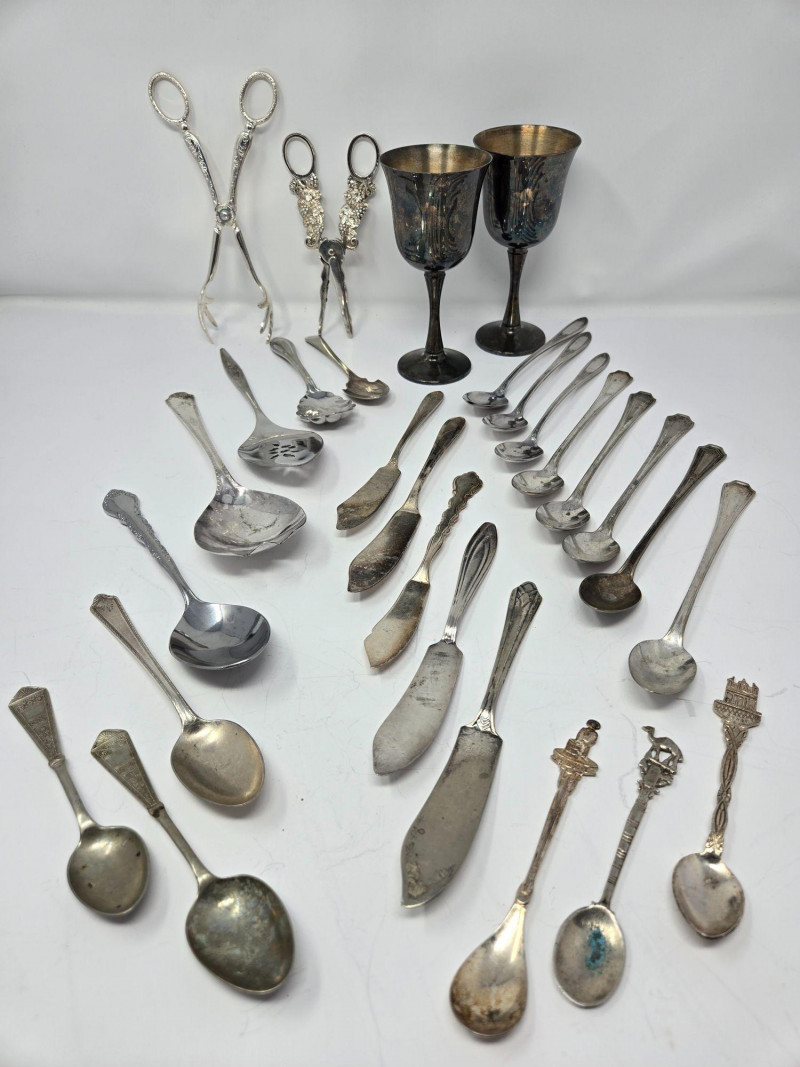 Utensils & Flatware: Includes forks, knives, spoons, and ornate serving pieces Features decorative tongs, souvenir spoons, and patterned handles Variety of sizes and styles—ideal for mixing and matching Specialty Items: Two vintage goblets with dark patina and classic silhouette Assorted ladles, spreaders, and pierced serving tools Some pieces marked or hallmarked (not verified for sterling) Presentation: Arranged for visual impact and easy bundling Ideal for collectors, stylists, or vintage kitchen enthusiasts Auction Terms: Bidding agreement required; pickup must be arranged unless shipping is pre-approved Full payment due by 8:00 p.m. the day after auction closes 10% buyer’s premium and sales tax apply unless re-seller license is providedCollection of Silver-Plated Serving Pieces – Vintage Elegance for Entertaining