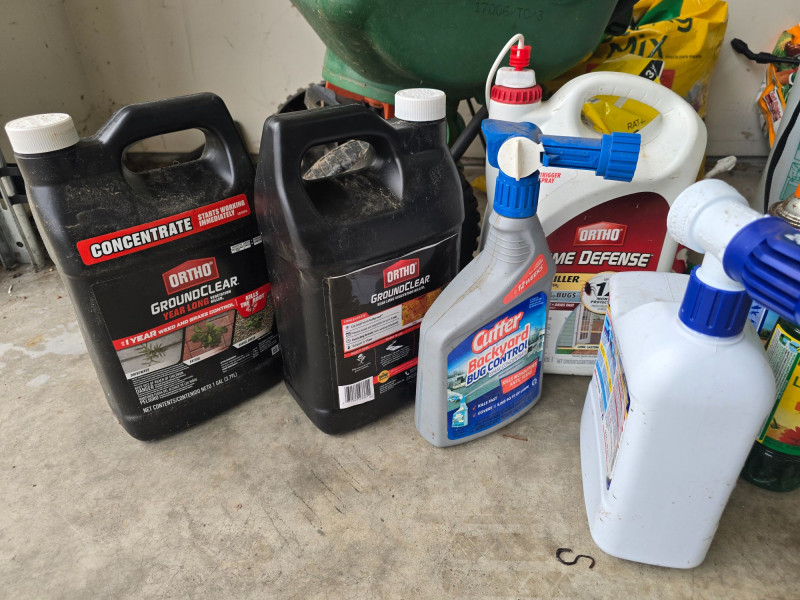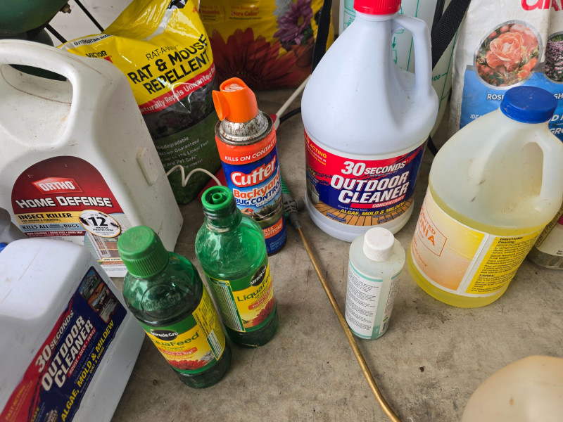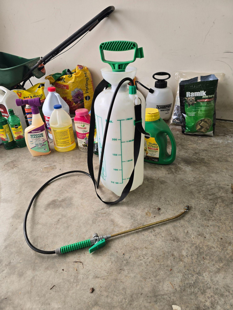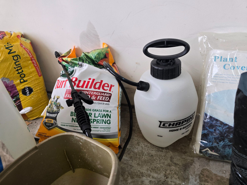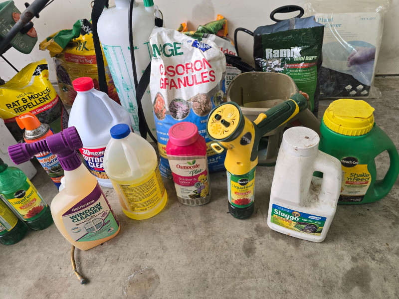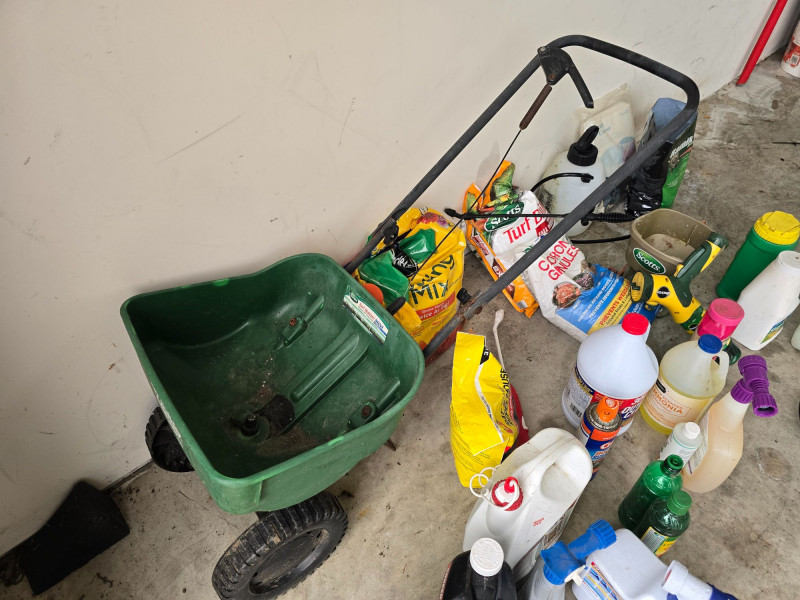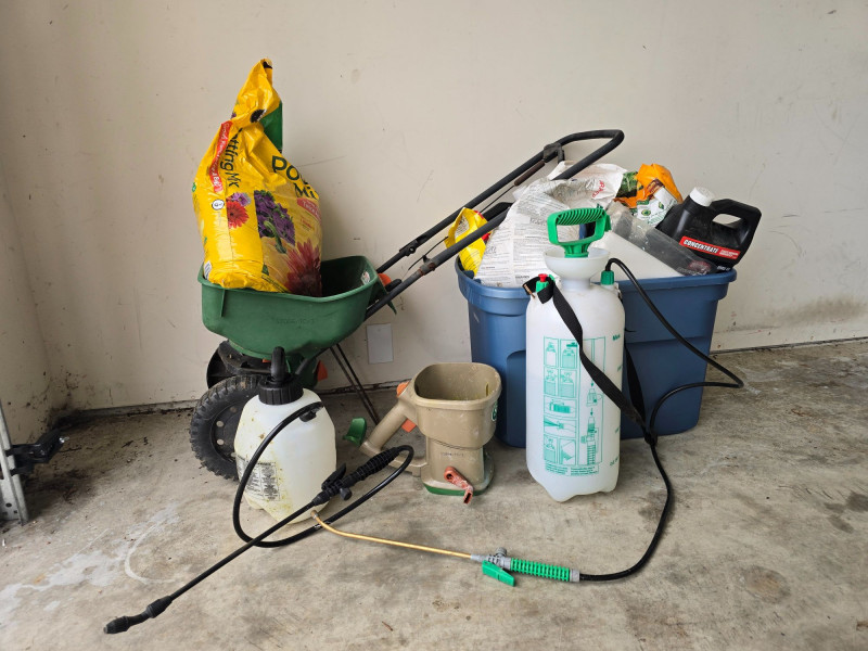 Mixed assortment of garden and yard‑care supplies. This multi‑piece lot includes: Spray tanks with attached hoses Seed spreader Several bags of soil Various fertilizer containers Garden defense products Pest control items Additional miscellaneous garden supplies Items show wear from use and storage. Sold as‑is. Refer to photos for condition and included pieces. Category: Garden & Outdoor Supplies