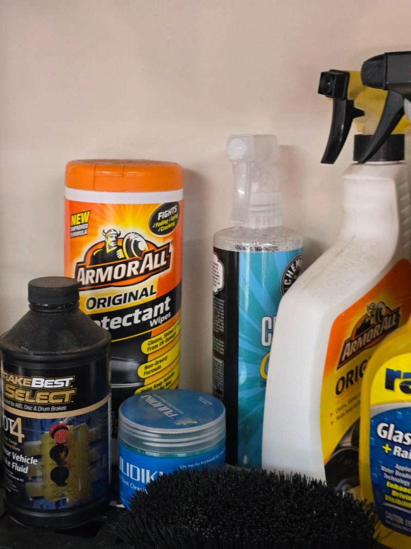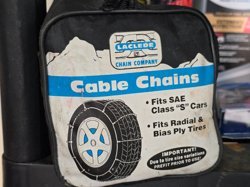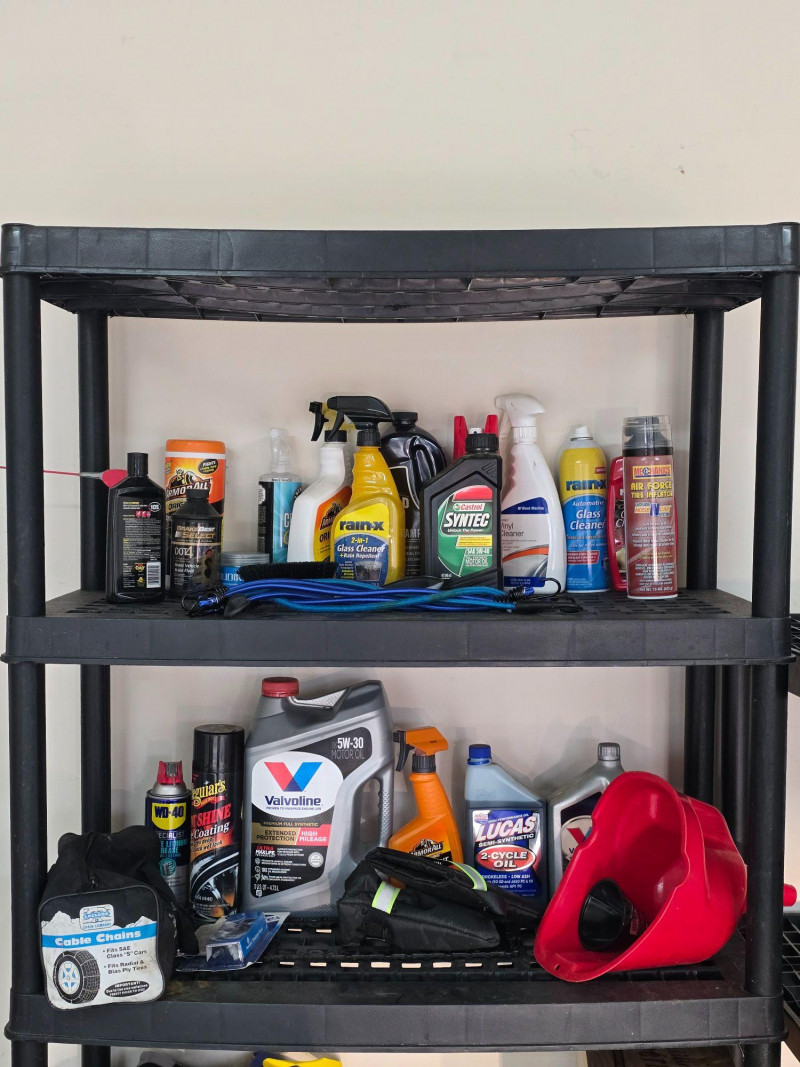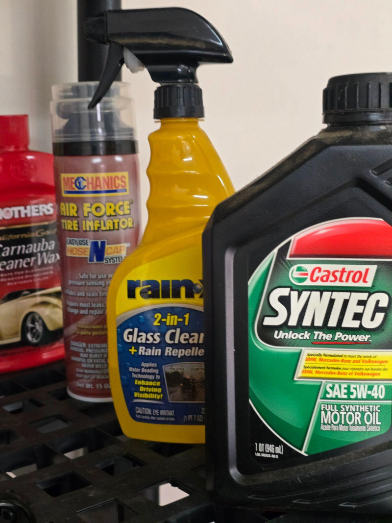 Large assorted lot of automotive items including car cleaning products, tire chains, motor oil, and additional related supplies. Contents vary in type and condition. A practical mixed group for vehicle maintenance, detailing, and emergency readiness. Condition: Mixed use and storage wear. Some items new or partially used; tire chains appear complete but untested. Notes: Sold as a single lot. Please review photos for included items.