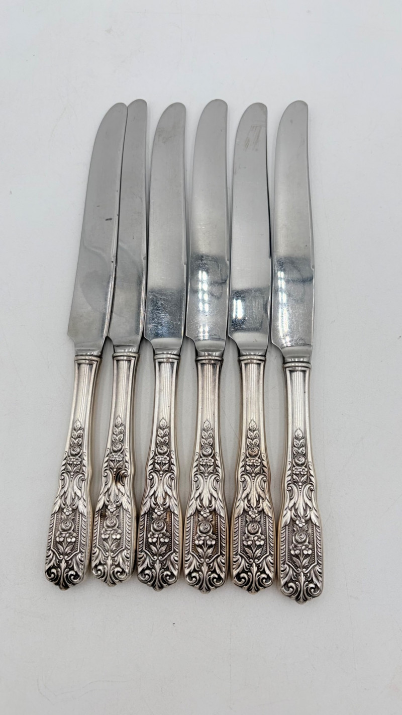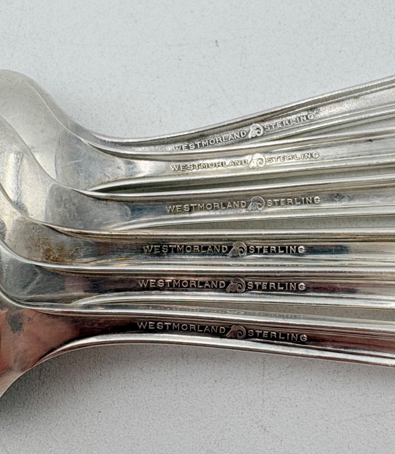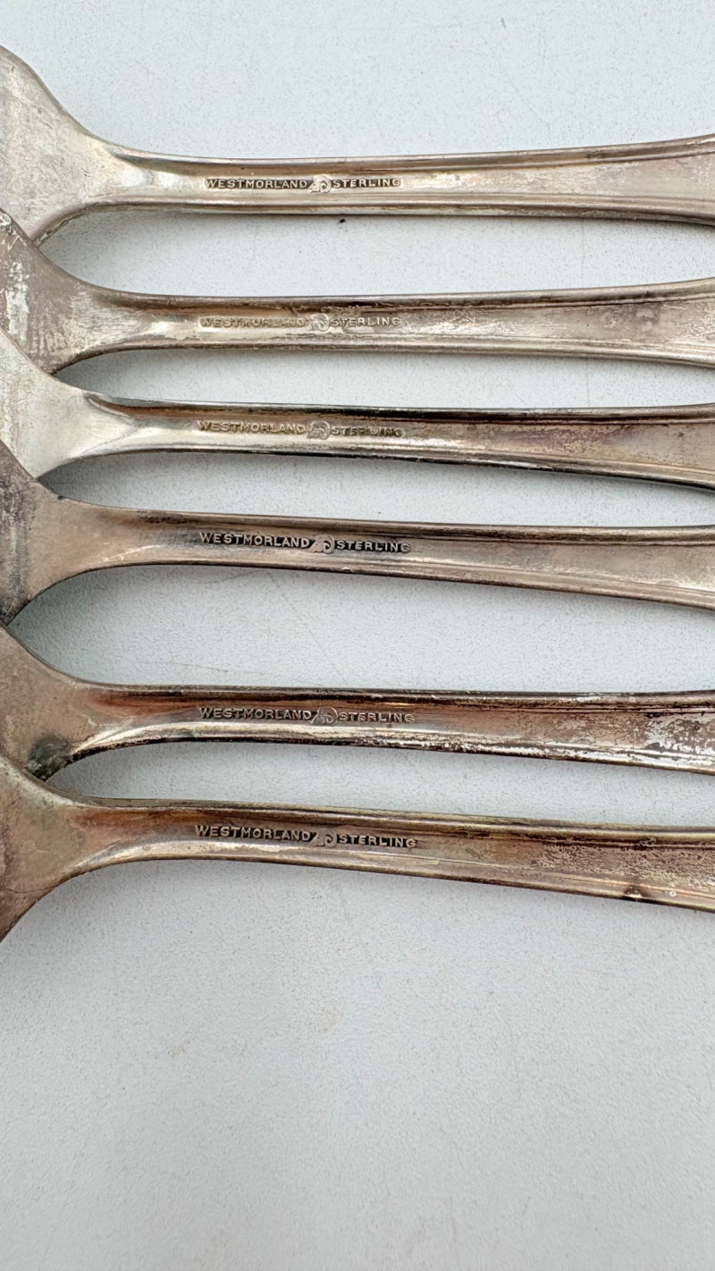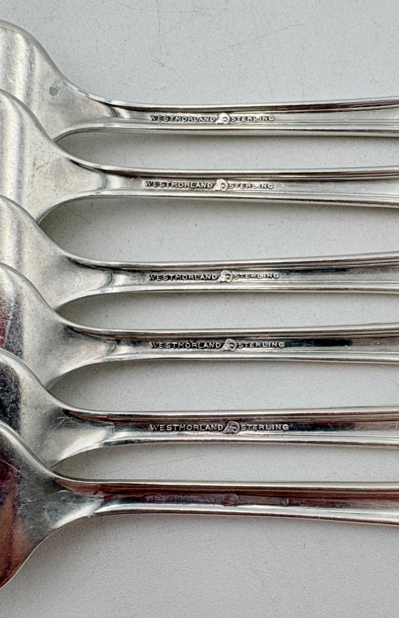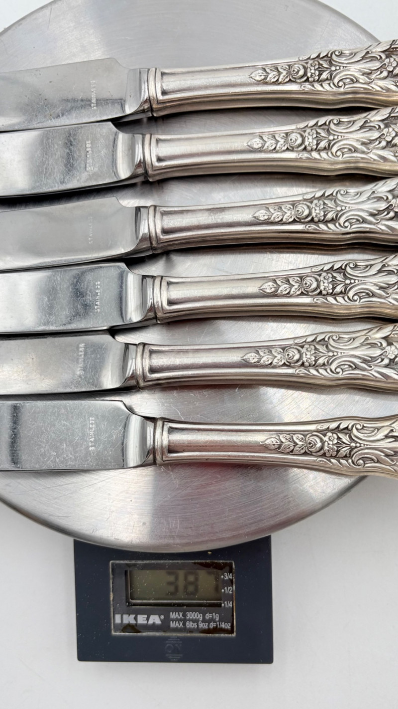 We believe this is a complete setting for 6 in Westmoreland's Milburn Rose pattern*. Marked sterling on the back (knives have stainless steel blades). Pattern was first produced in 1940 and was immensely popular due to its design that managed be intricate yet restrained at the same time. There is very little oxidation on the spoons and salad forks as they were sealed storage, but the dinner forks & knives need a good polish. Knives measure 9" Dinner forks measure 7 1/8" Salad forks measure 6 1/4" Spoons measure 6 7/8" * 2 things of note: - Tor some odd reason, one of the salad forks is not marked sterling - the area on it where the others are marked is smudged; it looks and weighs the same as the other salad forks and isn't magnet-affected. - There is one spoon that has a slight nick in the bowl part - please see last photo. We think it is a teaspoon as it is the same size as the others, but there's a slight chance it might be a jam spoon. However, client had no other serving utensils in the pattern, so we think it might have had an affair with the garbage disposal at some point and been buffed out. See last photo for comparison. Total weight not including knives (because of stainless blades): 624 grams Total weight of knives only: 387 grams
