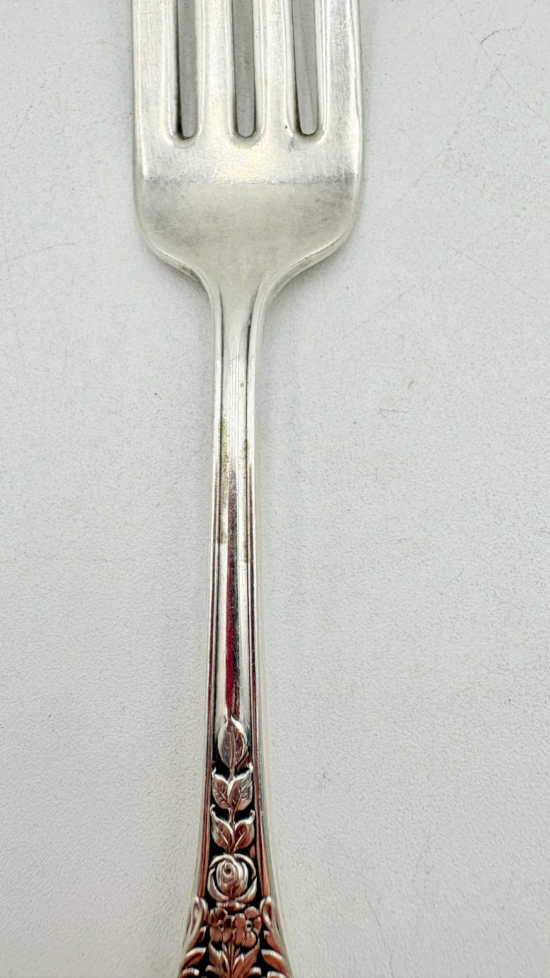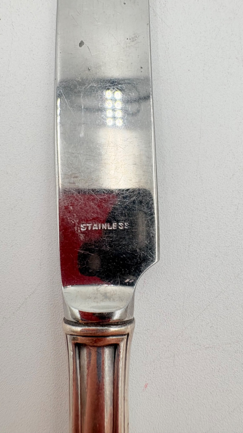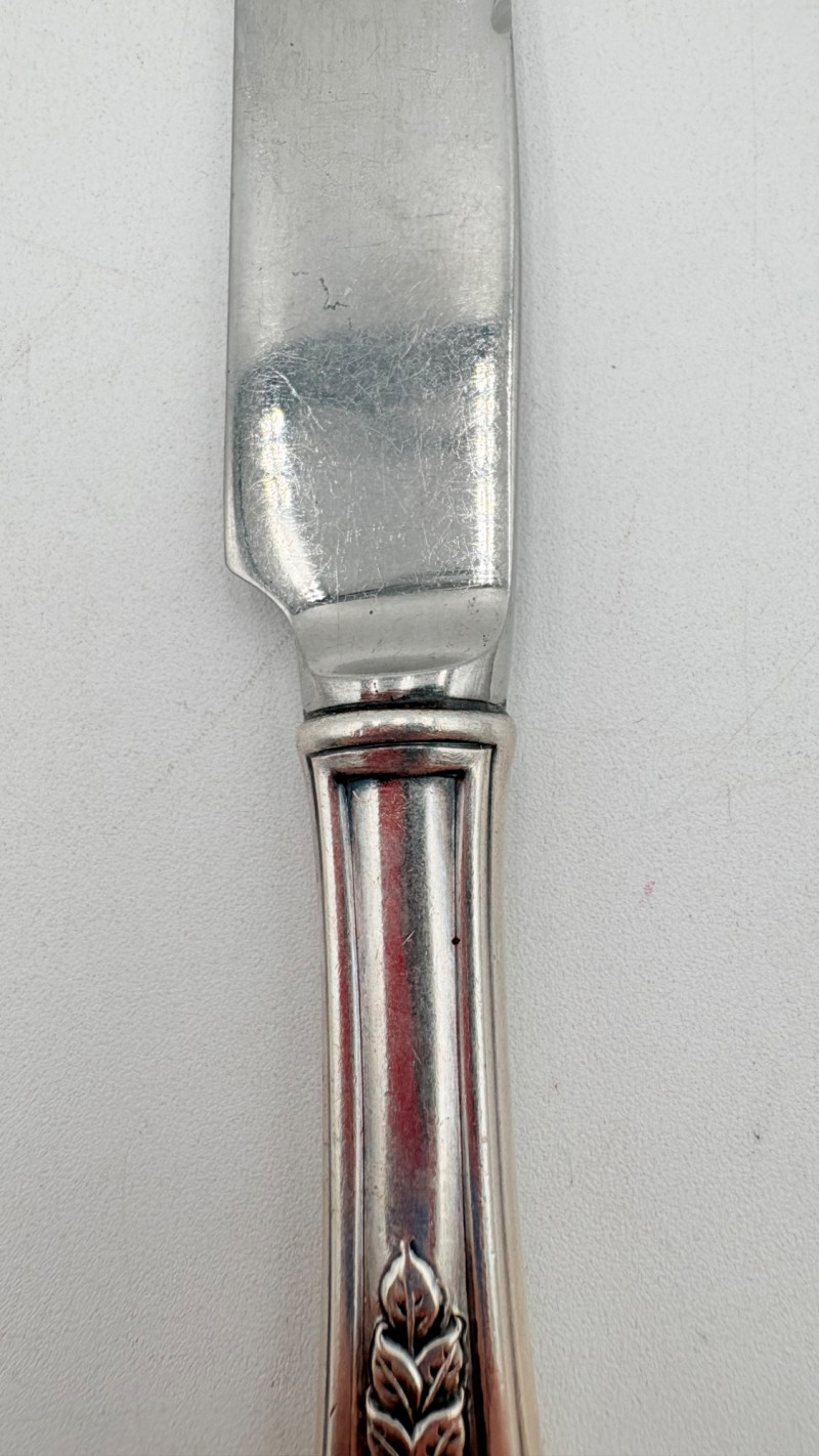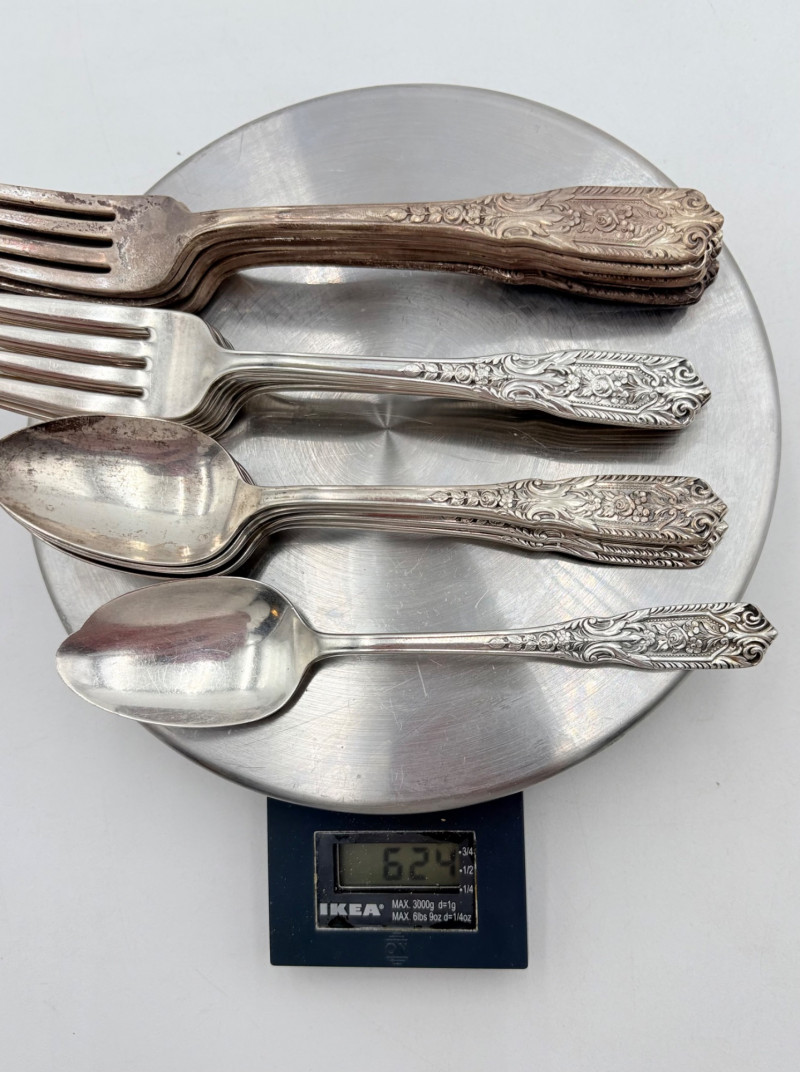 We believe this is a complete setting for 6 in Westmoreland's Milburn Rose pattern*. Marked sterling on the back (knives have stainless steel blades). Pattern was first produced in 1940 and was immensely popular due to its design that managed be intricate yet restrained at the same time. There is very little oxidation on the spoons and salad forks as they were sealed storage, but the dinner forks & knives need a good polish. Knives measure 9" Dinner forks measure 7 1/8" Salad forks measure 6 1/4" Spoons measure 6 7/8" * 2 things of note: - Tor some odd reason, one of the salad forks is not marked sterling - the area on it where the others are marked is smudged; it looks and weighs the same as the other salad forks and isn't magnet-affected. - There is one spoon that has a slight nick in the bowl part - please see last photo. We think it is a teaspoon as it is the same size as the others, but there's a slight chance it might be a jam spoon. However, client had no other serving utensils in the pattern, so we think it might have had an affair with the garbage disposal at some point and been buffed out. See last photo for comparison. Total weight not including knives (because of stainless blades): 624 grams Total weight of knives only: 387 grams