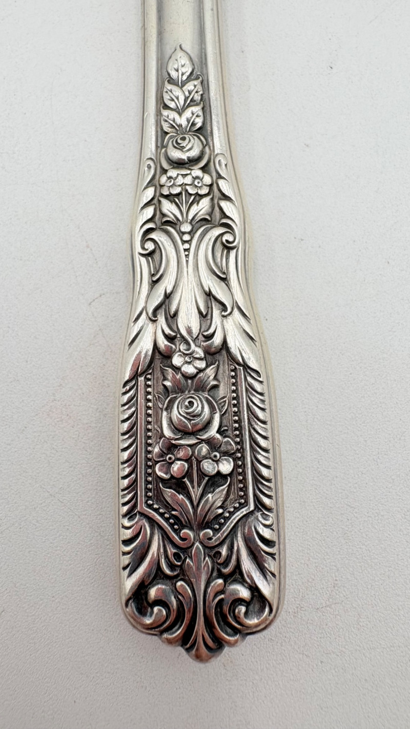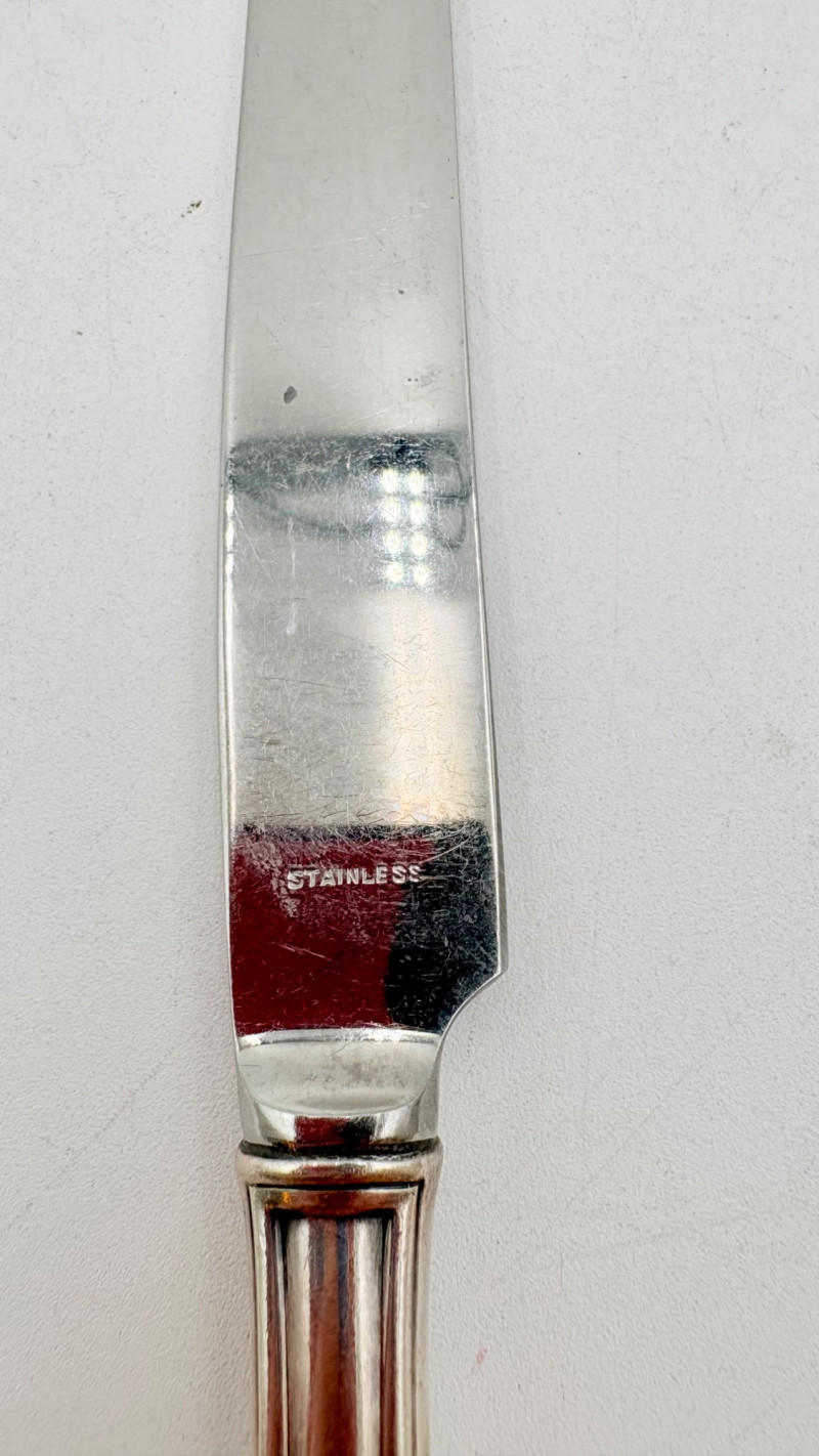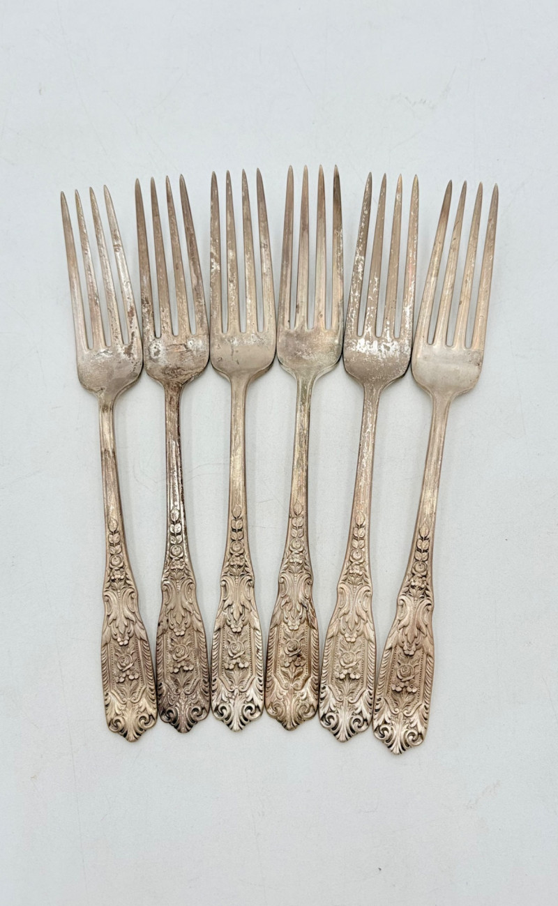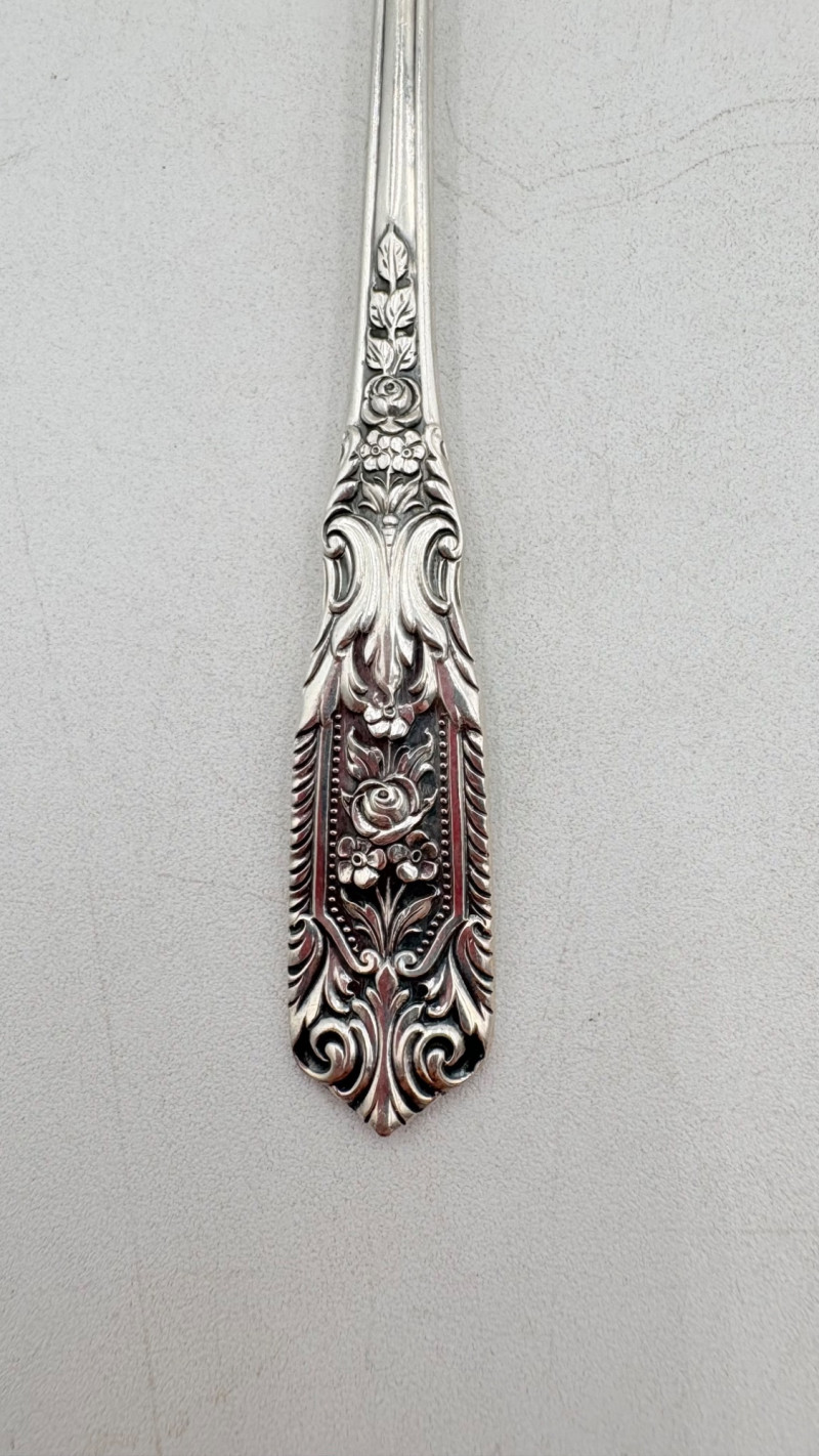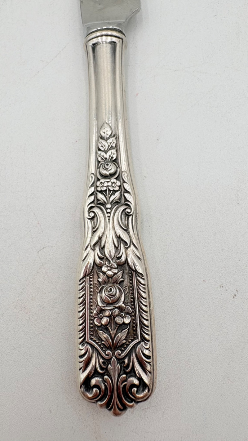 We believe this is a complete setting for 6 in Westmoreland's Milburn Rose pattern*. Marked sterling on the back (knives have stainless steel blades). Pattern was first produced in 1940 and was immensely popular due to its design that managed be intricate yet restrained at the same time. There is very little oxidation on the spoons and salad forks as they were sealed storage, but the dinner forks & knives need a good polish. Knives measure 9" Dinner forks measure 7 1/8" Salad forks measure 6 1/4" Spoons measure 6 7/8" * 2 things of note: - Tor some odd reason, one of the salad forks is not marked sterling - the area on it where the others are marked is smudged; it looks and weighs the same as the other salad forks and isn't magnet-affected. - There is one spoon that has a slight nick in the bowl part - please see last photo. We think it is a teaspoon as it is the same size as the others, but there's a slight chance it might be a jam spoon. However, client had no other serving utensils in the pattern, so we think it might have had an affair with the garbage disposal at some point and been buffed out. See last photo for comparison. Total weight not including knives (because of stainless blades): 624 grams Total weight of knives only: 387 grams