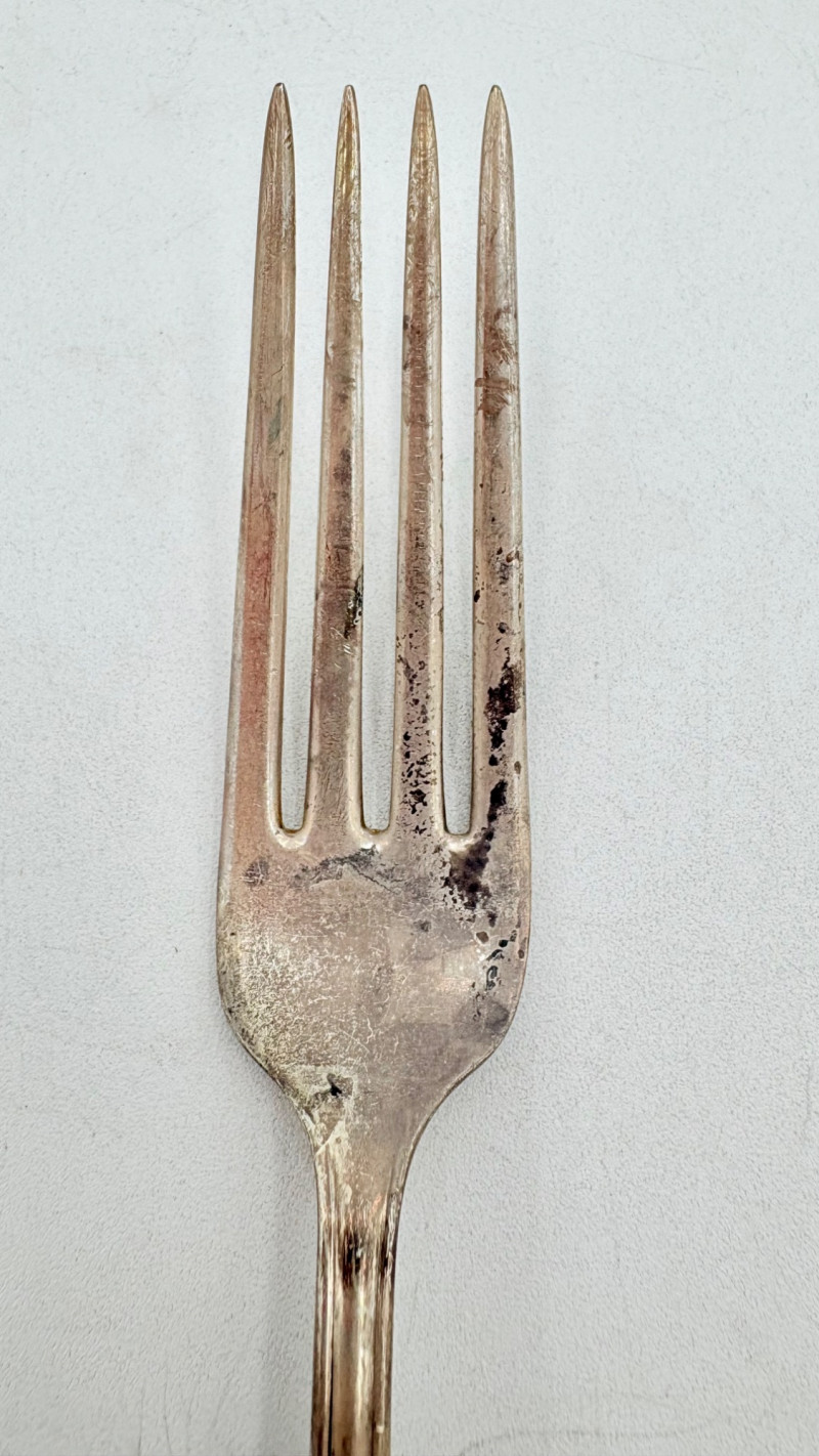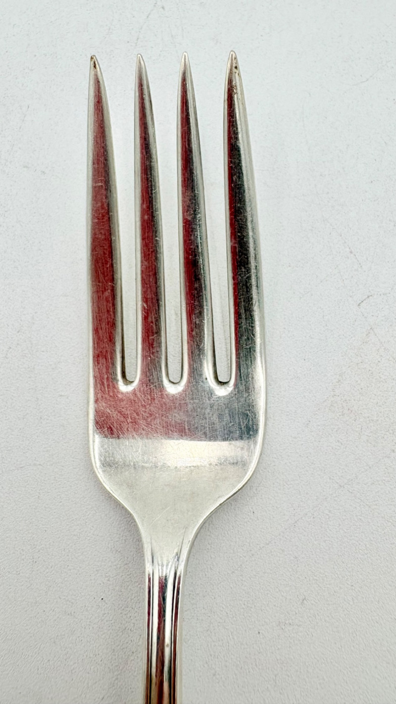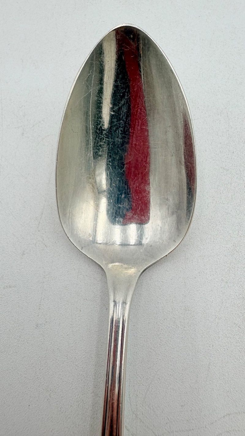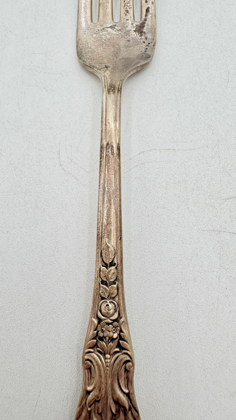 We believe this is a complete setting for 6 in Westmoreland's Milburn Rose pattern*. Marked sterling on the back (knives have stainless steel blades). Pattern was first produced in 1940 and was immensely popular due to its design that managed be intricate yet restrained at the same time. There is very little oxidation on the spoons and salad forks as they were sealed storage, but the dinner forks & knives need a good polish. Knives measure 9" Dinner forks measure 7 1/8" Salad forks measure 6 1/4" Spoons measure 6 7/8" * 2 things of note: - Tor some odd reason, one of the salad forks is not marked sterling - the area on it where the others are marked is smudged; it looks and weighs the same as the other salad forks and isn't magnet-affected. - There is one spoon that has a slight nick in the bowl part - please see last photo. We think it is a teaspoon as it is the same size as the others, but there's a slight chance it might be a jam spoon. However, client had no other serving utensils in the pattern, so we think it might have had an affair with the garbage disposal at some point and been buffed out. See last photo for comparison. Total weight not including knives (because of stainless blades): 624 grams Total weight of knives only: 387 grams