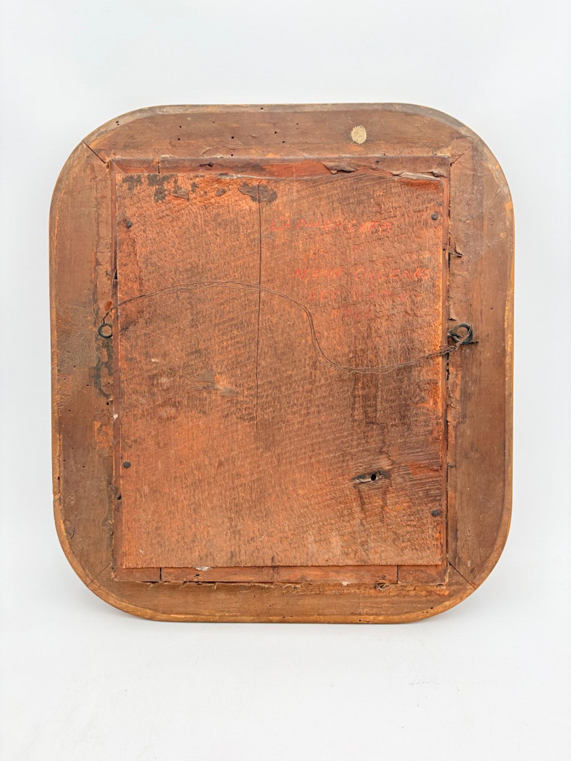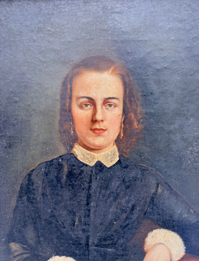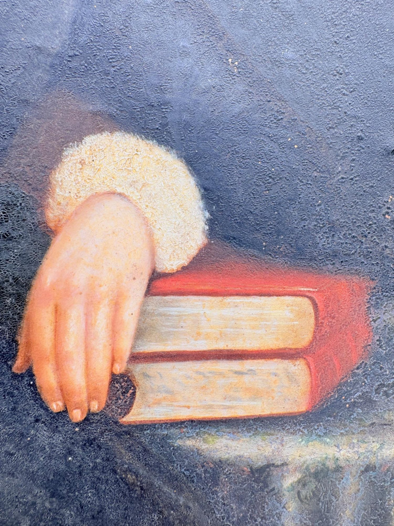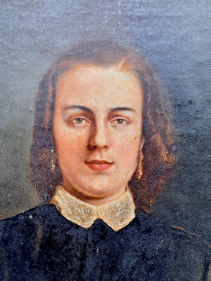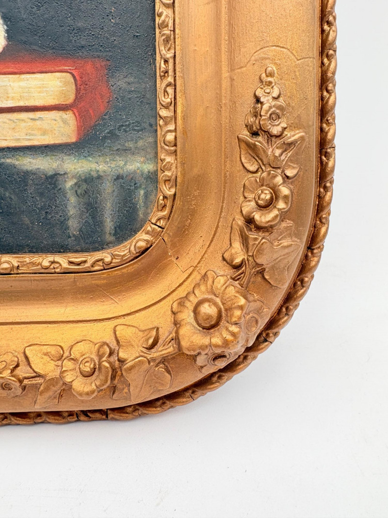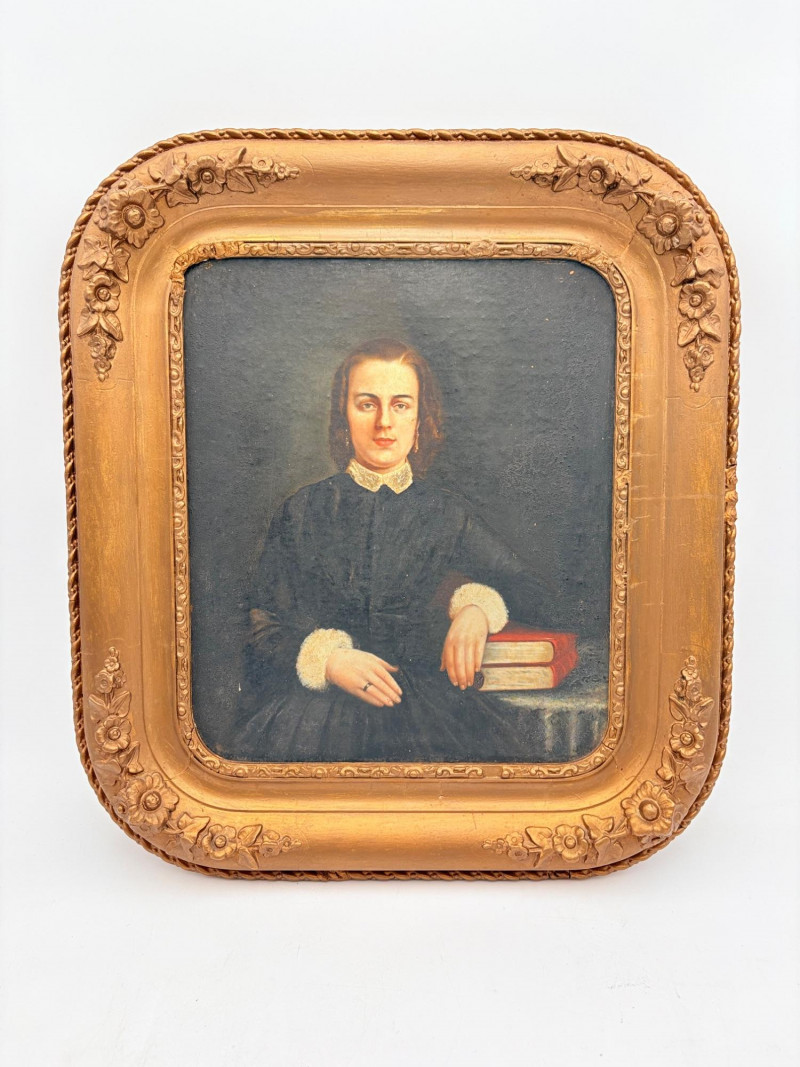 This is a truly wonderful portrait of a young woman. The rendering of her face and hands is lovely - reminds us of northern Renaissance painting when those elements were the highlights of portraiture with everyone attired in dark clothing. Lovely brushwork on cuffs and collar as well as a hint of sparkling earrings that contrast with the scholarly setting. While we don't know who the sitter is or when the portrait was done, looking at the back might offer some hints. The wood in the frame and the backing wood is obviously quite old - see photos. There is also an inscription in red pencil on the back we think says "Carmencita New Orleans Art Show 1963". However, unless this artist was an expert on aging wood and canvas, we think this is actually quite a bit older - given the style of dress, we are guessing late 1800s. Perhaps it was purchased at an art show in 1963 rather than created then? Take a look at the crackling in the close-ups. The painting is in a lovely wooden frame painted gold & embellished with flowers in relief. We think the frame has been repaired in places and repainted over the years - again, see photos. Portrait measures 17" H x 15" W x 2" D framed.