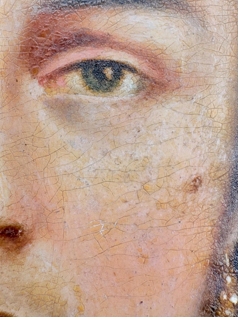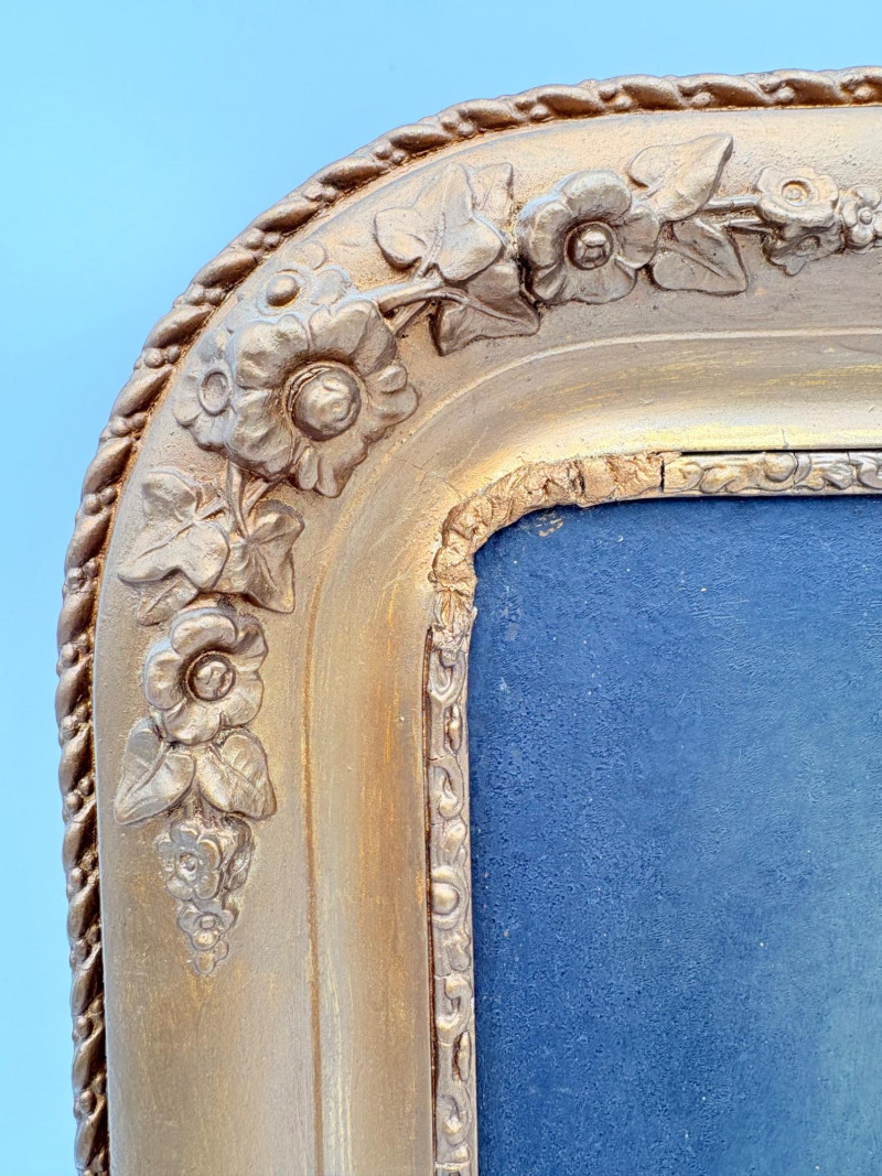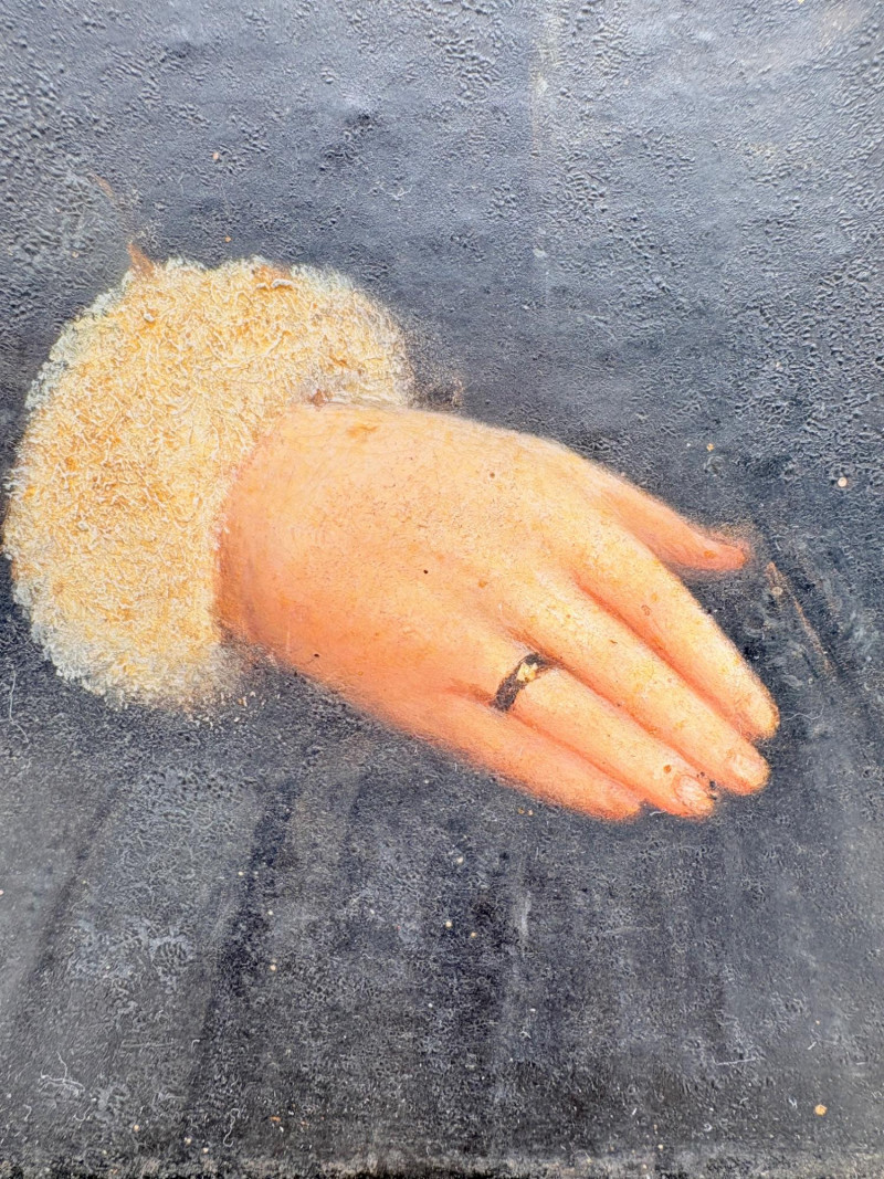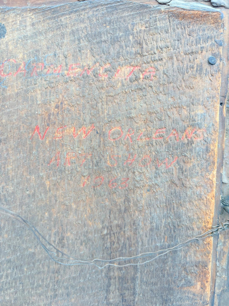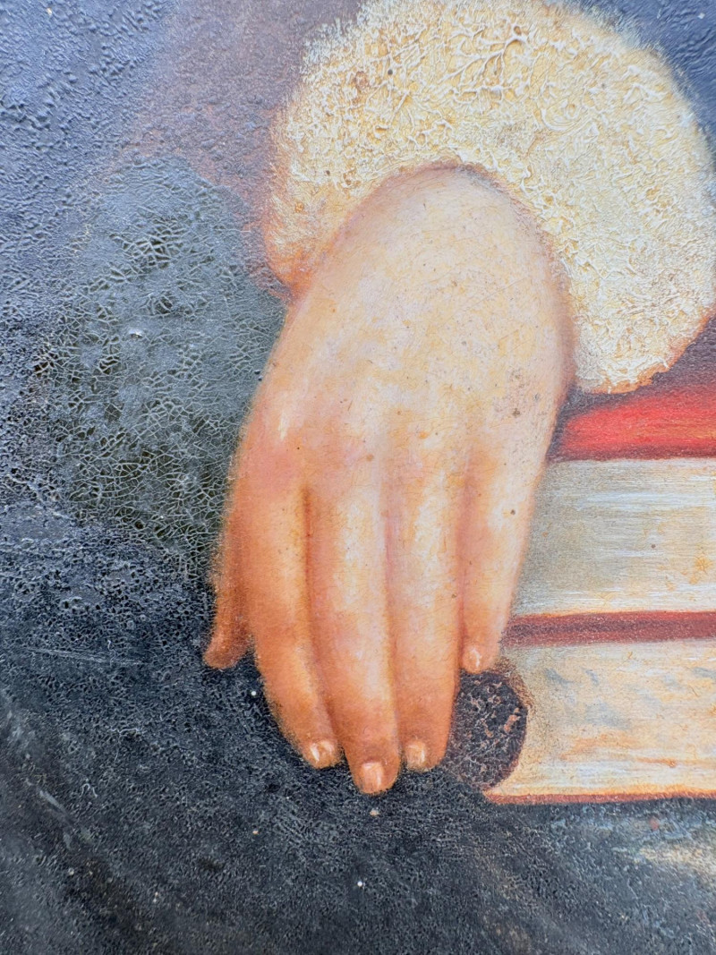 This is a truly wonderful portrait of a young woman. The rendering of her face and hands is lovely - reminds us of northern Renaissance painting when those elements were the highlights of portraiture with everyone attired in dark clothing. Lovely brushwork on cuffs and collar as well as a hint of sparkling earrings that contrast with the scholarly setting. While we don't know who the sitter is or when the portrait was done, looking at the back might offer some hints. The wood in the frame and the backing wood is obviously quite old - see photos. There is also an inscription in red pencil on the back we think says "Carmencita New Orleans Art Show 1963". However, unless this artist was an expert on aging wood and canvas, we think this is actually quite a bit older - given the style of dress, we are guessing late 1800s. Perhaps it was purchased at an art show in 1963 rather than created then? Take a look at the crackling in the close-ups. The painting is in a lovely wooden frame painted gold & embellished with flowers in relief. We think the frame has been repaired in places and repainted over the years - again, see photos. Portrait measures 17" H x 15" W x 2" D framed.