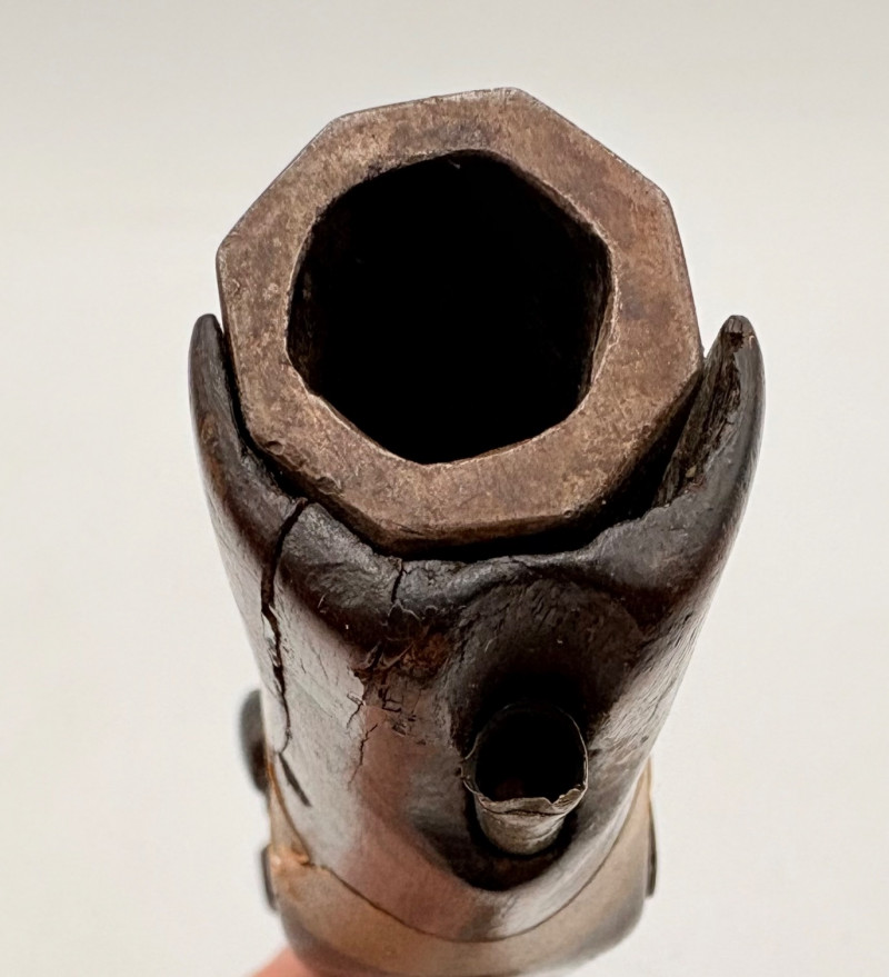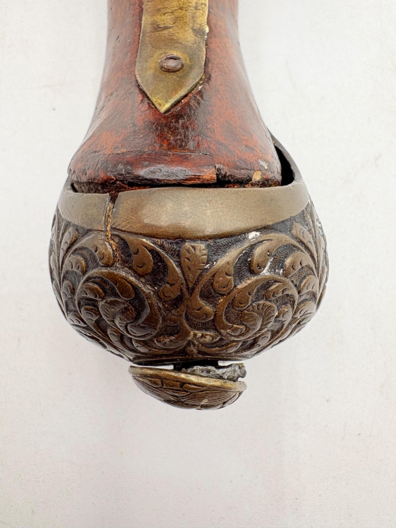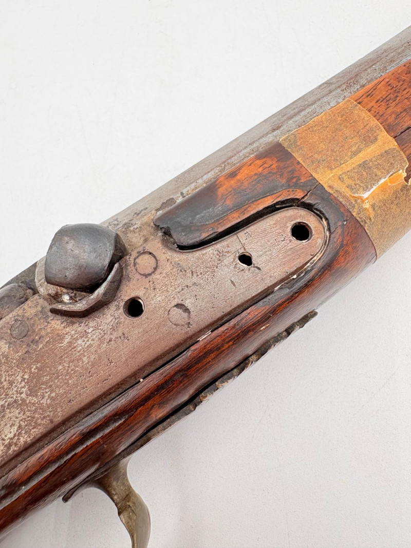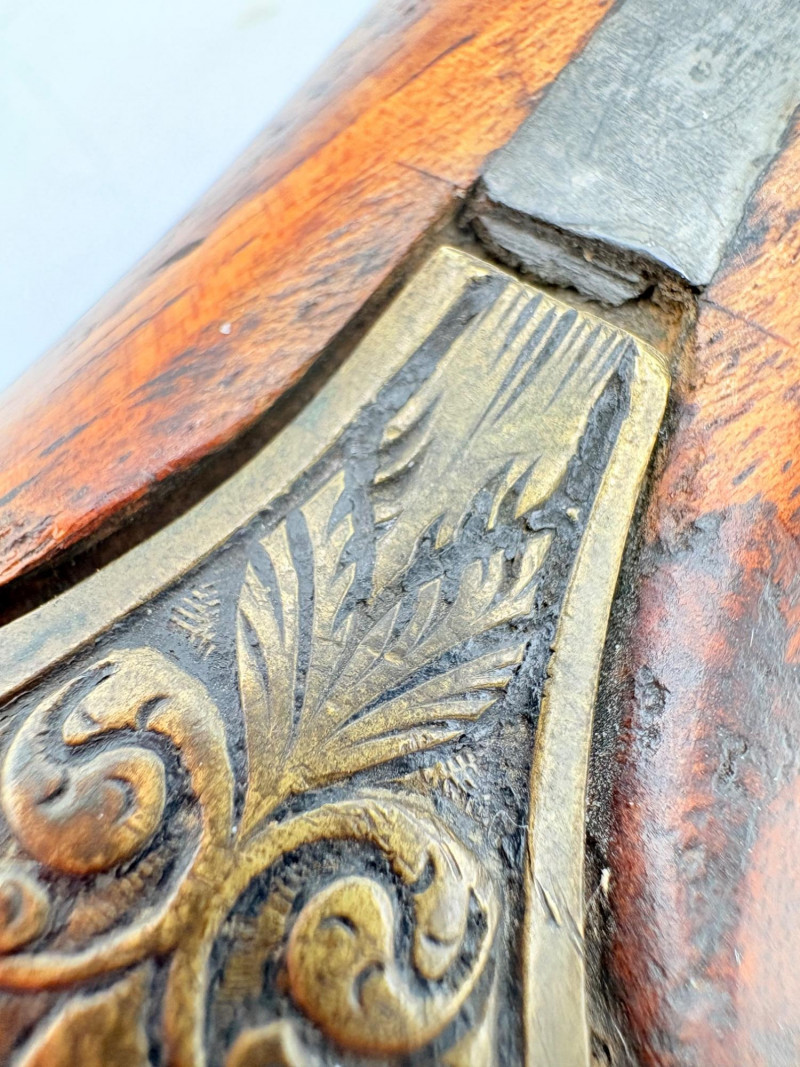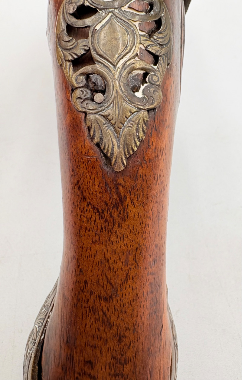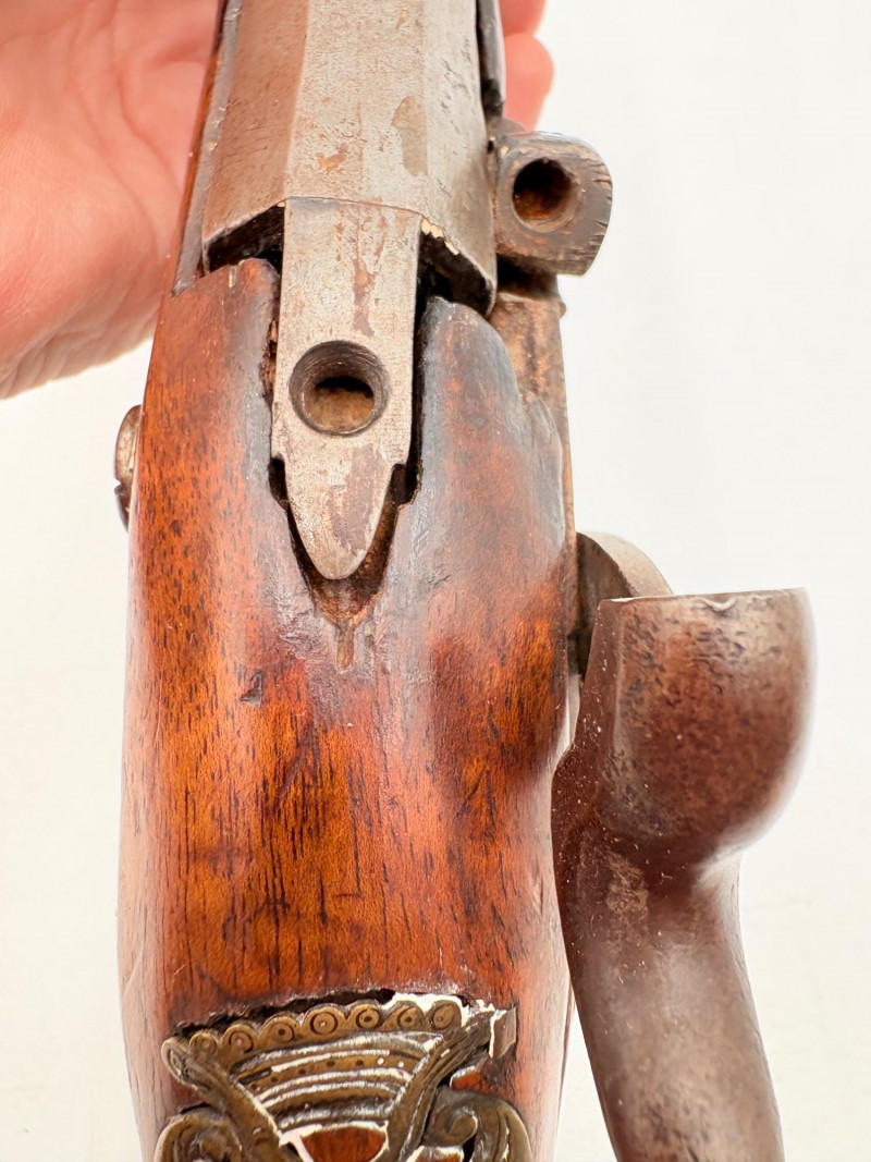 OK, right up front - we don't know much about guns and we know even less about this particular gun. We DO know it is an antique muzzleloader and from the looks of the wear on the wood, we are guessing it is quite old. We think it would look wonderful displayed on a wall in a den or in a case so it can be seen on all sides (the style makes us think of movies with gentlemen dueling over honor). it is definitely not currently operable (trigger is missing), but the gun itself is a thing of beauty and appears to have been made by hand with incised metal and lots of decorative flourishes. The intricate leaf pattern on the butt and inset metal sections speak to someone who really loved creating these kind of pieces. The wood is smooth to the touch and the gun must have been used a fair amount when it was younger given the smooth wooden surface. No maker mark detected. We noticed some masking tape on the barrel of the gun and peeled some of it away to discover that a section of the wood has a split and needs to be glued. Please take a look at the photos. We leave that to the new owner who knows what they are doing! Please give this beauty a home and the TLC it deserves. Measures 13" L.