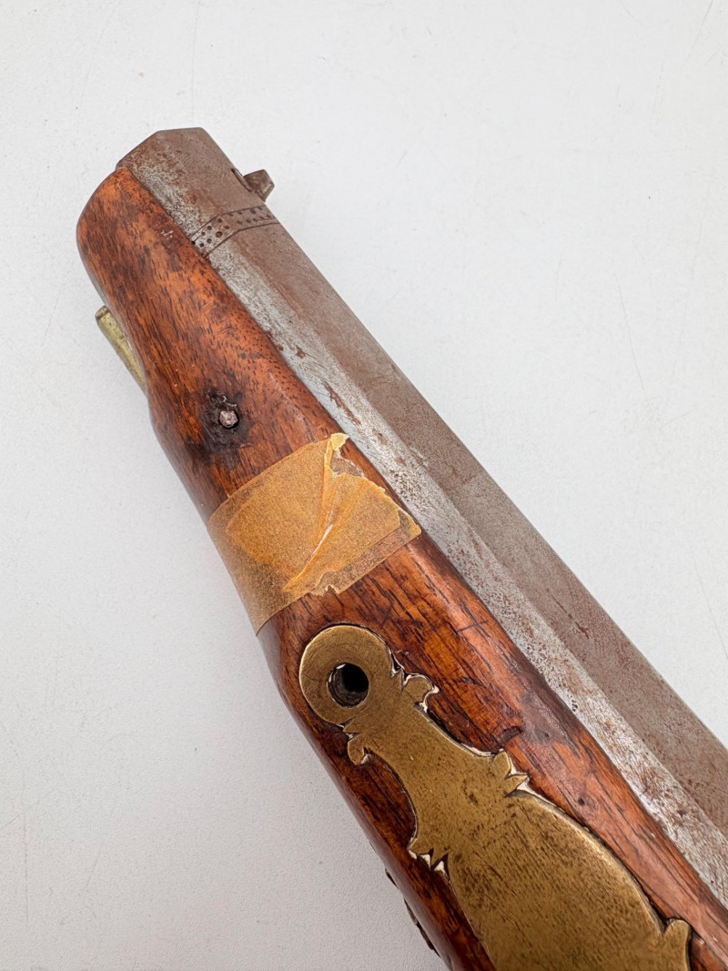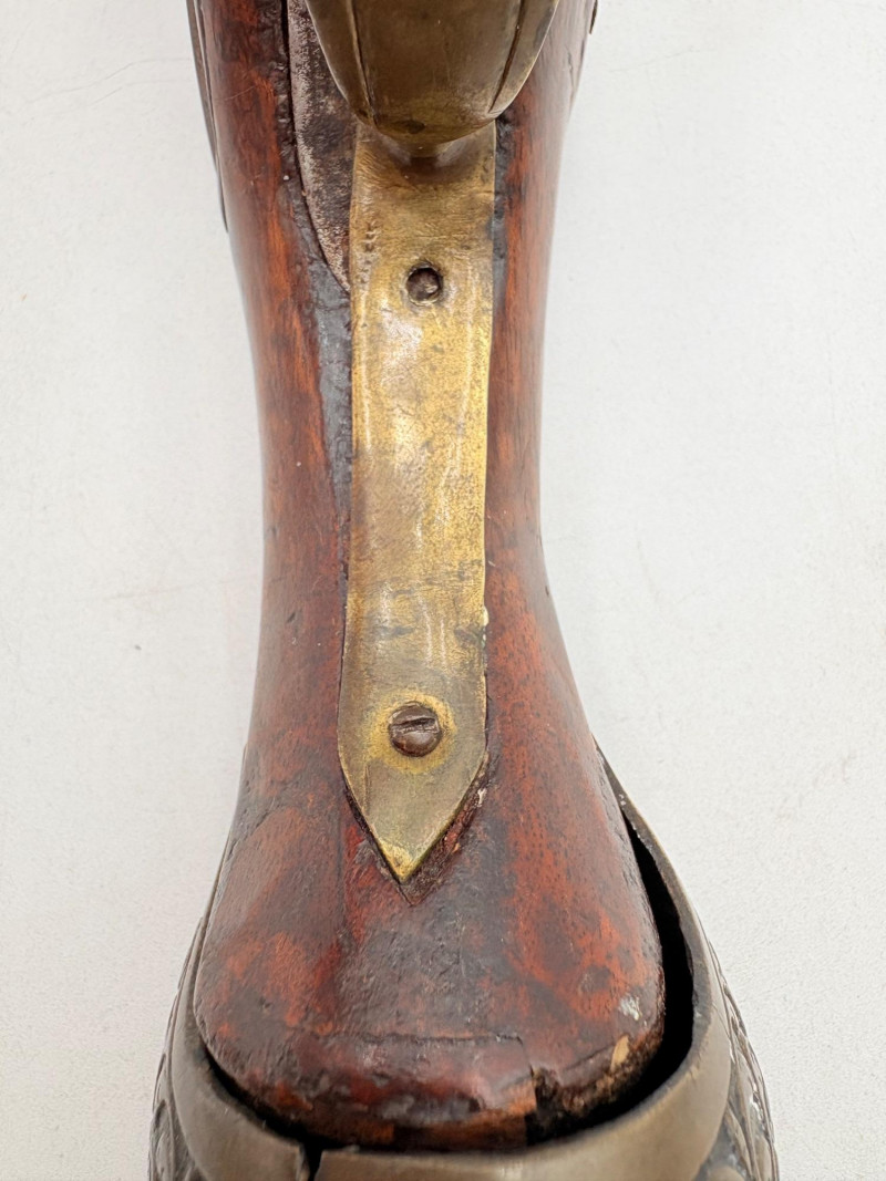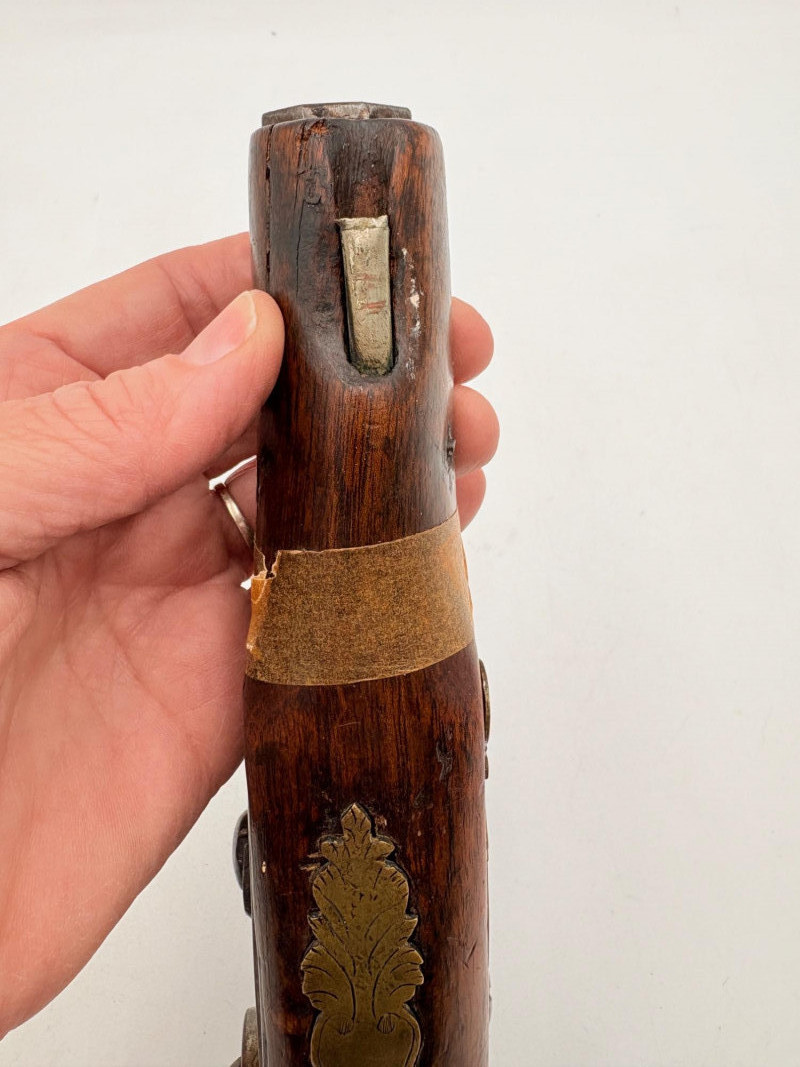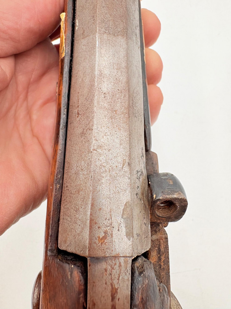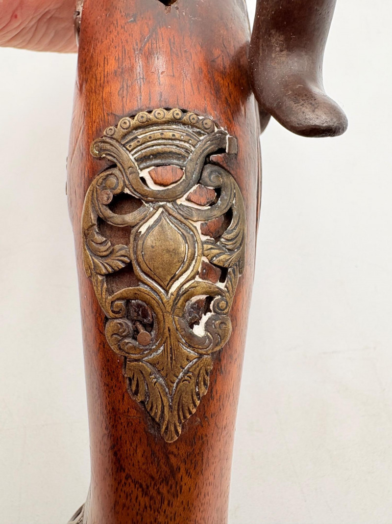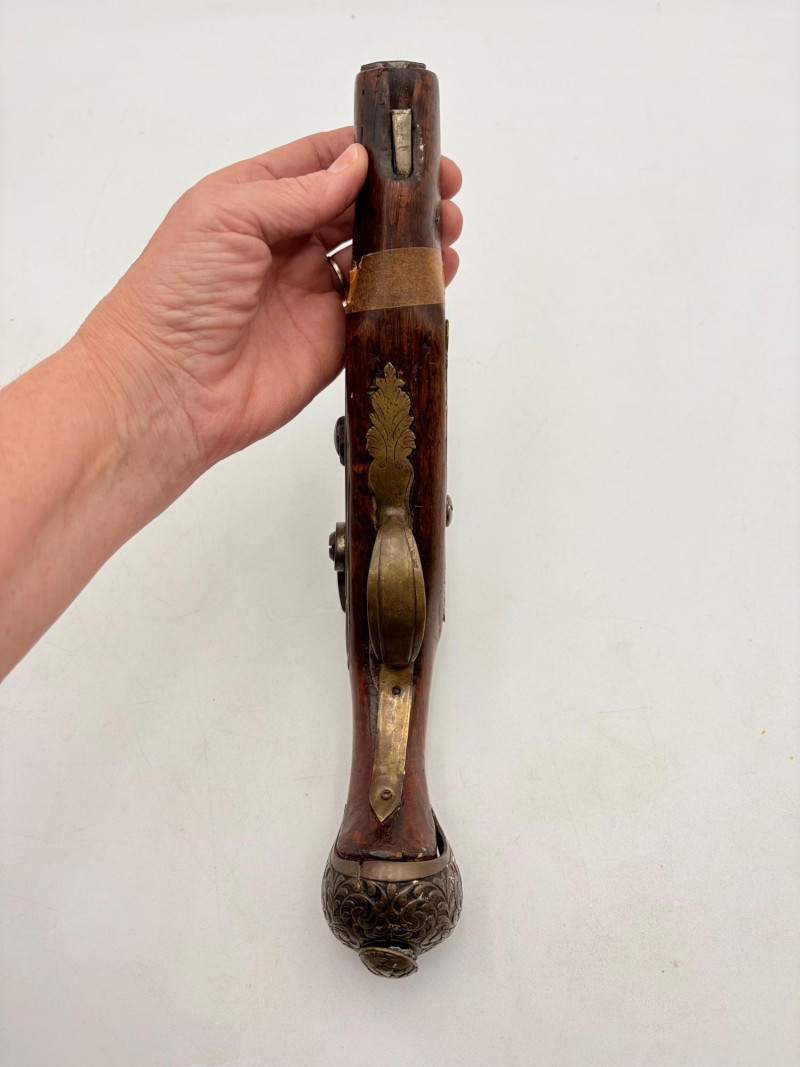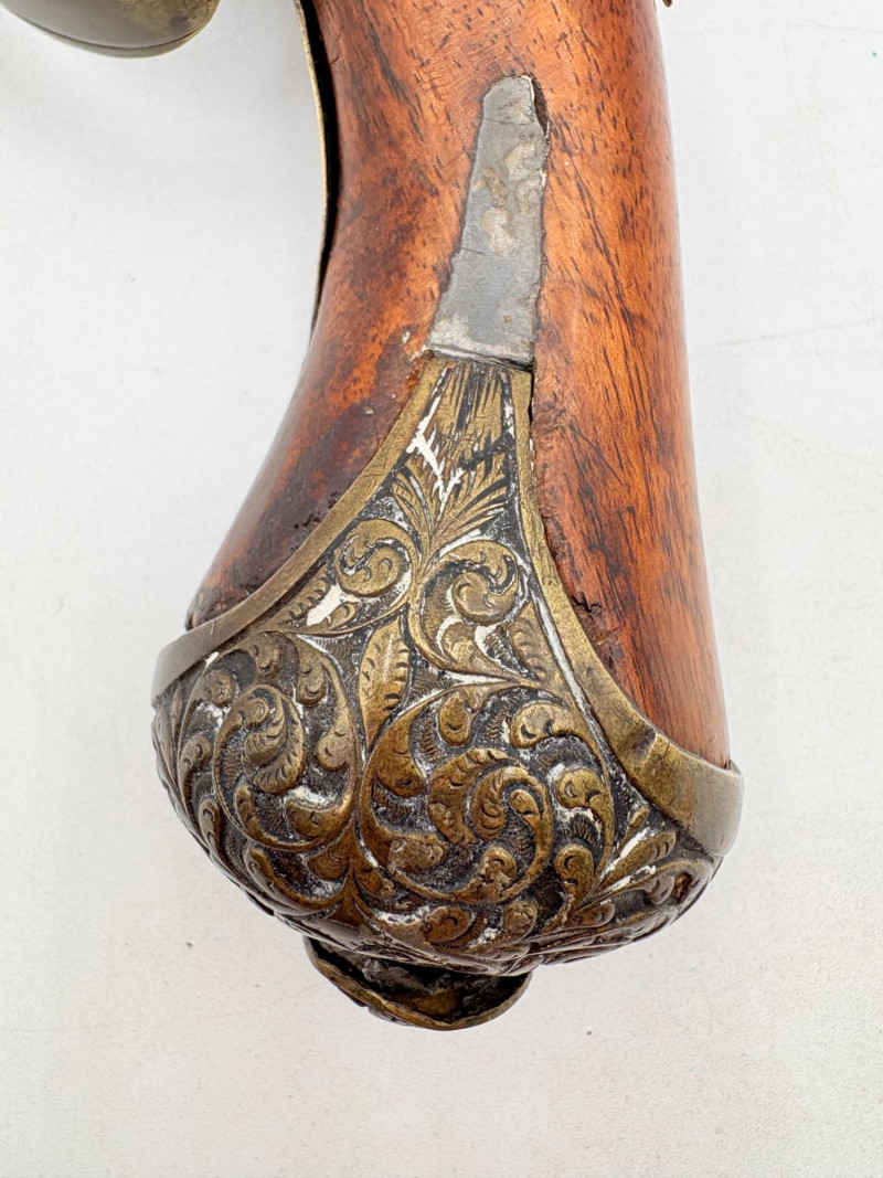OK, right up front - we don't know much about guns and we know even less about this particular gun. We DO know it is an antique muzzleloader and from the looks of the wear on the wood, we are guessing it is quite old. We think it would look wonderful displayed on a wall in a den or in a case so it can be seen on all sides (the style makes us think of movies with gentlemen dueling over honor). it is definitely not currently operable (trigger is missing), but the gun itself is a thing of beauty and appears to have been made by hand with incised metal and lots of decorative flourishes. The intricate leaf pattern on the butt and inset metal sections speak to someone who really loved creating these kind of pieces. The wood is smooth to the touch and the gun must have been used a fair amount when it was younger given the smooth wooden surface. No maker mark detected. We noticed some masking tape on the barrel of the gun and peeled some of it away to discover that a section of the wood has a split and needs to be glued. Please take a look at the photos. We leave that to the new owner who knows what they are doing! Please give this beauty a home and the TLC it deserves. Measures 13" L.