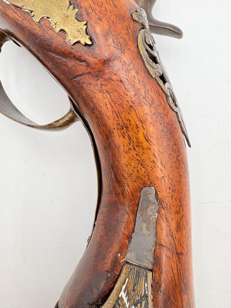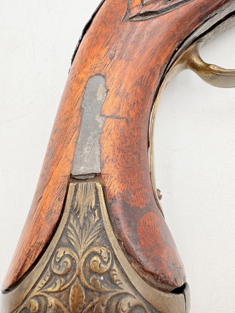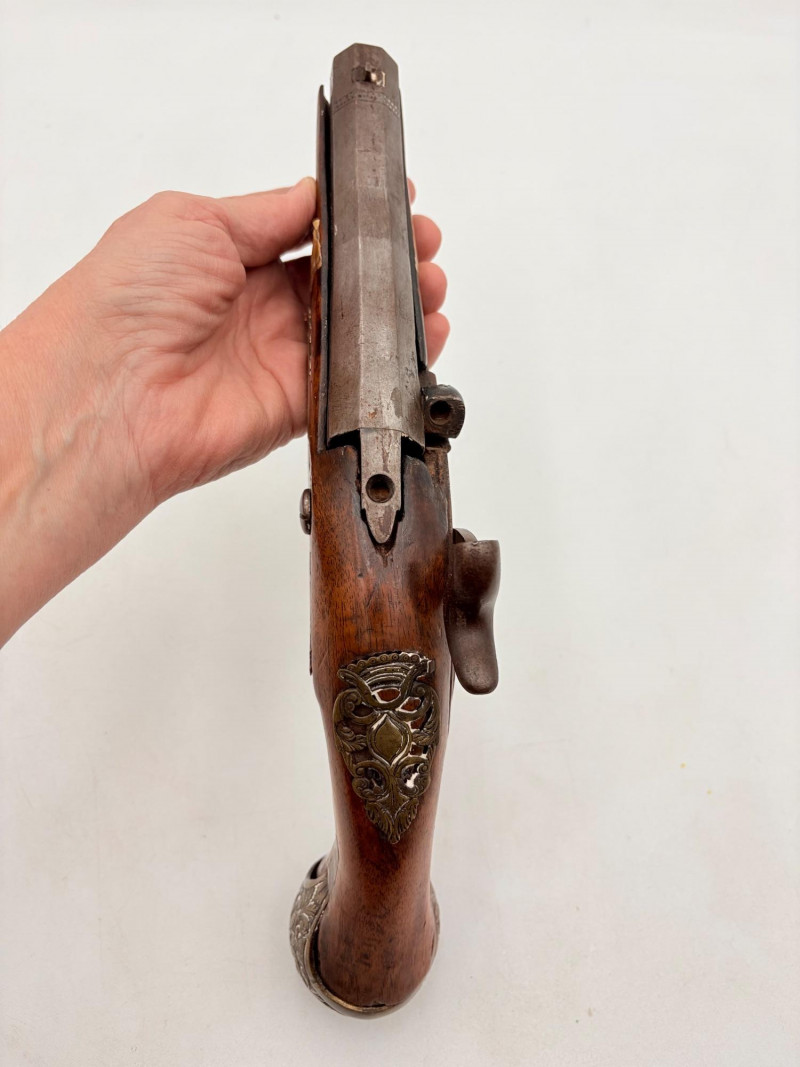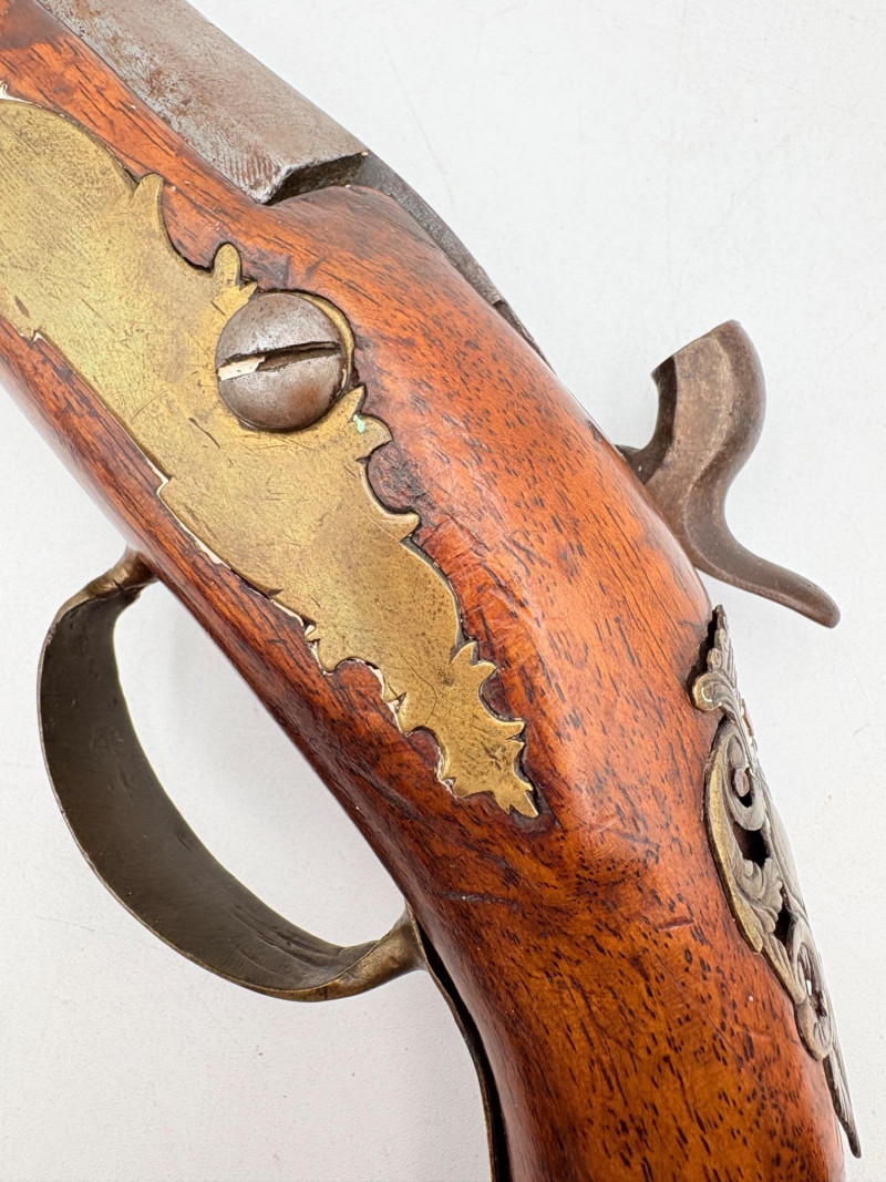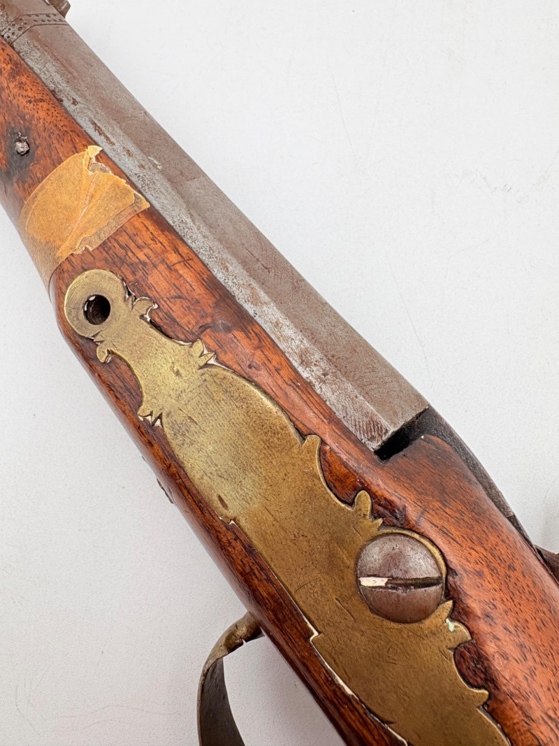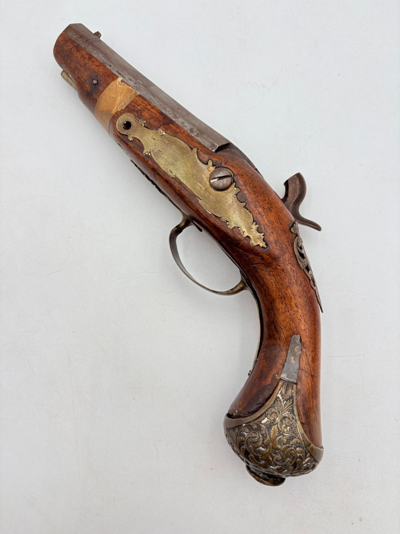OK, right up front - we don't know much about guns and we know even less about this particular gun. We DO know it is an antique muzzleloader and from the looks of the wear on the wood, we are guessing it is quite old. We think it would look wonderful displayed on a wall in a den or in a case so it can be seen on all sides (the style makes us think of movies with gentlemen dueling over honor). it is definitely not currently operable (trigger is missing), but the gun itself is a thing of beauty and appears to have been made by hand with incised metal and lots of decorative flourishes. The intricate leaf pattern on the butt and inset metal sections speak to someone who really loved creating these kind of pieces. The wood is smooth to the touch and the gun must have been used a fair amount when it was younger given the smooth wooden surface. No maker mark detected. We noticed some masking tape on the barrel of the gun and peeled some of it away to discover that a section of the wood has a split and needs to be glued. Please take a look at the photos. We leave that to the new owner who knows what they are doing! Please give this beauty a home and the TLC it deserves. Measures 13" L.