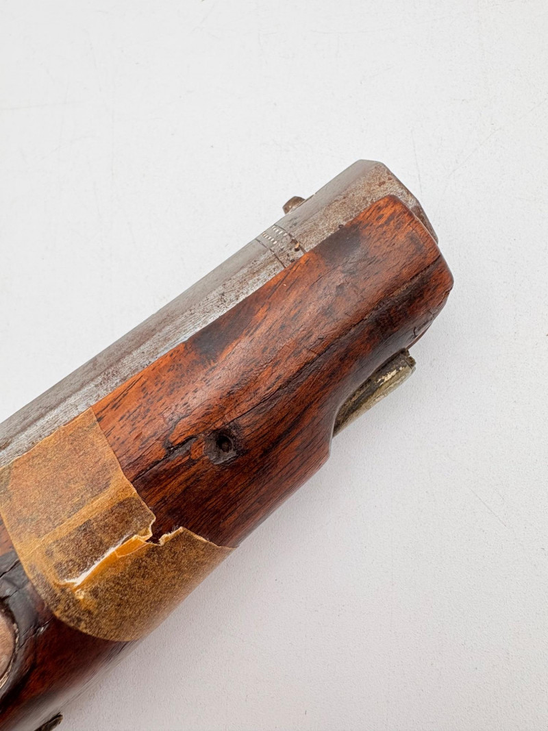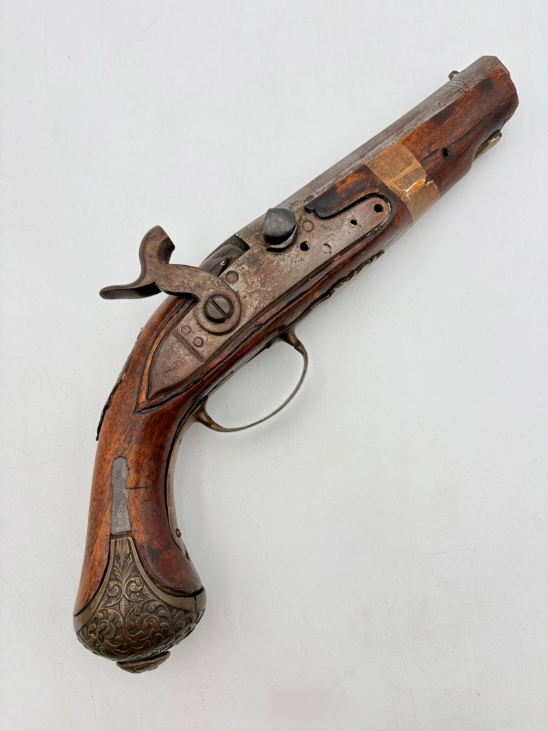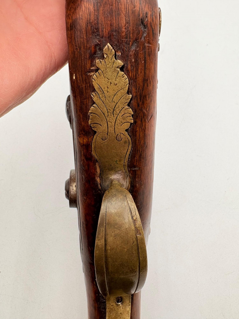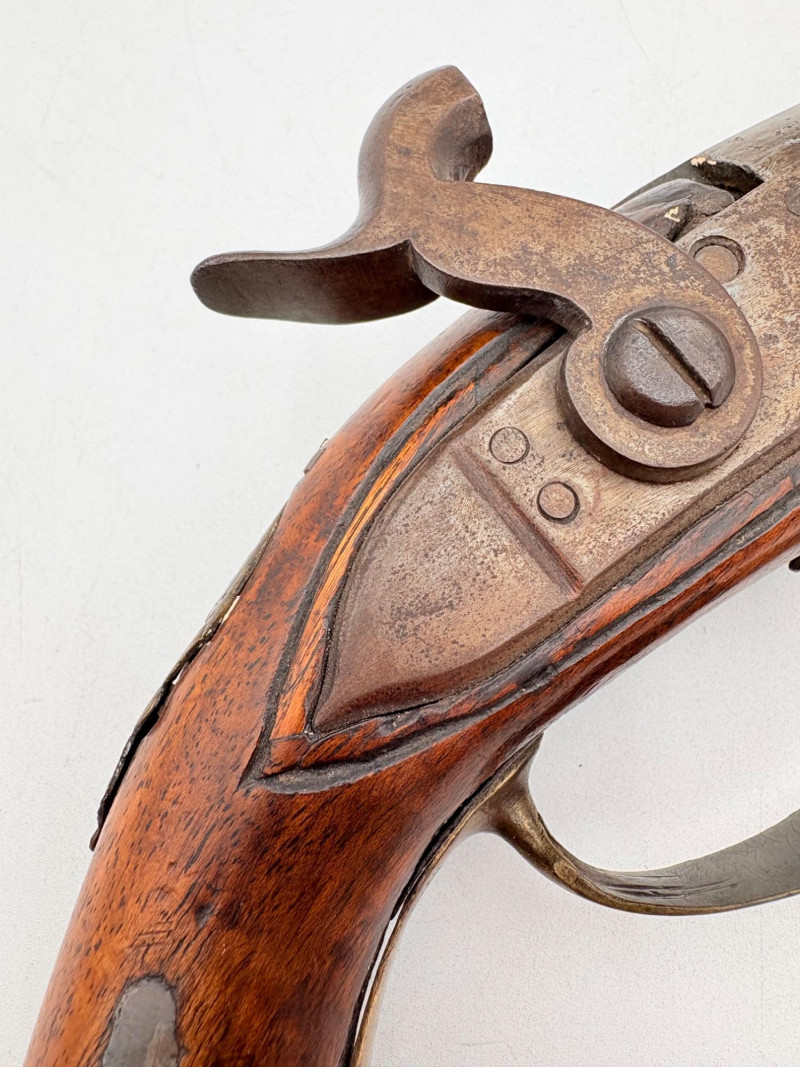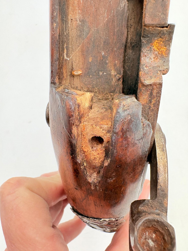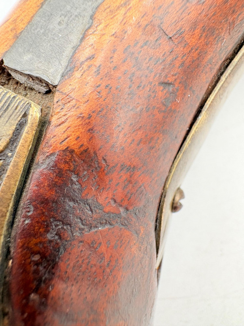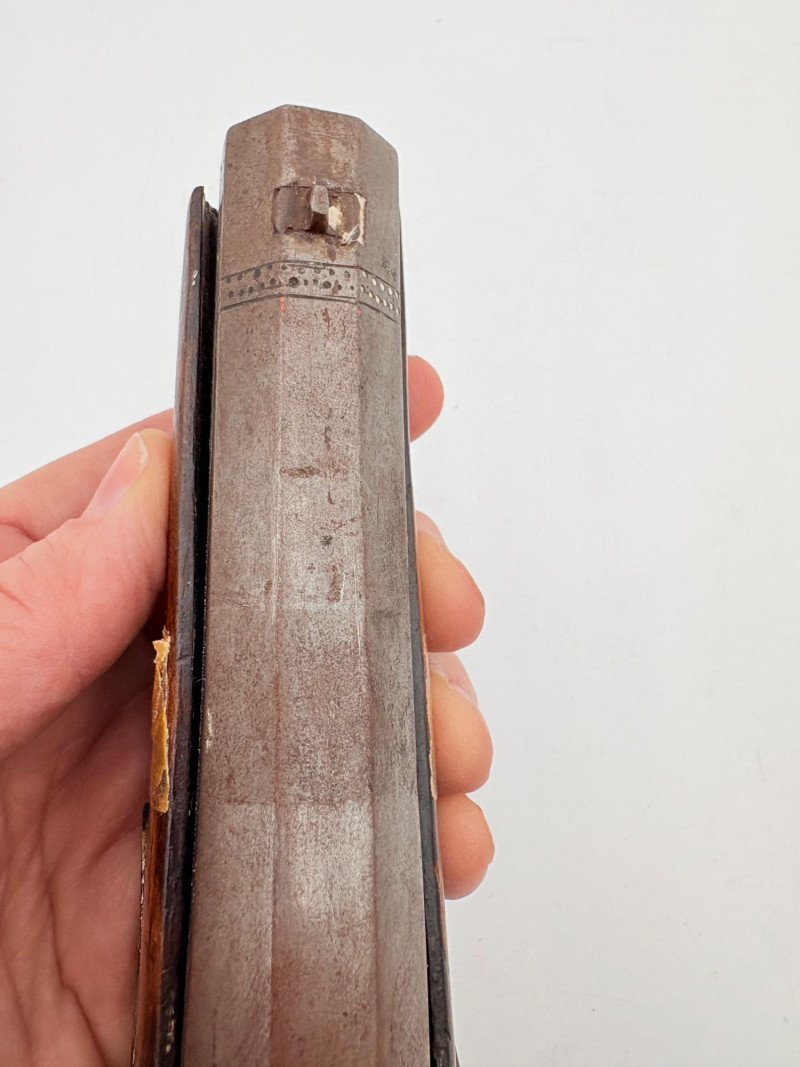 OK, right up front - we don't know much about guns and we know even less about this particular gun. We DO know it is an antique muzzleloader and from the looks of the wear on the wood, we are guessing it is quite old. We think it would look wonderful displayed on a wall in a den or in a case so it can be seen on all sides (the style makes us think of movies with gentlemen dueling over honor). it is definitely not currently operable (trigger is missing), but the gun itself is a thing of beauty and appears to have been made by hand with incised metal and lots of decorative flourishes. The intricate leaf pattern on the butt and inset metal sections speak to someone who really loved creating these kind of pieces. The wood is smooth to the touch and the gun must have been used a fair amount when it was younger given the smooth wooden surface. No maker mark detected. We noticed some masking tape on the barrel of the gun and peeled some of it away to discover that a section of the wood has a split and needs to be glued. Please take a look at the photos. We leave that to the new owner who knows what they are doing! Please give this beauty a home and the TLC it deserves. Measures 13" L.