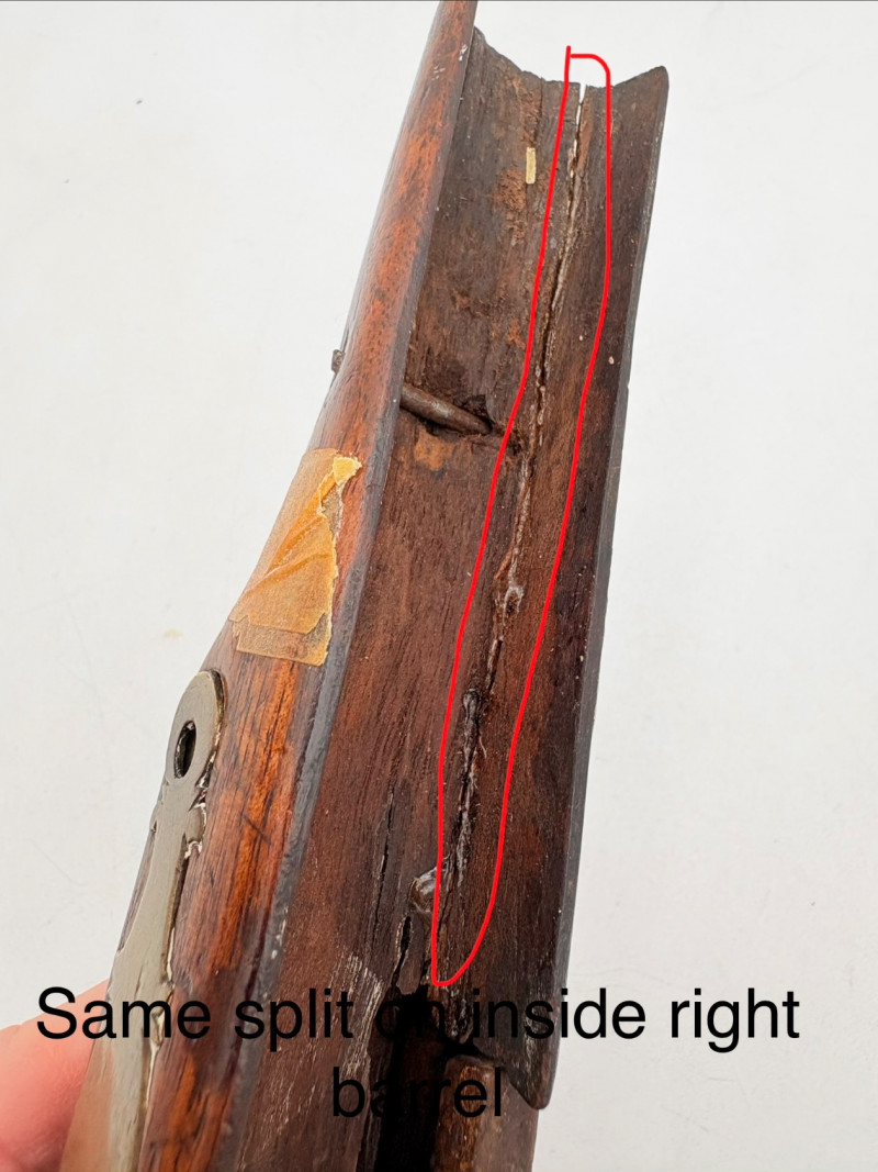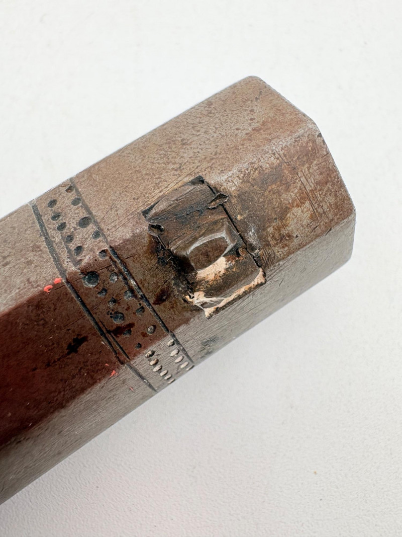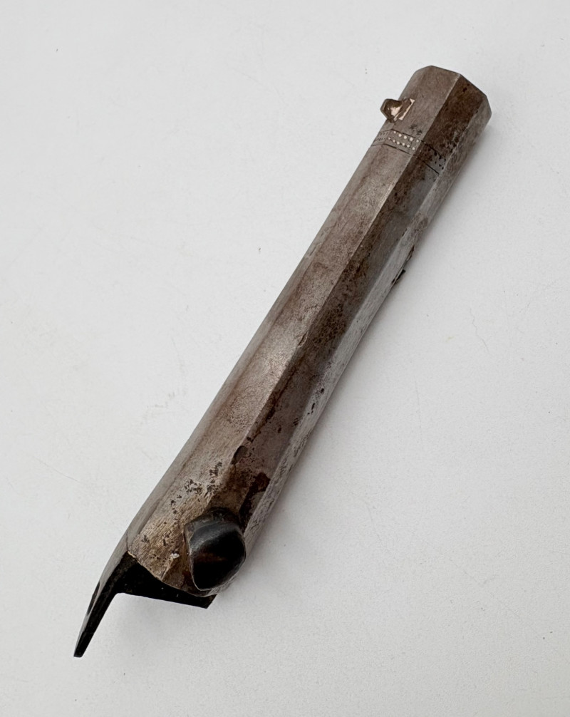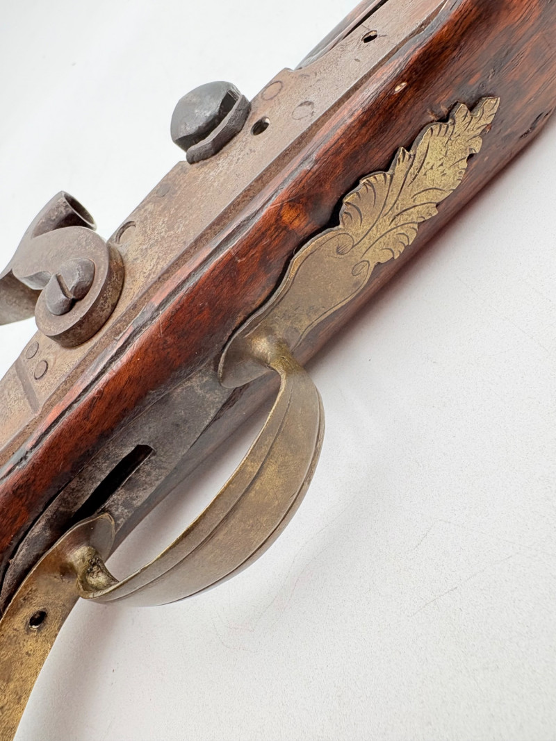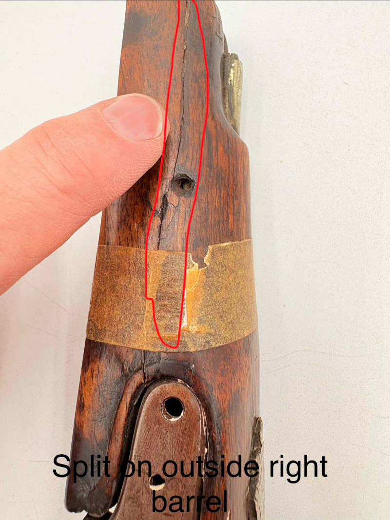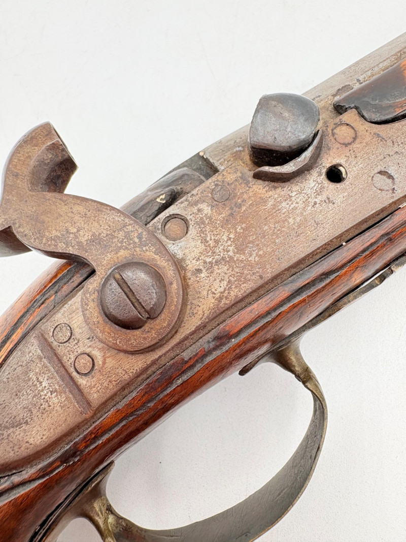 OK, right up front - we don't know much about guns and we know even less about this particular gun. We DO know it is an antique muzzleloader and from the looks of the wear on the wood, we are guessing it is quite old. We think it would look wonderful displayed on a wall in a den or in a case so it can be seen on all sides (the style makes us think of movies with gentlemen dueling over honor). it is definitely not currently operable (trigger is missing), but the gun itself is a thing of beauty and appears to have been made by hand with incised metal and lots of decorative flourishes. The intricate leaf pattern on the butt and inset metal sections speak to someone who really loved creating these kind of pieces. The wood is smooth to the touch and the gun must have been used a fair amount when it was younger given the smooth wooden surface. No maker mark detected. We noticed some masking tape on the barrel of the gun and peeled some of it away to discover that a section of the wood has a split and needs to be glued. Please take a look at the photos. We leave that to the new owner who knows what they are doing! Please give this beauty a home and the TLC it deserves. Measures 13" L.
