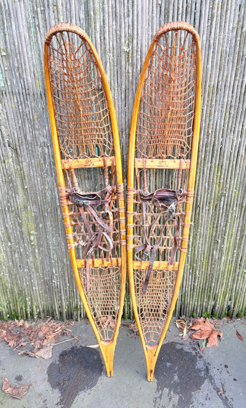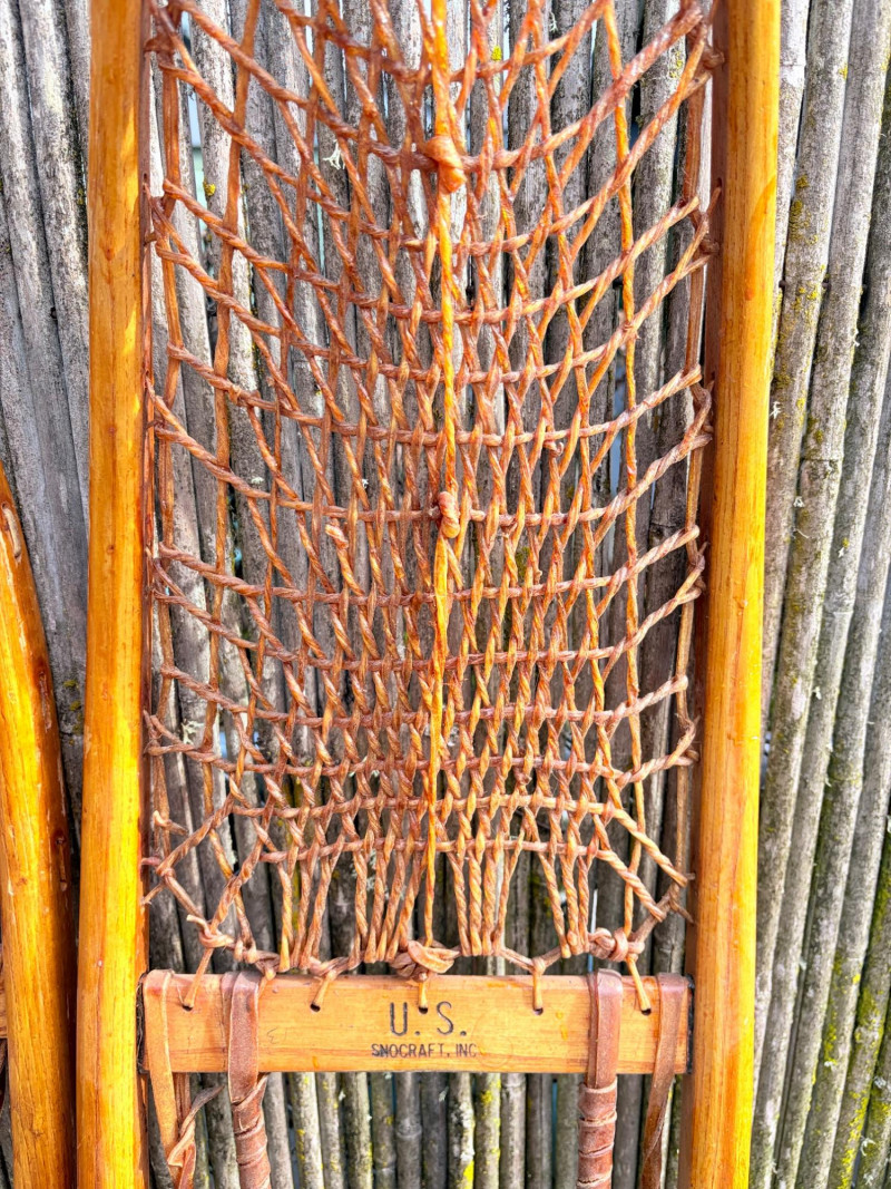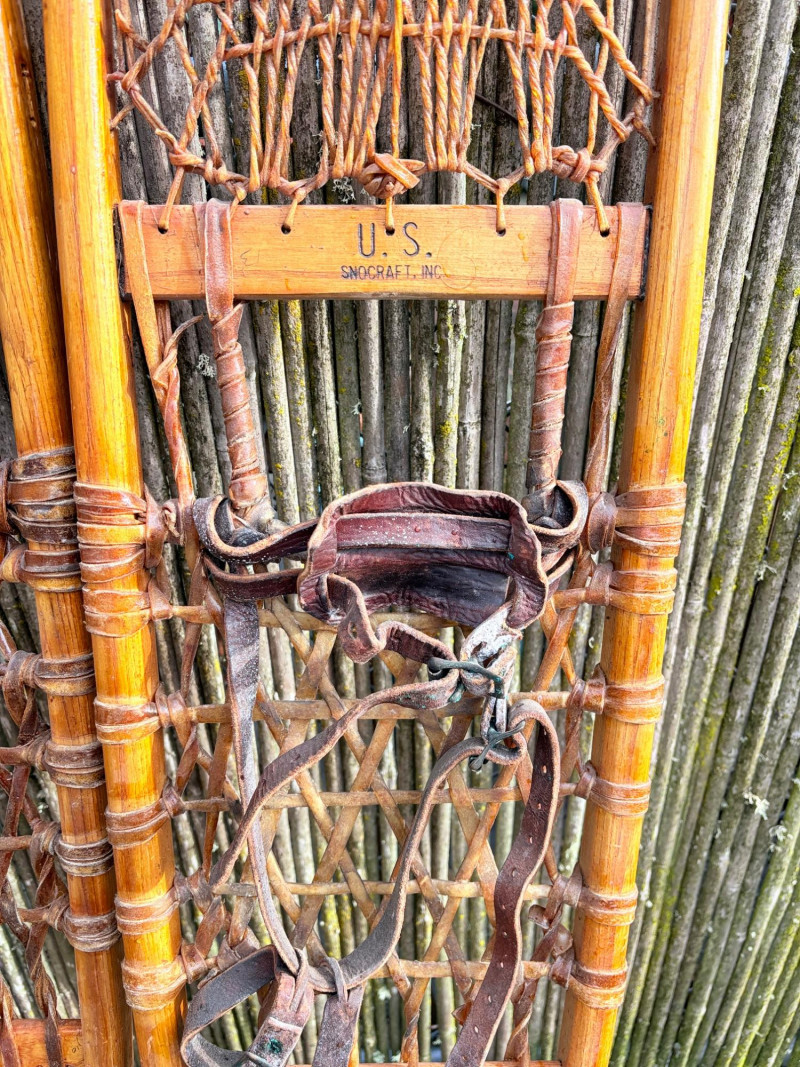Imagine these on your wall at the cabin! Great antique snowshoes from U.S. Snocraft; we believe they are from 1954. Amazing workmanship in these with bentwood frame, rawhide weaving, and leather straps. They measure 53" L x 8" W and are in beautiful shape with the exception of the leather foot bindings which are a little bedraggled. NOTE; we have 3 pairs of these beauties - enough to do a whole wall of your retreat. See lots #58 & #137 for more.