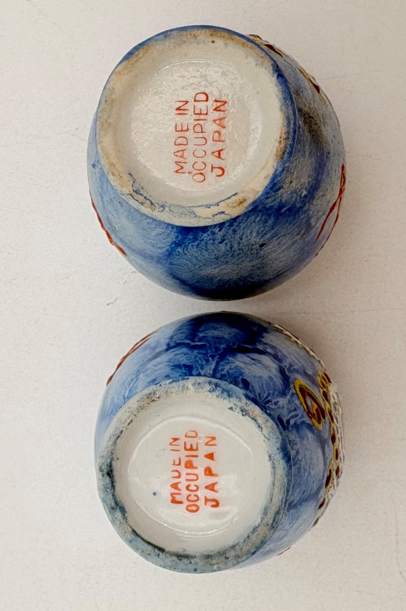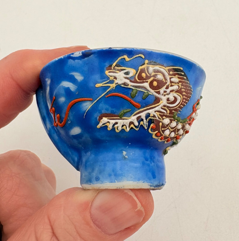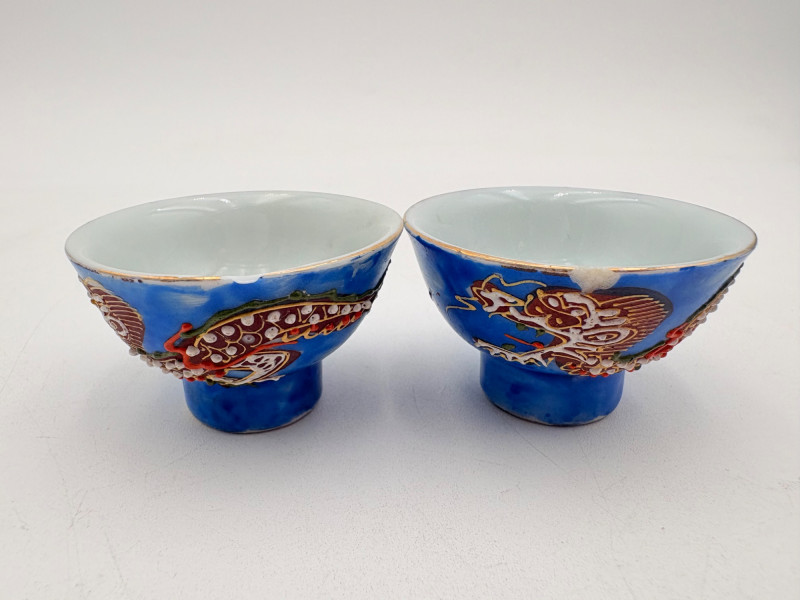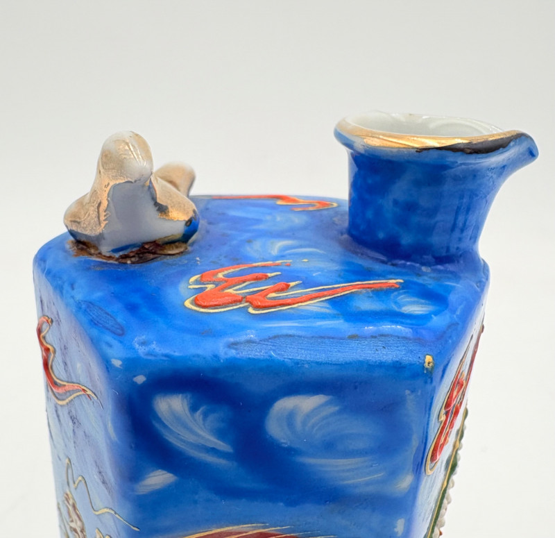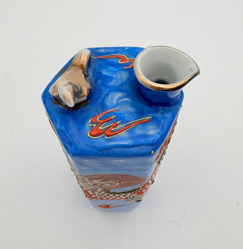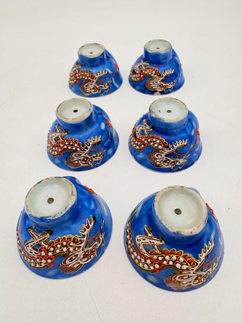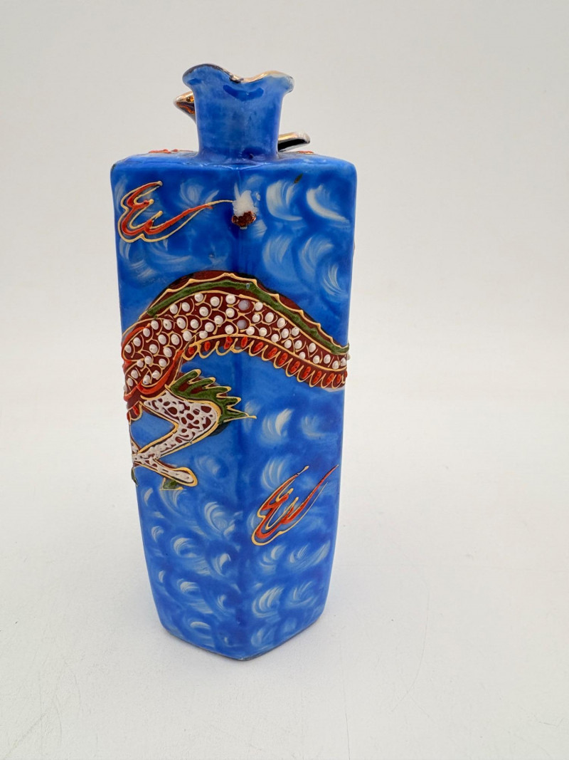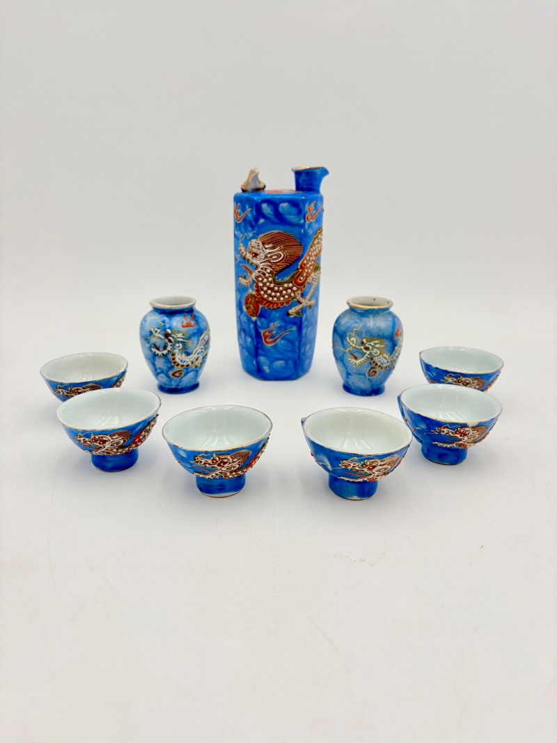 Japanese moriage porcelain sake bottle & cup set with "whistling bird.". Moriage glazing technique results in 3-D texture on the pieces and this set is in the traditional blue with swirl background. Dragons with dotted white scales decorate both the cups and decanter. Shows cosmetic wear on decanter on the gold bird and directly below pour spout. Cups show wear commensurate with age - note that 2 of them have small chips - see last photo. Made in Japan, but we are unsure of manufacturer. Lot includes: - 1 sake decanter (6" H) - 6 sake cups (2" W) - 2 small vintage mini-ginger jar pieces in the same traditional style and colorway from a different manufacturer. They measure 2.5" H and were made in Occupied Japan.