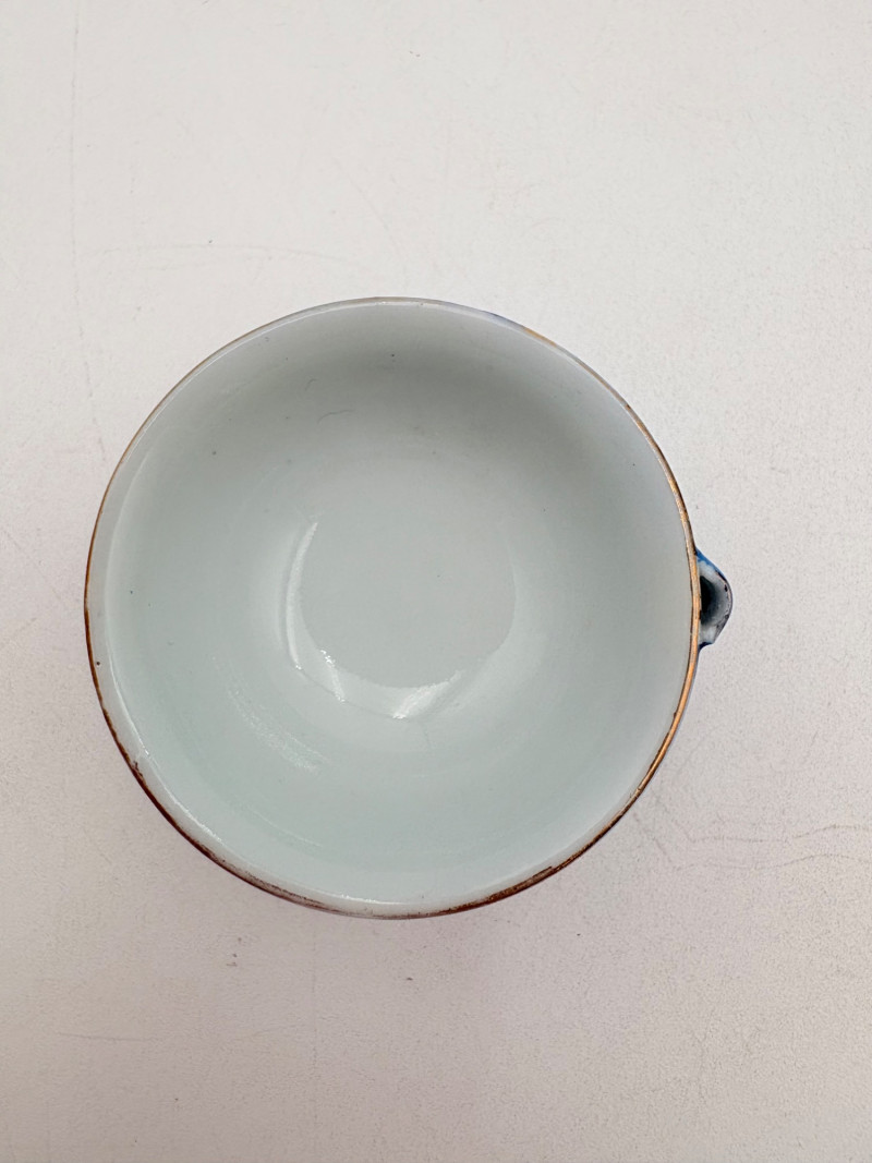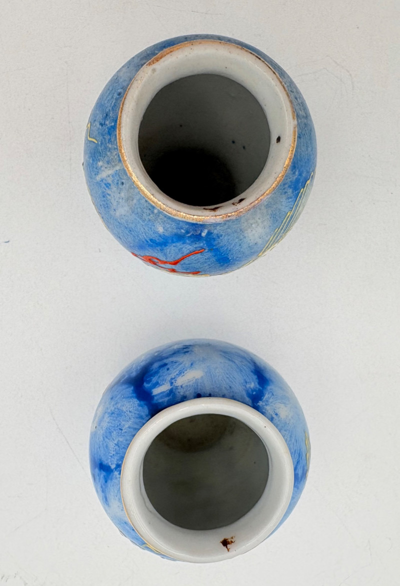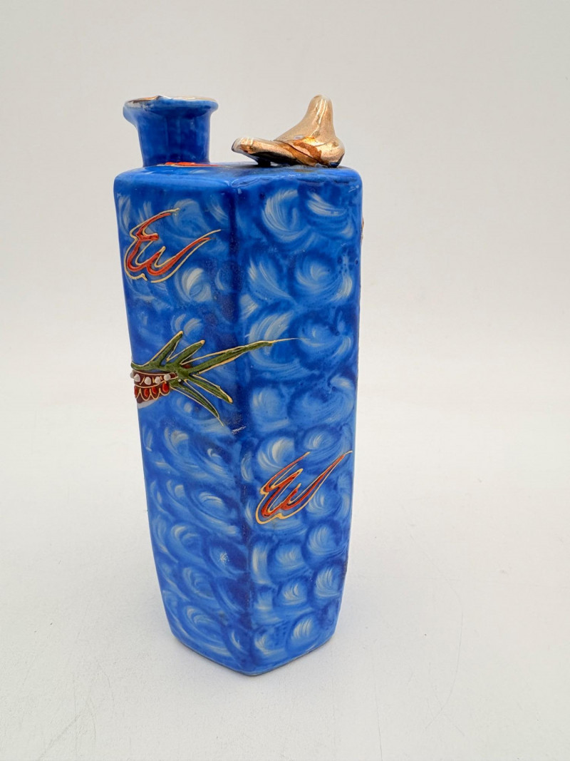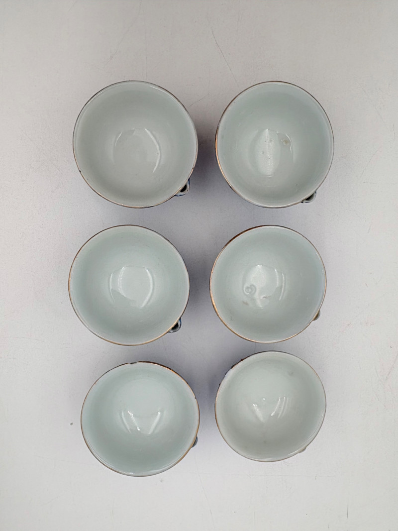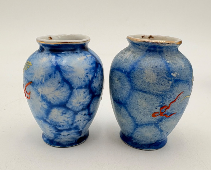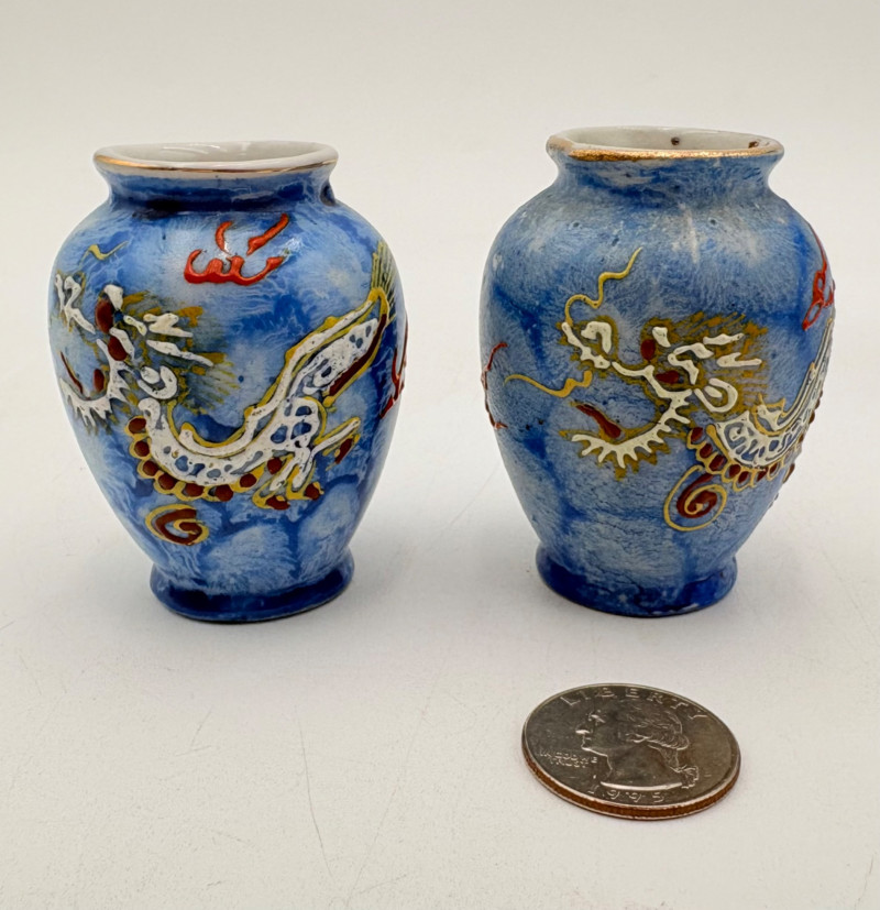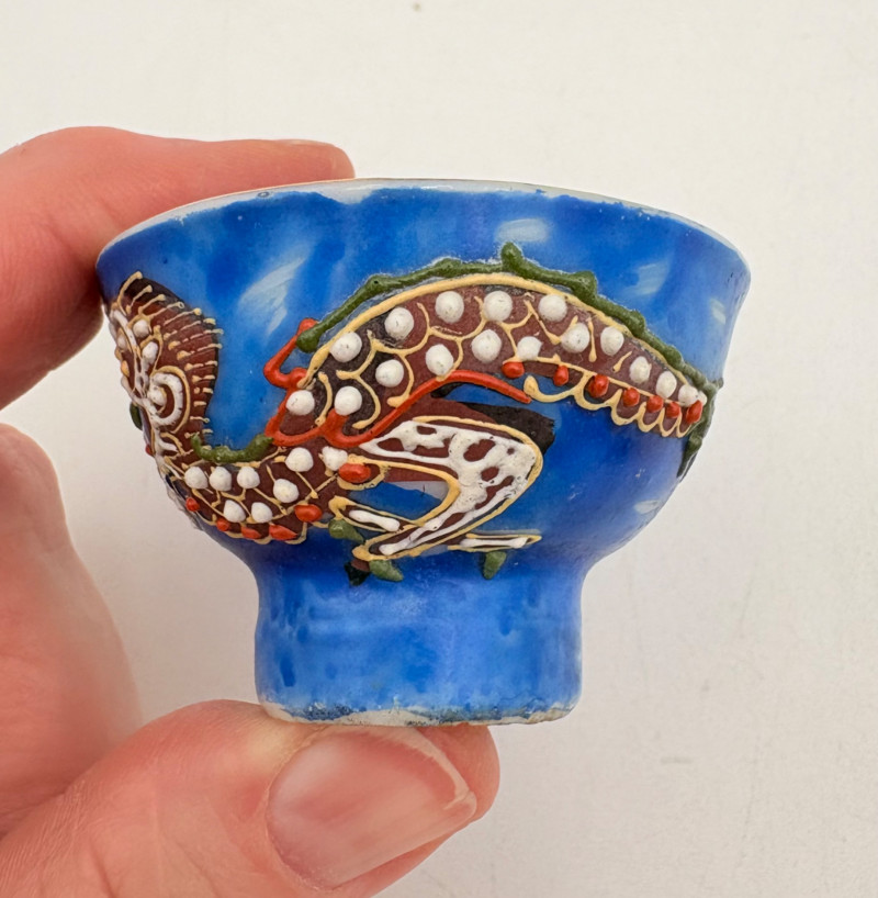 Japanese moriage porcelain sake bottle & cup set with "whistling bird.". Moriage glazing technique results in 3-D texture on the pieces and this set is in the traditional blue with swirl background. Dragons with dotted white scales decorate both the cups and decanter. Shows cosmetic wear on decanter on the gold bird and directly below pour spout. Cups show wear commensurate with age - note that 2 of them have small chips - see last photo. Made in Japan, but we are unsure of manufacturer. Lot includes: - 1 sake decanter (6" H) - 6 sake cups (2" W) - 2 small vintage mini-ginger jar pieces in the same traditional style and colorway from a different manufacturer. They measure 2.5" H and were made in Occupied Japan.