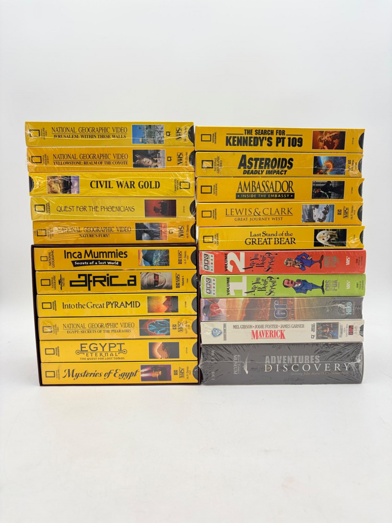 Have a remote cabin off the grid with no internet? Or maybe you want to OWN a copy of a program you pay for rather than lose it when you cancel your streaming service? Then this lot is for you! Lot includes a multitude of VHS tapes - most of them new - and a player for them, too! Experience great old-school technology (but remember the "be kind, rewind" phrase). Panasonic VHS Plus player powers on & appears to be in good shape (we didn't actually test it as our TV is built into the wall). LOTS of VHS tapes - all the ones in the second & third to last photos are unused still in their original shrink-wrap. There are some great movies in here in-between your educational stints with Nat Geo! BONUS: After doing photographs, we came across a power rewind machine - we tested it and it works, so you will receive that too! See last photo.