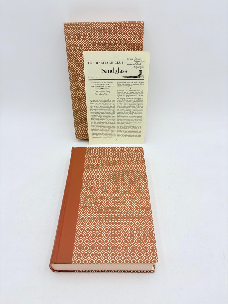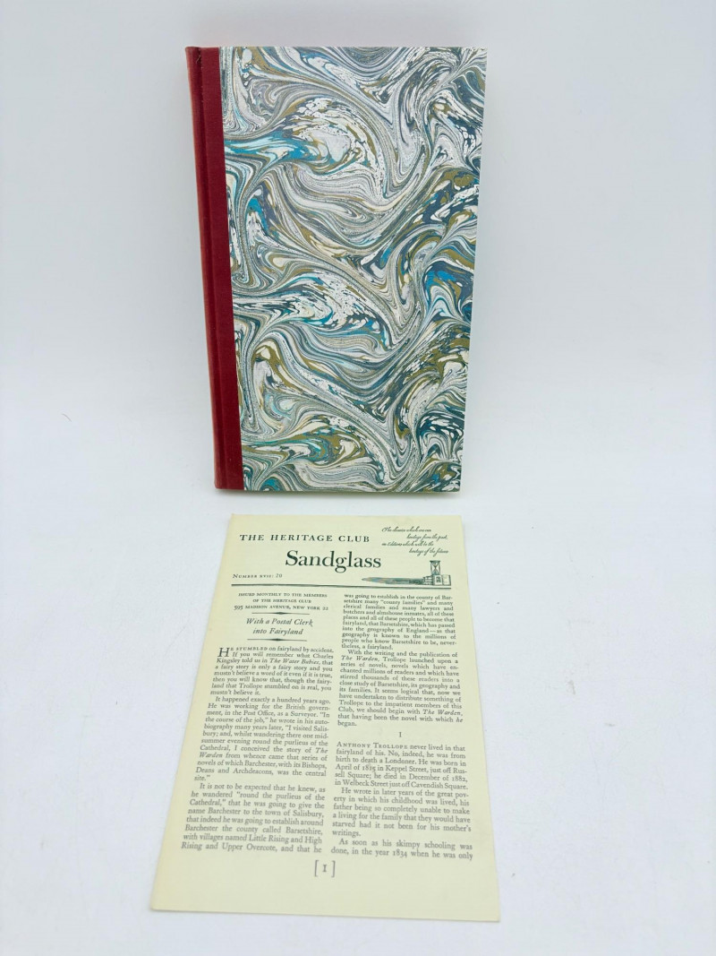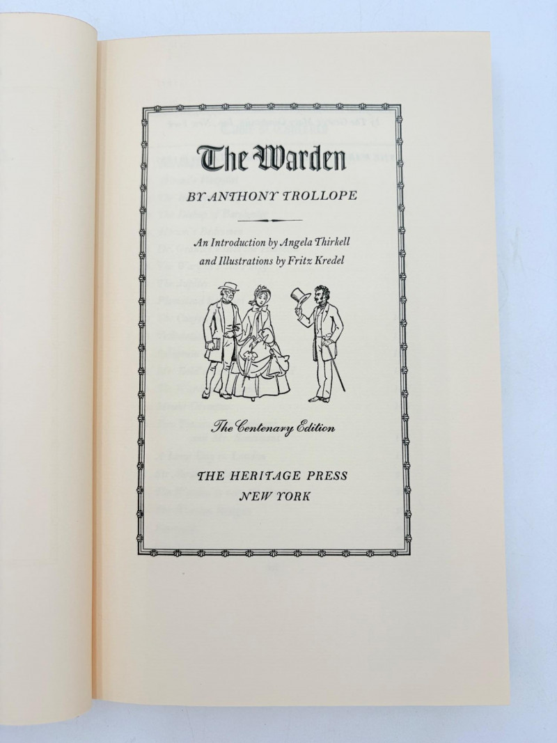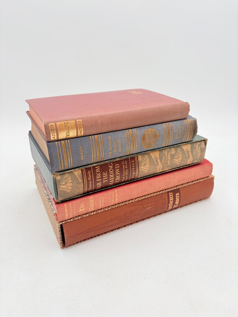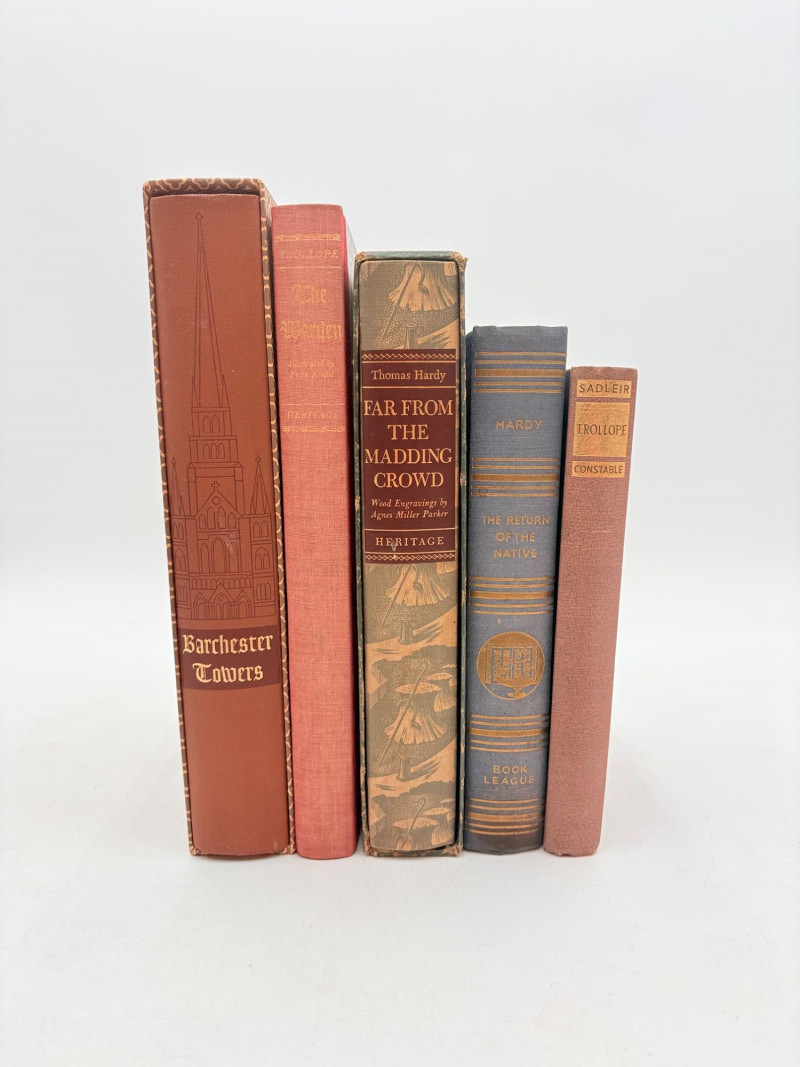 Some lesser known writing from some well-known writers! Trollope - A Commentary (Michael Sadleir) 1947. Constable & Co, London. 435 p. Writing in text. The Return of the Native (Thomas Hardy) 1937. American Book League, New York. 470 p. Owner's name on inside cover. Far from the Maddening Crowd (Thomas Hardy) 1958. Heritage Press, New York. 400 p. Owner's' name on inside cover. The Warden (Anthony Trollope) 1955. Heritage Press, New York. 262 p. Owner's name on inside cover. Barchester Towers (Anthony Trollope) 1958. Heritage Press, New York. 564 p. Heritage Press existed from 1937 - 1982. They published almost exclusively classics in literature and history. Their publications were known for terrific illustrations, quality materials, and elegant covers that were lovely without being overly precious.