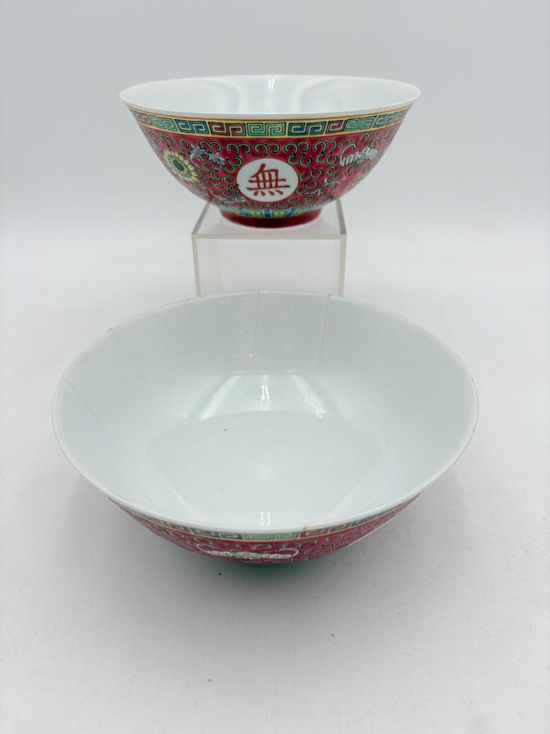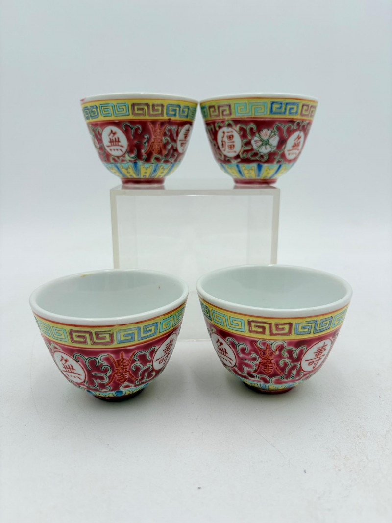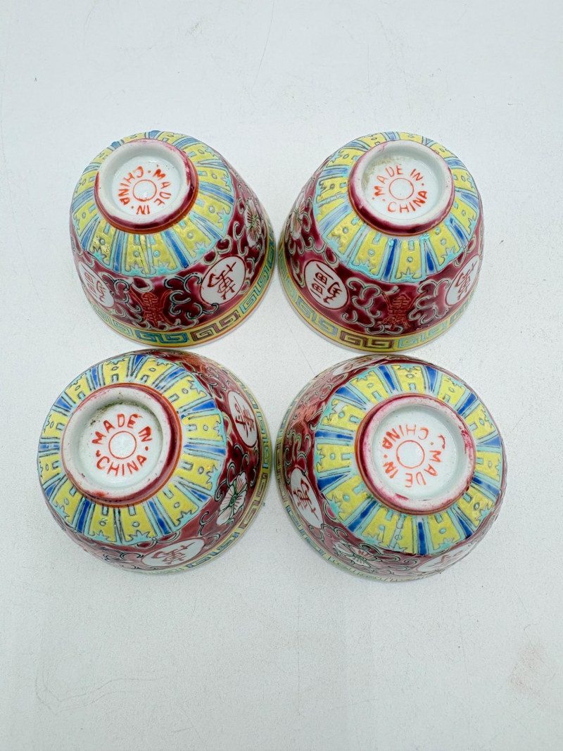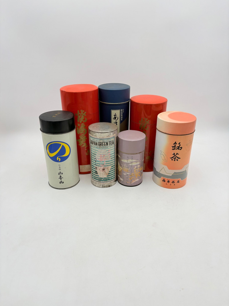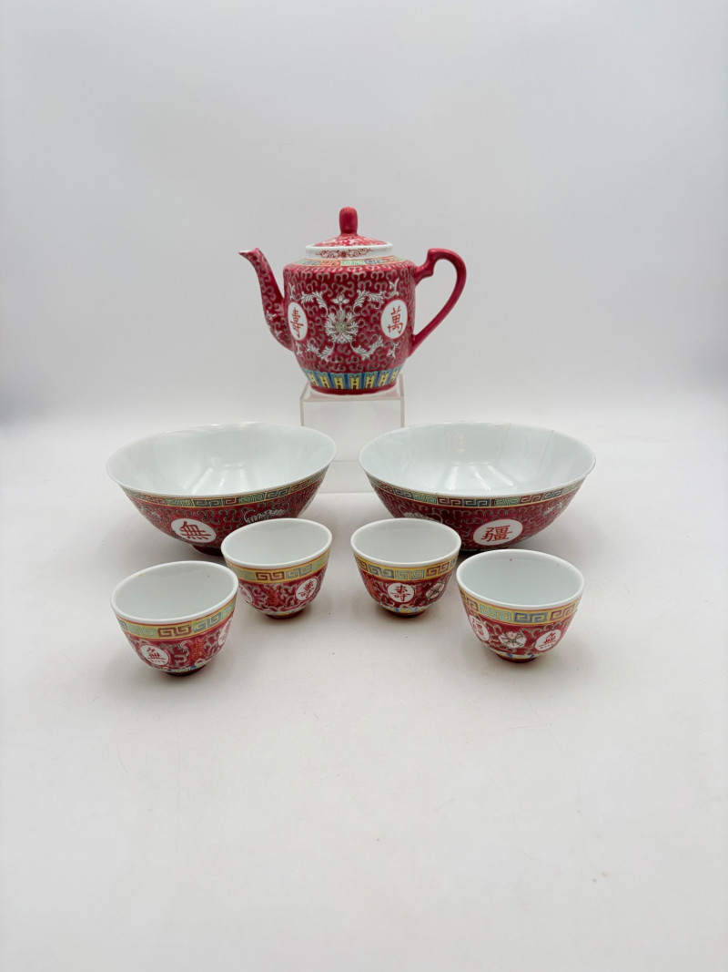 Everything you need for tea time - it's vintage but works for tea & snacks today! Vintage Chinese tea set in red textured ceramic has relief designs and floral motifs. Teapot (measures 6" H), two bowls for wafers or salty snacks (measure 6.25" W), and 4 teacups (measure 3" W). All in good condition although one of the bowls has a few hairline cracks that don't impair use - see 2 photos after the bowls. Group of 7 vintage tea tins - one for a Seattle import company and 2 with separate interior freshness lids. Tallest orange one measures 9.5" H. BONUS - after shooting the lead photo, we found the matching serving plate - see last photo.