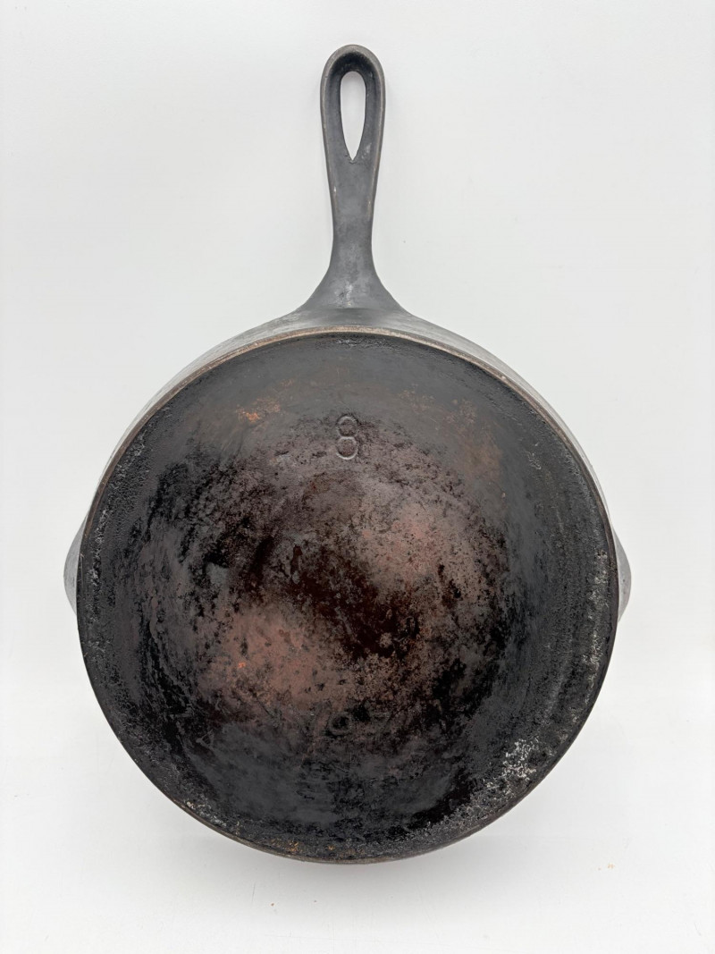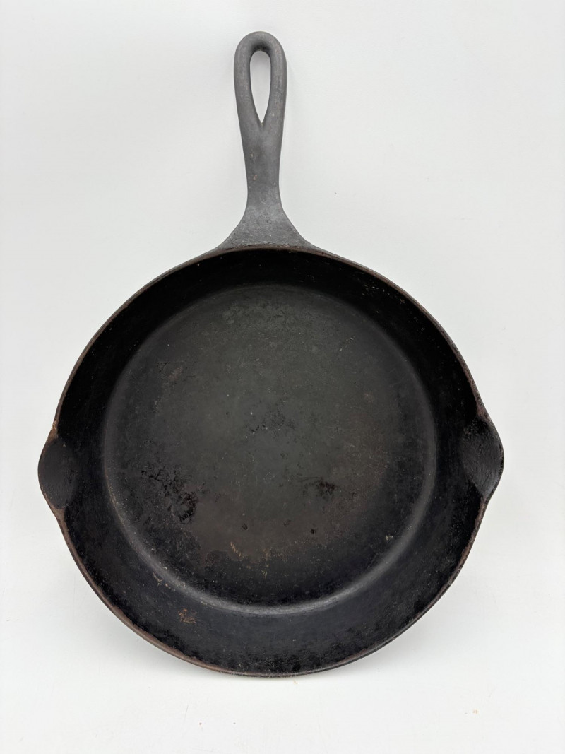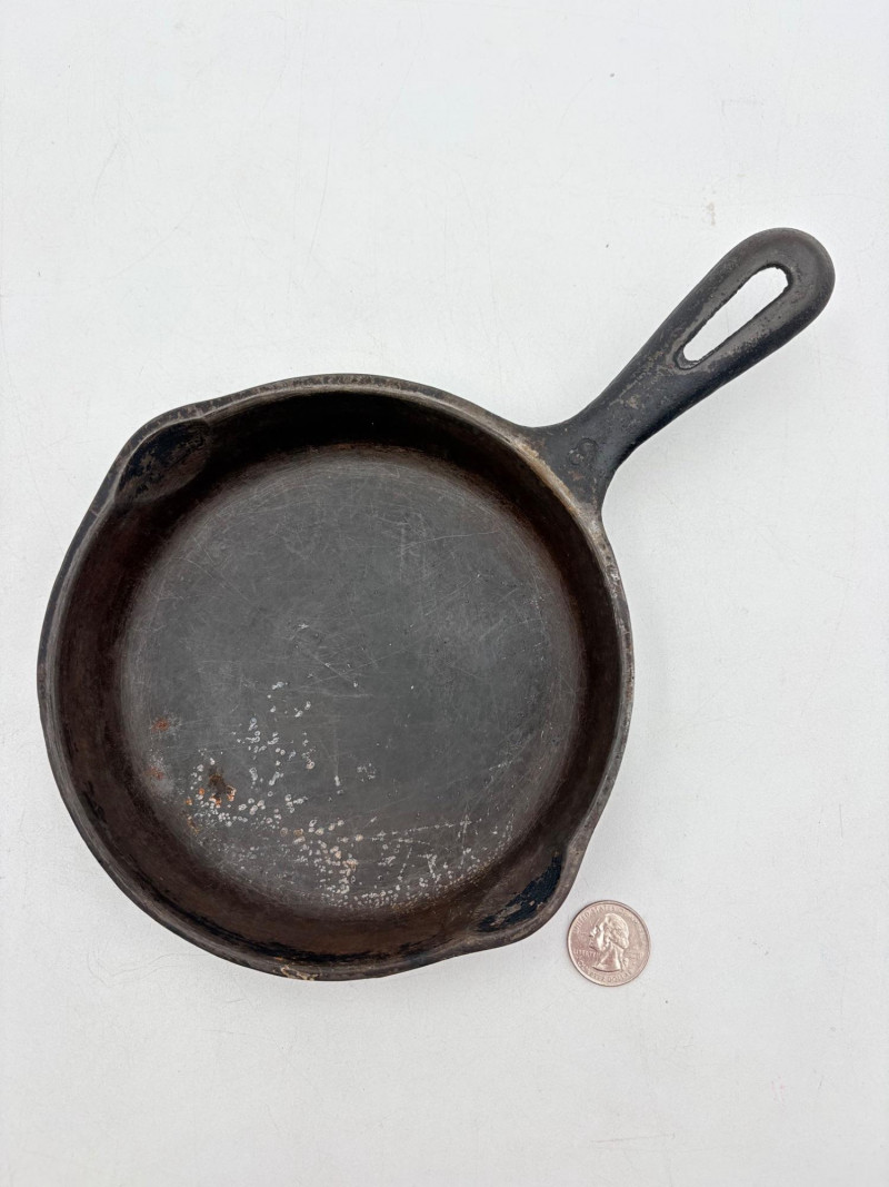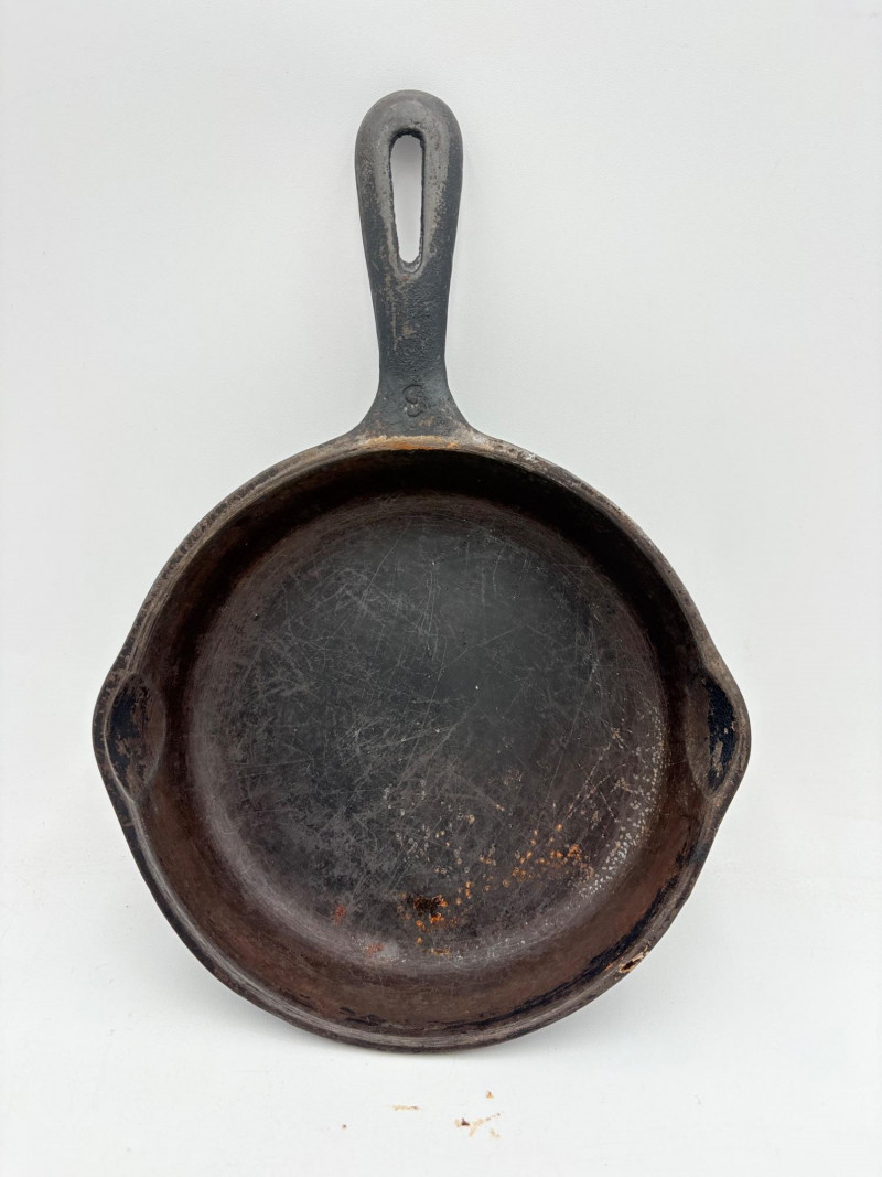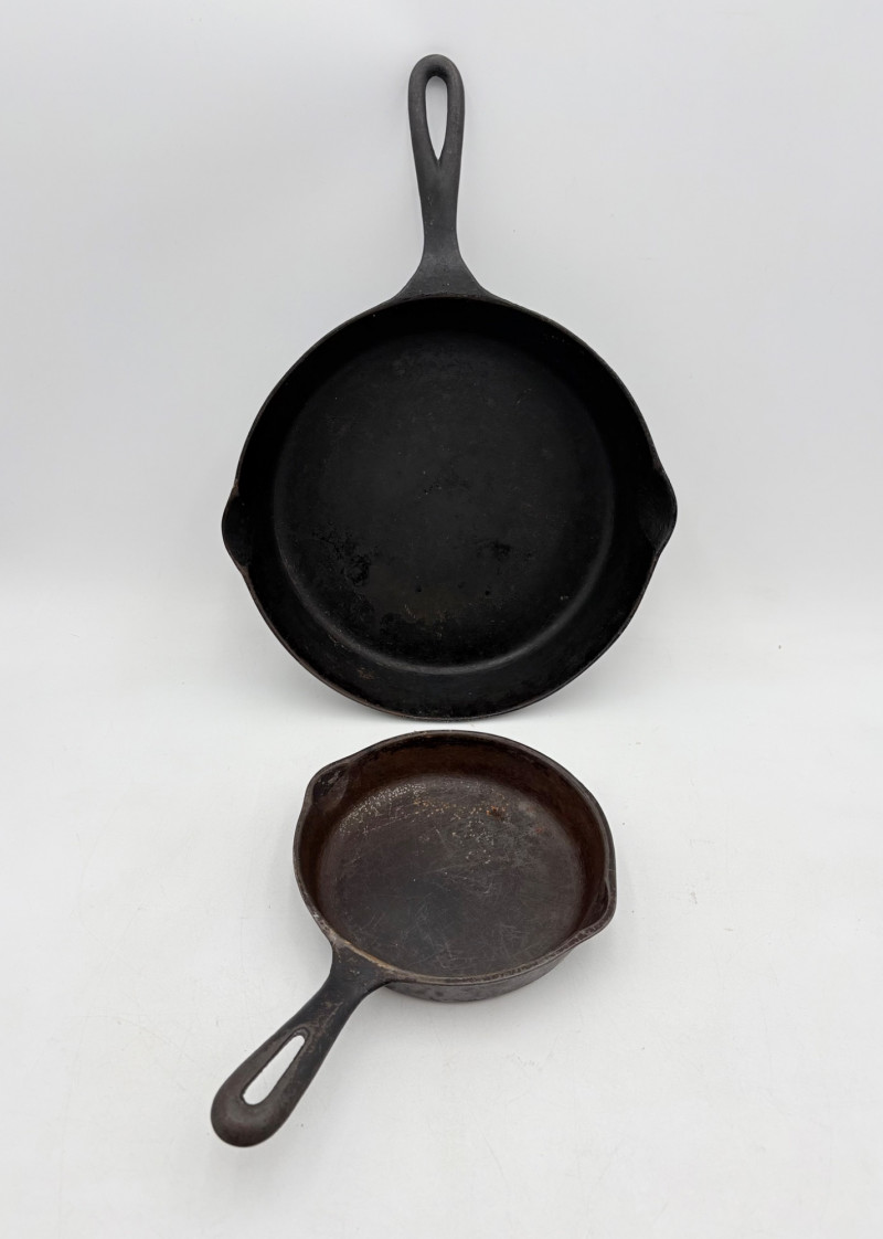 Any great cook knows that cast iron is the workhorse of the kitchen. We have 2 vintage pans of varying sizes in this lot that have seen lots of use but still have lots to give. Both are in need of being stripped and seasoned, but since we do that every few months to our own cast iron, we know that shouldn't be much of a burden for the quality cast iron delivers. (And the vintage cast iron like this is far better than what you find made today). Lot consists of: - 6" diameter pan from unknown maker. Has been used enough that bottom markings are worn off, but handle indicates #3. - 10" diameter pan from WAPAK (made in Ohio). Labeled #8. This pan has a slightly more slender handle than the other 2 cast iron pans of similar size up for auction* - easier for smaller hands. Wapak #8 Skillet - Etsy for sale elsewhere * see Lot #150.