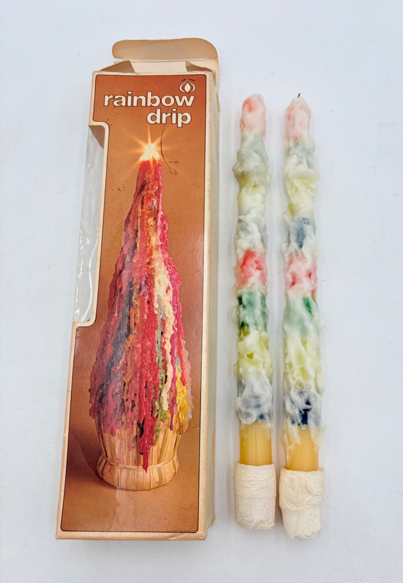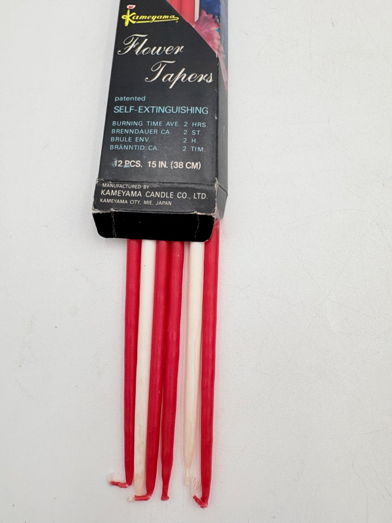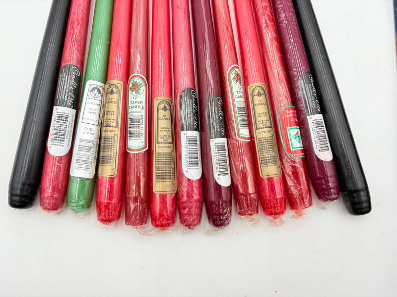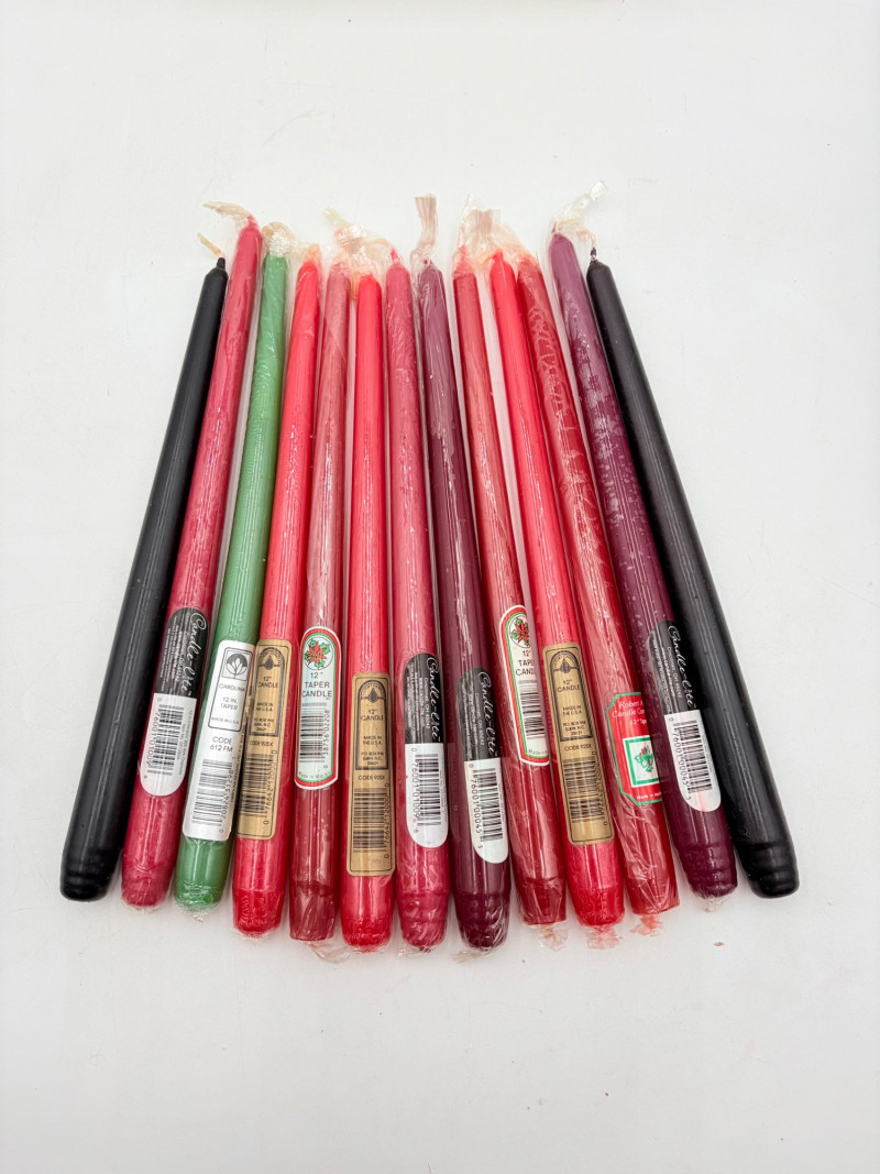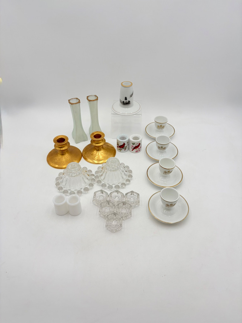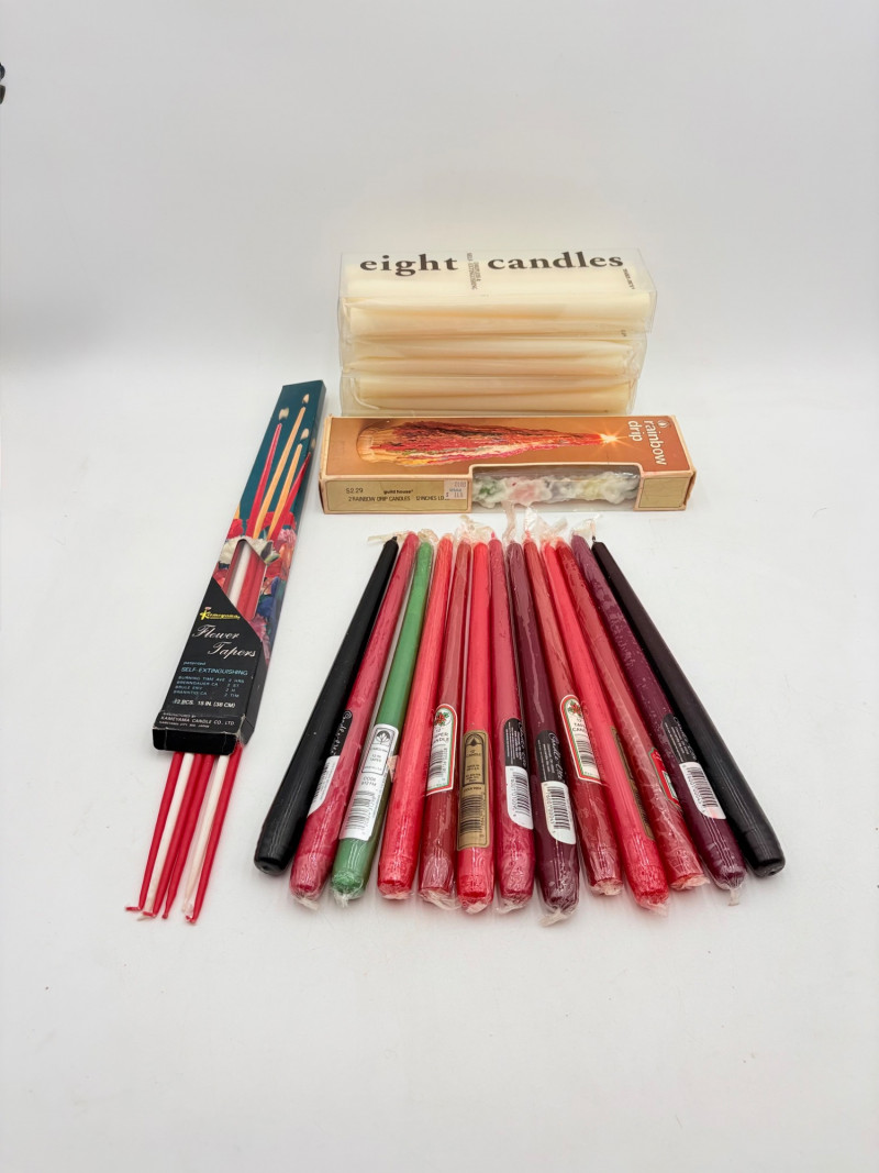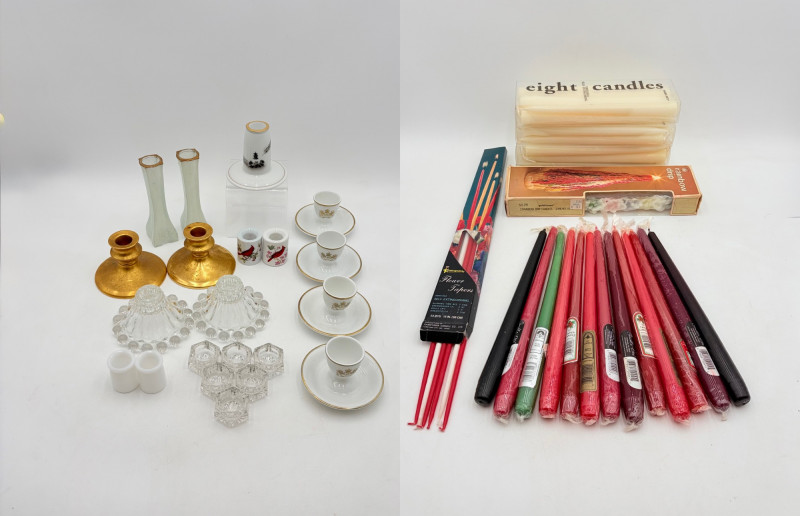 Several sets of vintage candlesticks and a large number of vintage candles (plus a few Trader Joe's candles for extra measure). What you see is what you get, so please look at photos for details. (We included only candles that were either new or had not burned enough to mar the wax.) BONUS - we found some new novelty candles after photos were done and will include them (koi fish & plumeria). .