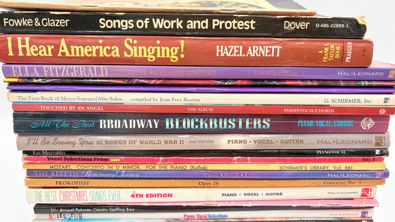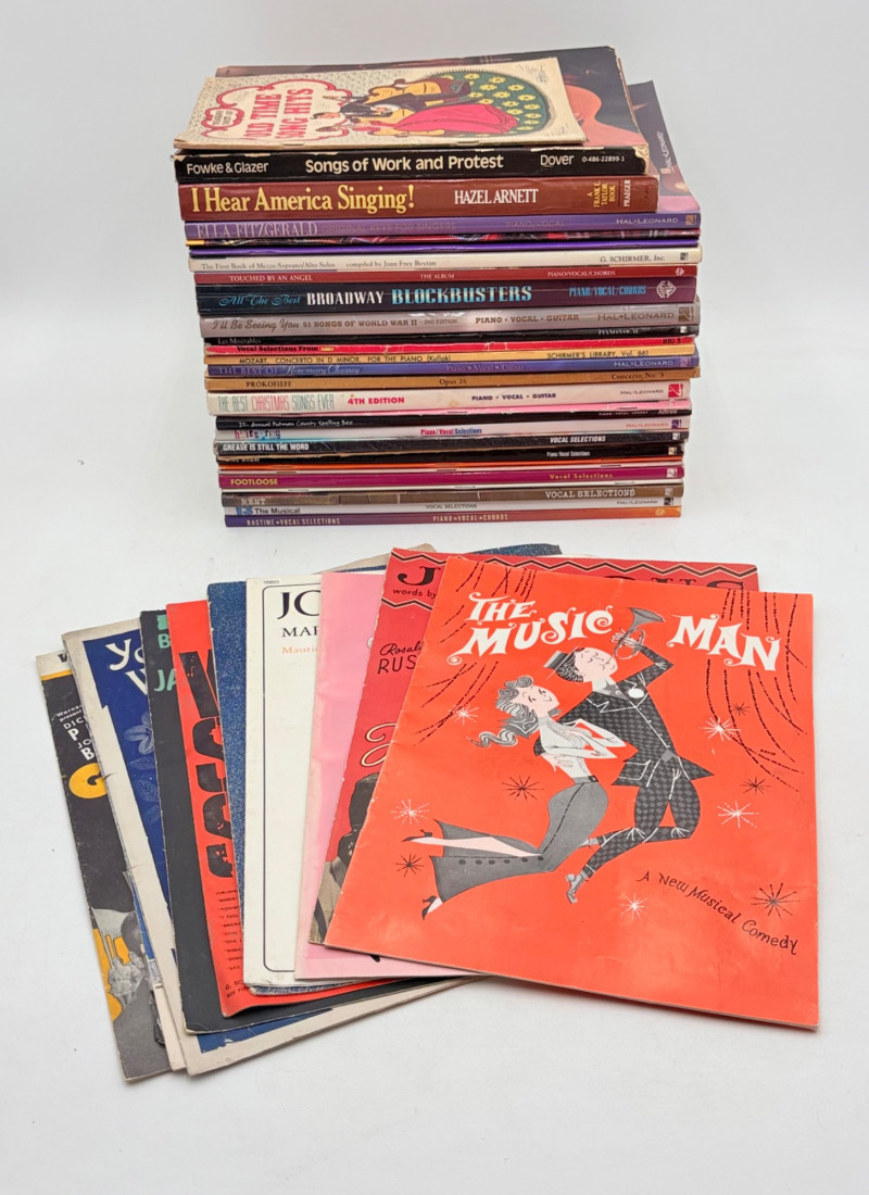 Huge lot of piano music - mostly books with scores from the likes of Grease, Rent, The Fantasticks, Ragtime, Footloose, etc. Also includes a small grouping of sheet music (Scott Joplin, Music Man, etc.), and a few classical selections such as Mozart & Prokofiev. Please see photos for titles.