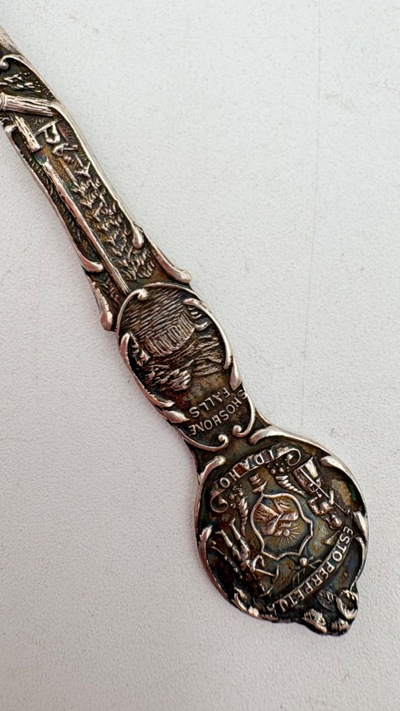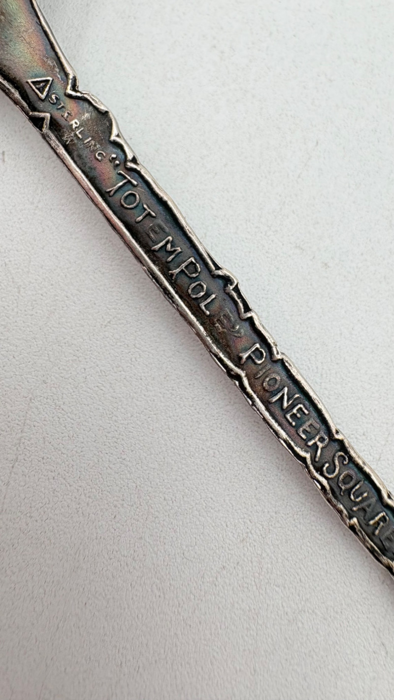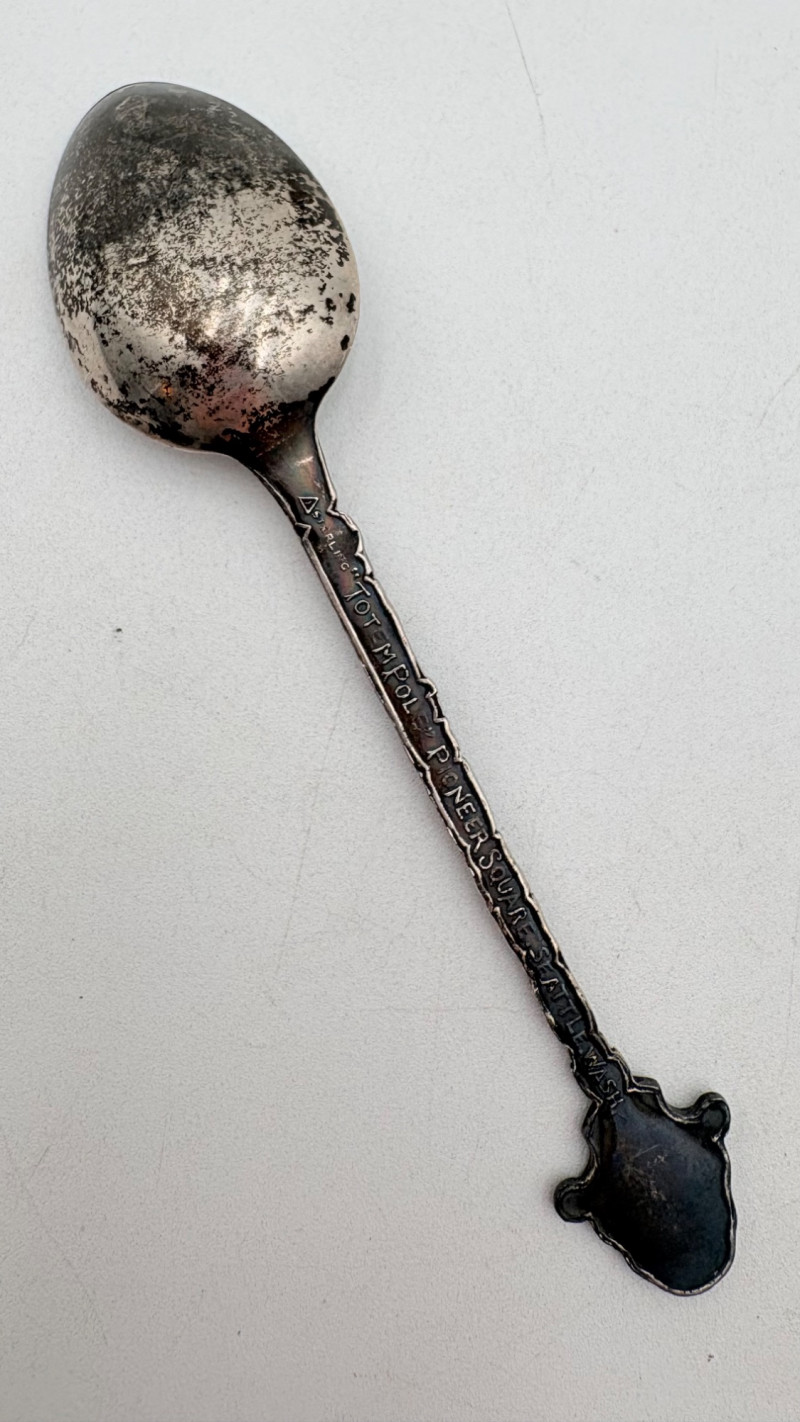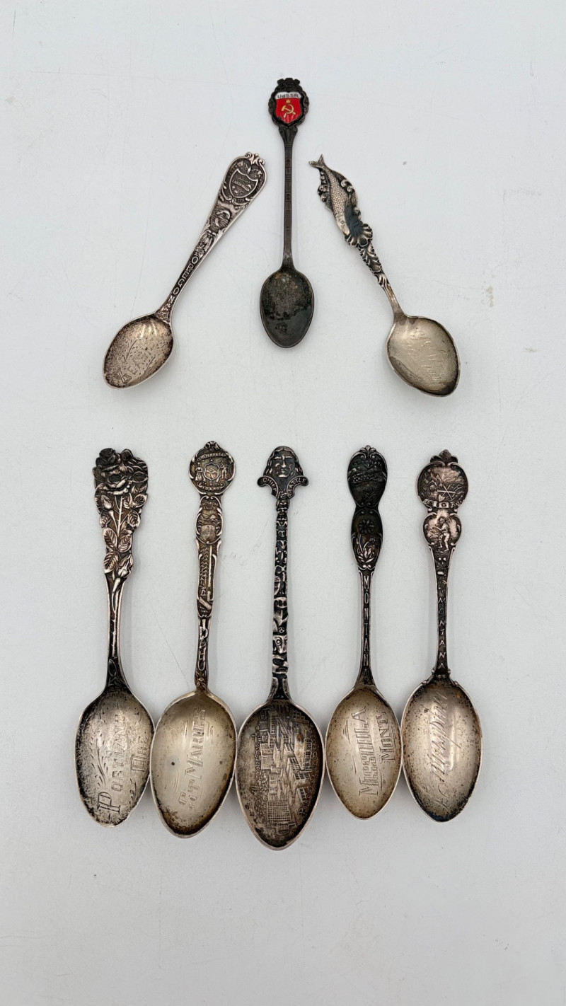 Lovely variety of antique sterling souvenir spoons from various locales - all quite lovely with distinctive in design, and serviceable with a quick polish. Spoons from: - Livingston, Montana - Pioneer Square Totem Pole (Pioneer Square - Seattle) - Seaside, Oregon - Portland, Oregon - St. Maries, Idaho - Tacoma, Washington - Missoula, Montana - UdSSR (Soviet Union) Total weight: 107 grams