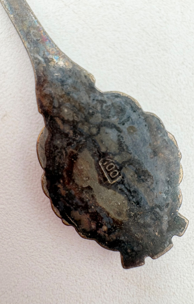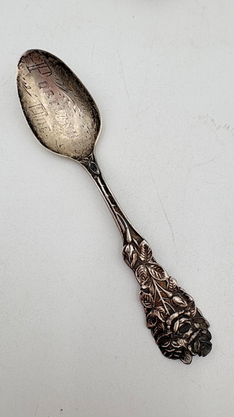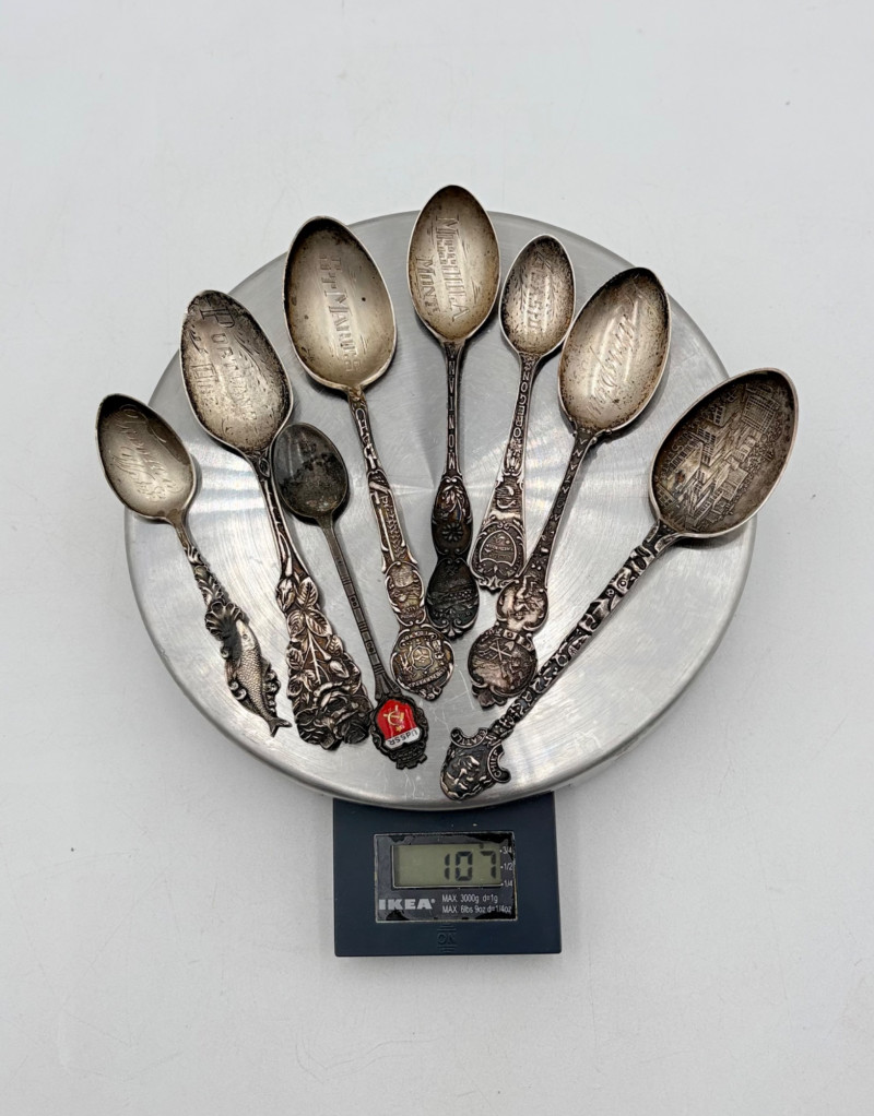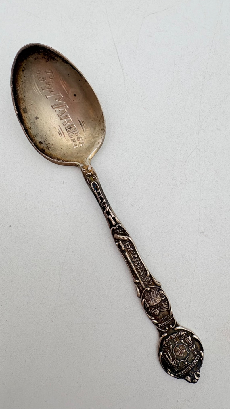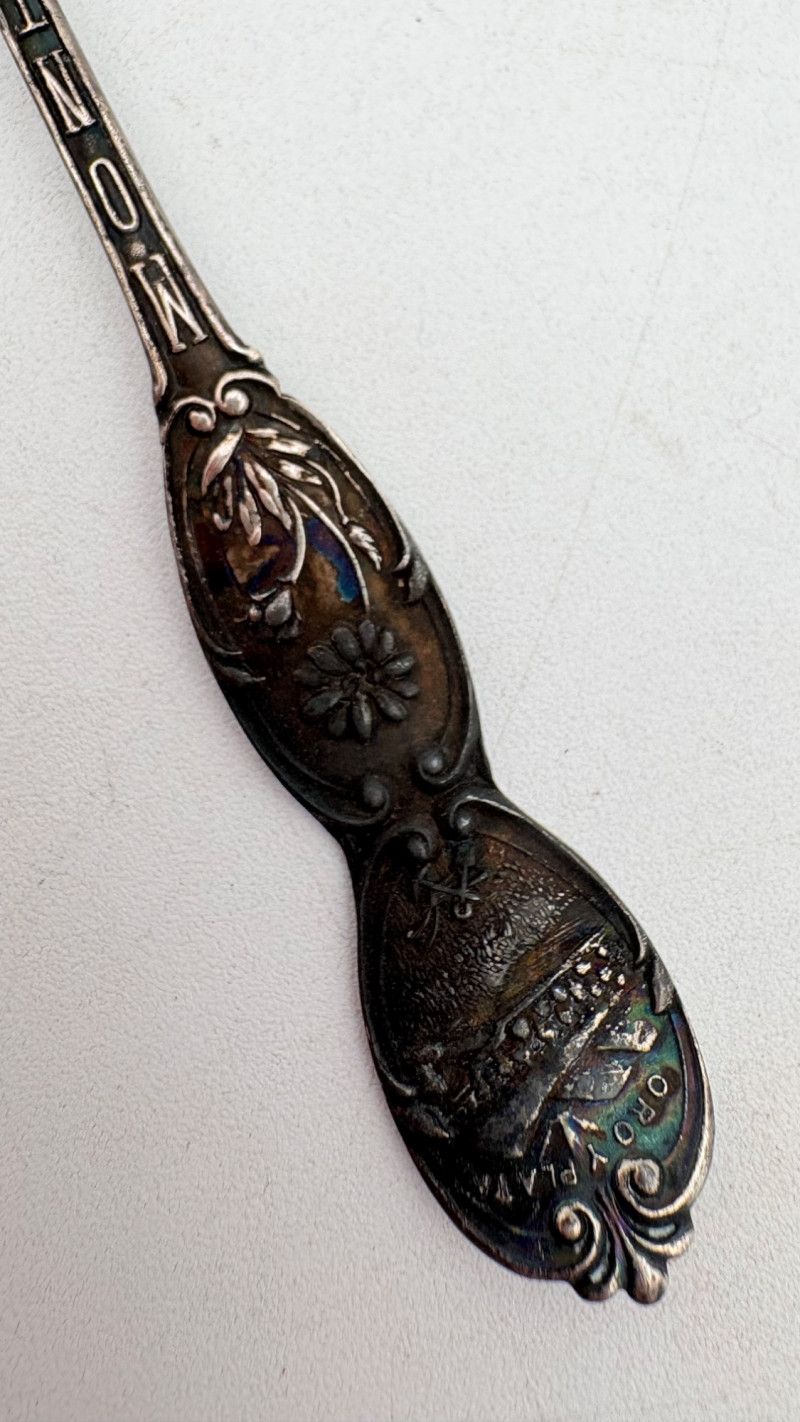Lovely variety of antique sterling souvenir spoons from various locales - all quite lovely with distinctive in design, and serviceable with a quick polish. Spoons from: - Livingston, Montana - Pioneer Square Totem Pole (Pioneer Square - Seattle) - Seaside, Oregon - Portland, Oregon - St. Maries, Idaho - Tacoma, Washington - Missoula, Montana - UdSSR (Soviet Union) Total weight: 107 grams