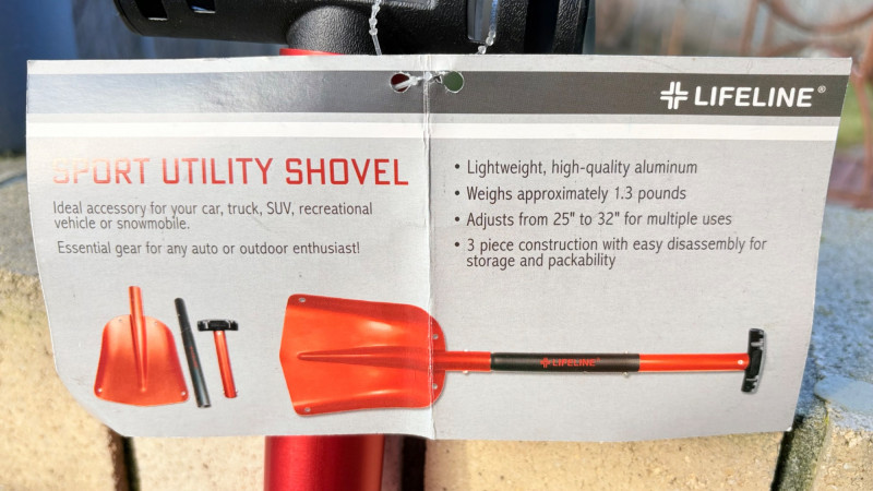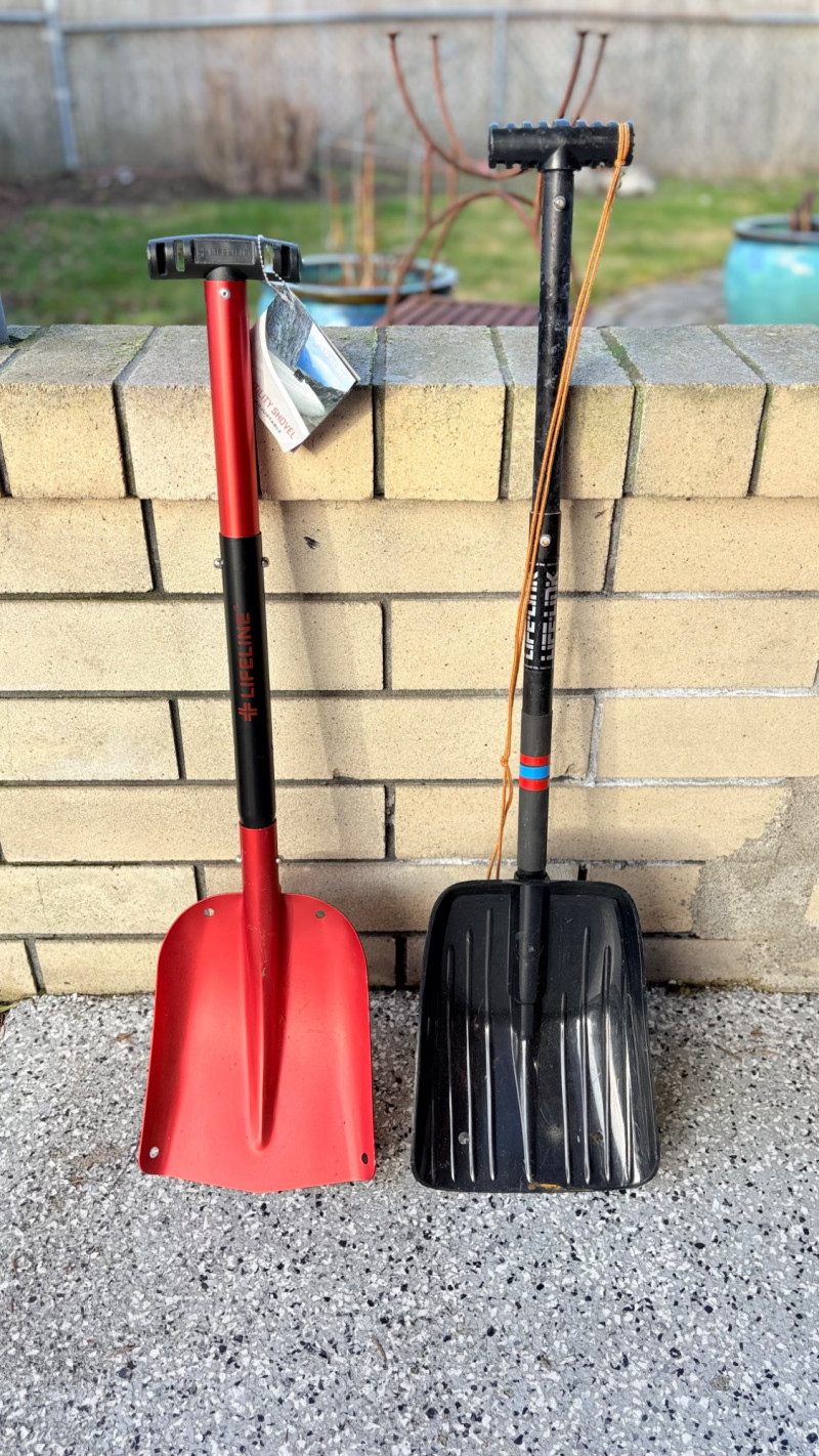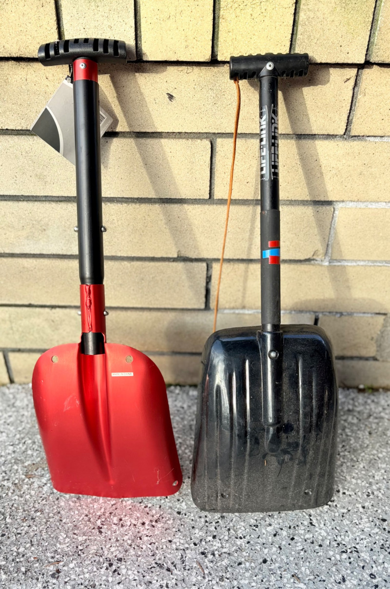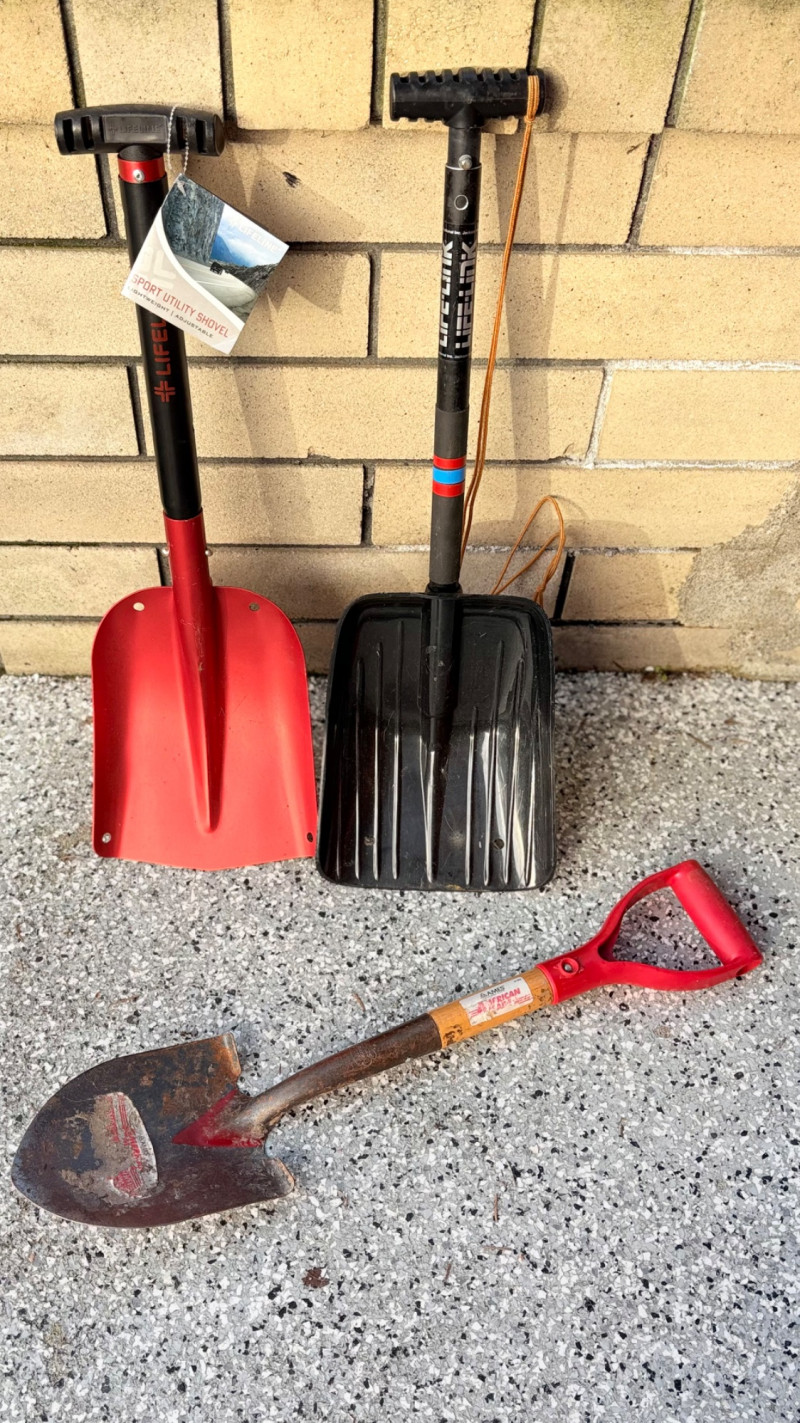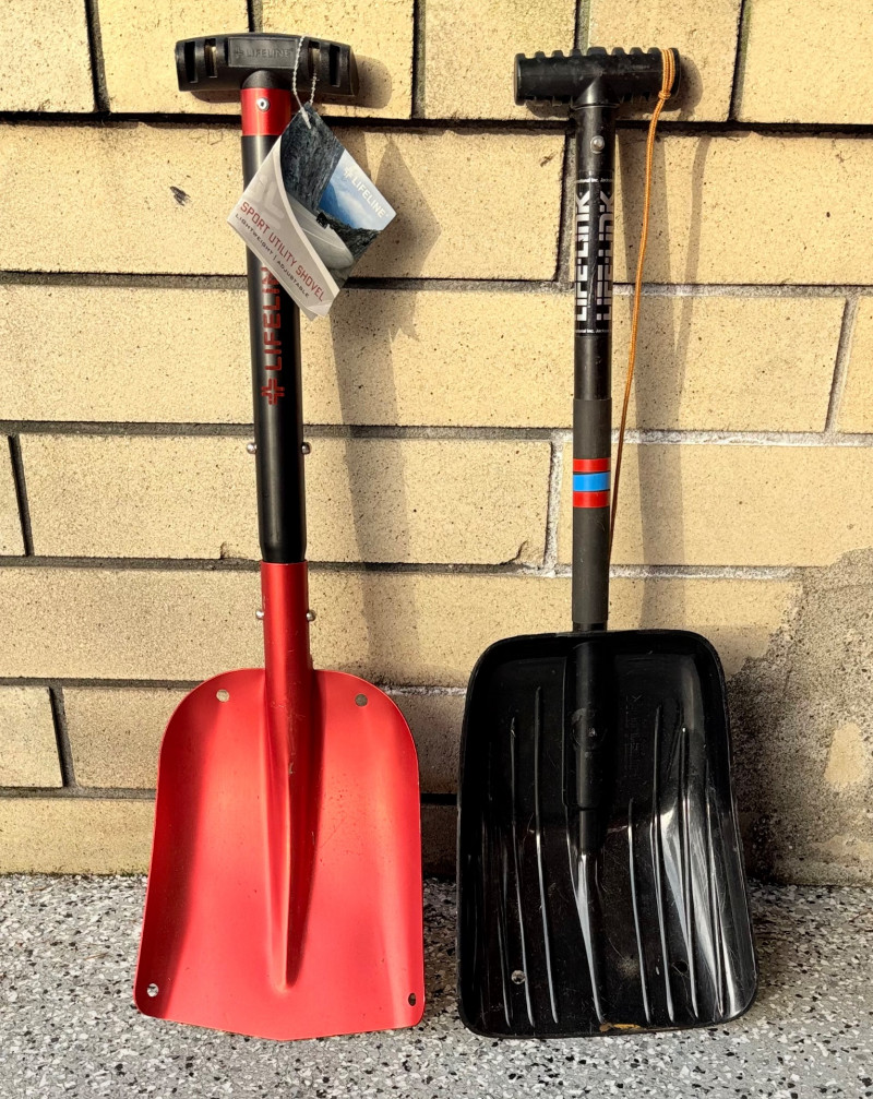 These items are lifesavers when you get stuck in snow in your car or on the trail. Both are super-lightweight and both telescope with pop-up tube locks. Red Lifeline shovel is new with tag. It is aluminum with an easy-grip rubber handle. Some slight storage wear on scoop section. Measures 26" compacted and 32" extended. Black Life-Link shovel has been used minimally. The shovel is aluminum with a heavy-duty plastic scoop. and rubber handle. Measures 27" compacted and 35" extended. BONUS: Another small wooden emergency shovel - not as lightweight as the others, but still great to have around for an emergency.