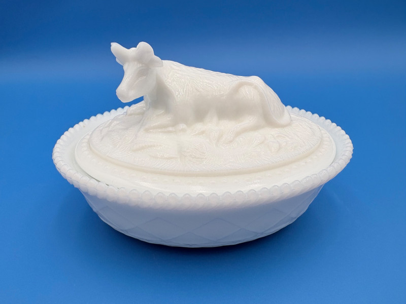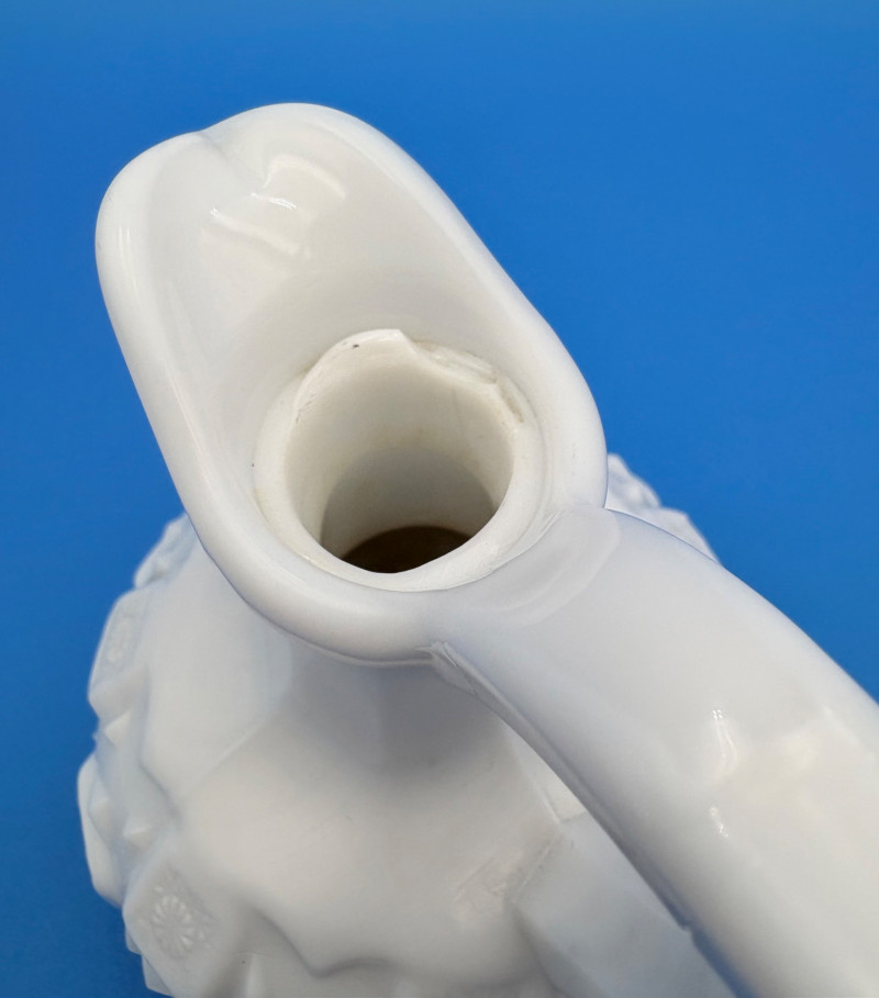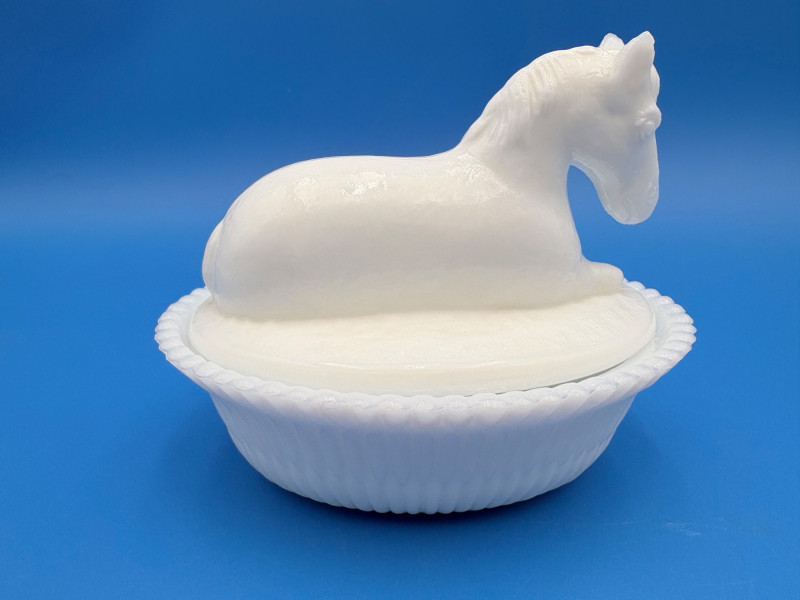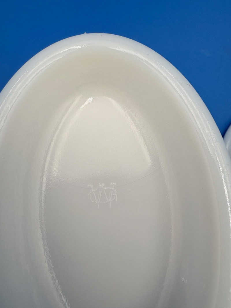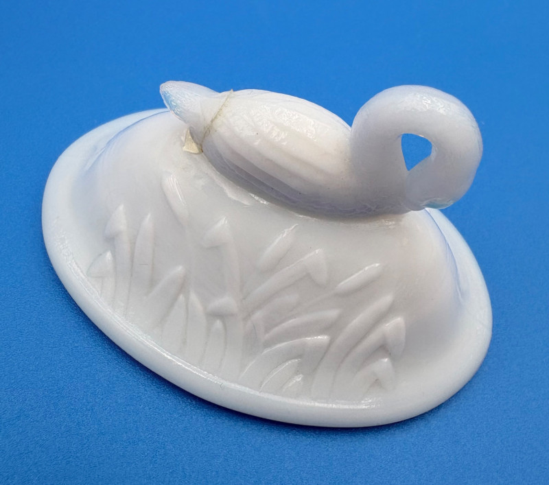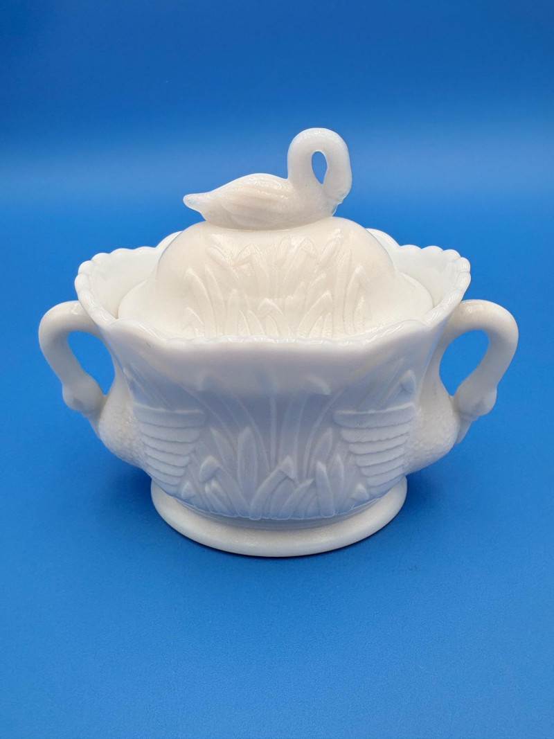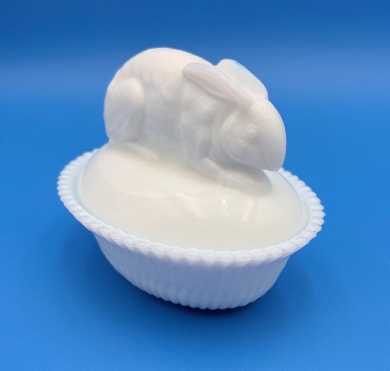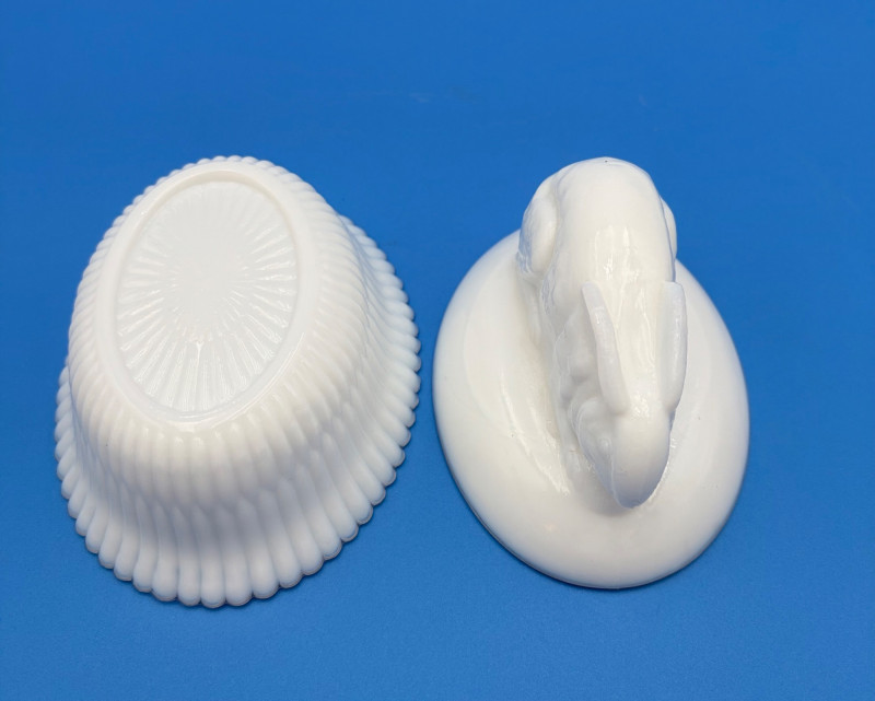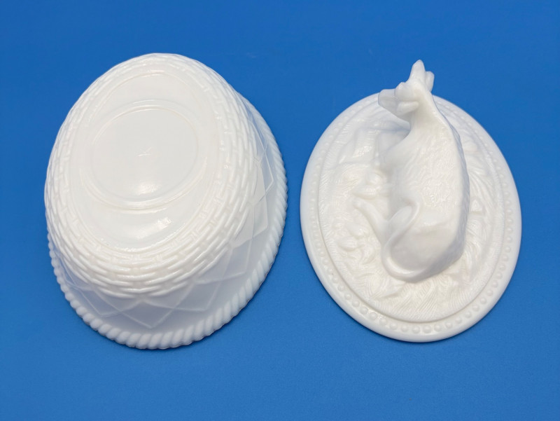 Large group of milk glass - assorted pieces, several with animal lids. What you see is what you get! (Note that there were no maker marks except on covered swan bowls [Westmoreland] and the large round plate [Kemple?]. We suspect much of it is actually Westmoreland, but without the marks we can't guarantee). Largest pieces (compote & round plate) measure 6.25" H and 10" W respectively. Note that there are a few flaws on 3 items, none of which affect function - see last 3 photos: - One swan tail has been reglued - Bunny lid has a crack near his hind legs - Cruet inside rim has some chips (doesn't show when stopper is used) Note that there is another group of milk glass in Lot #67