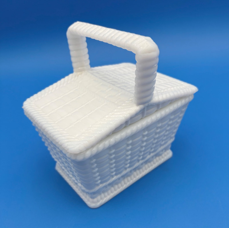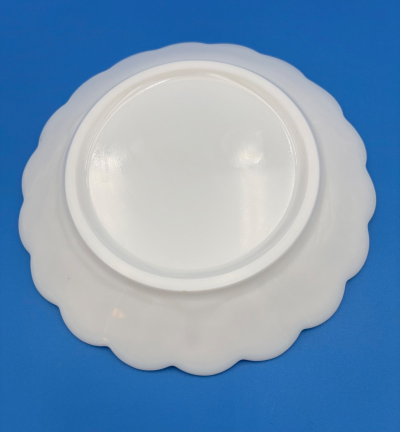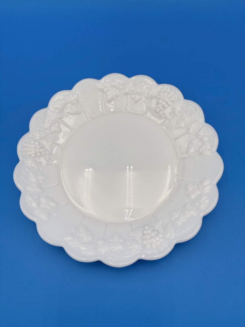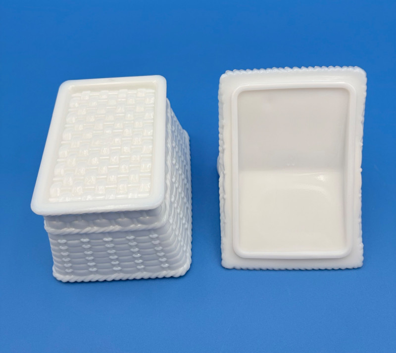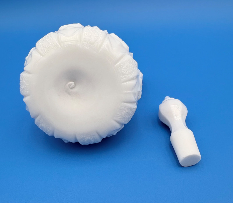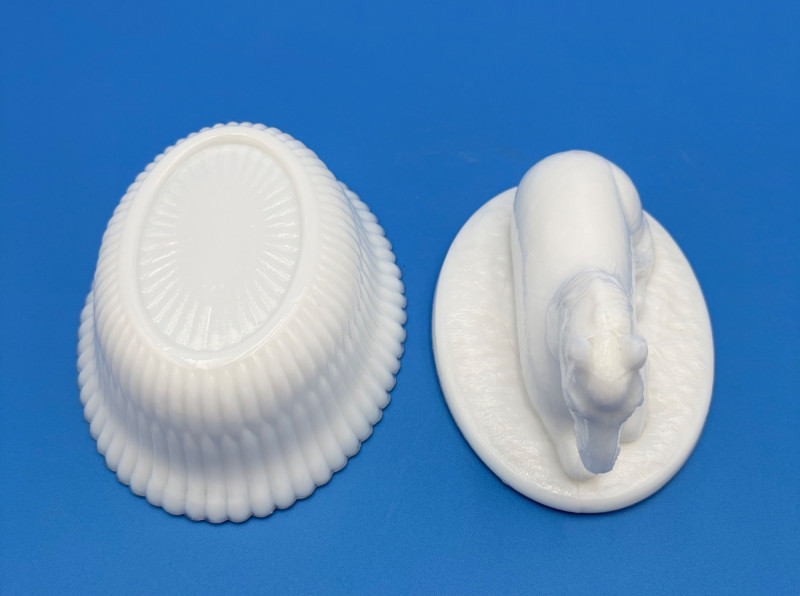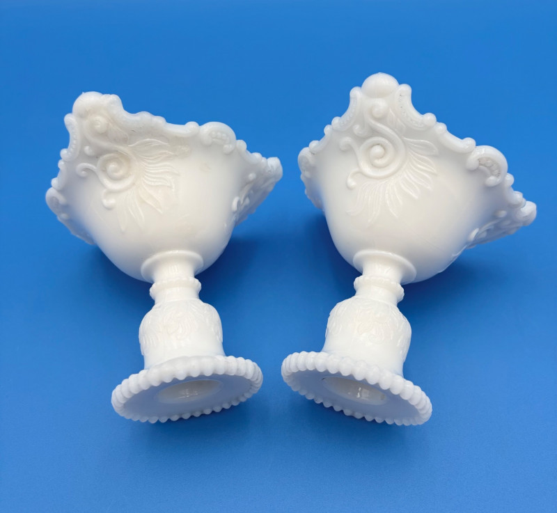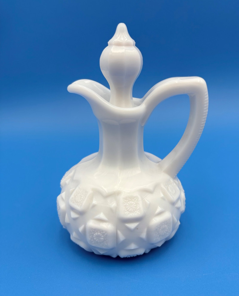 Large group of milk glass - assorted pieces, several with animal lids. What you see is what you get! (Note that there were no maker marks except on covered swan bowls [Westmoreland] and the large round plate [Kemple?]. We suspect much of it is actually Westmoreland, but without the marks we can't guarantee). Largest pieces (compote & round plate) measure 6.25" H and 10" W respectively. Note that there are a few flaws on 3 items, none of which affect function - see last 3 photos: - One swan tail has been reglued - Bunny lid has a crack near his hind legs - Cruet inside rim has some chips (doesn't show when stopper is used) Note that there is another group of milk glass in Lot #67