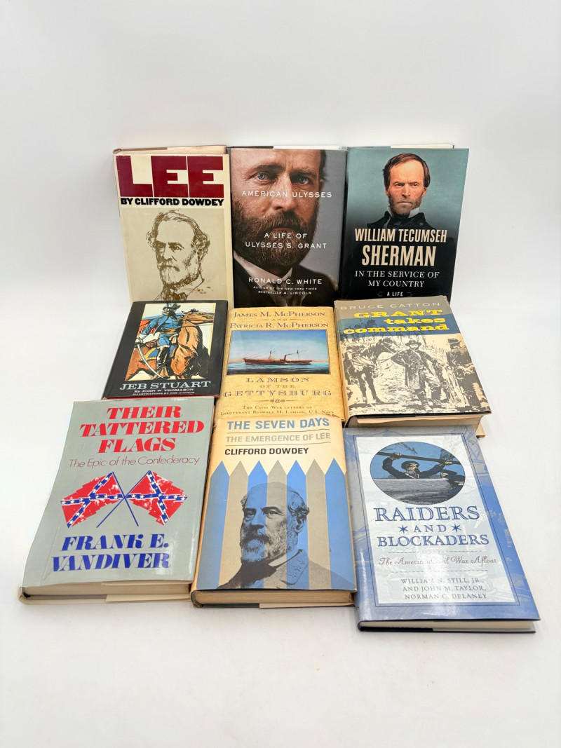 9 books centering on the Civil War - several are bios of the names we all know but often can't keep straight. Well worth picking up and reminding ourselves about why the Cil War was fought and how it might enlighten us in the present day. Please see photos for titles.