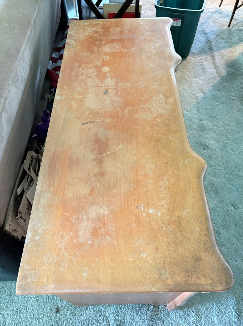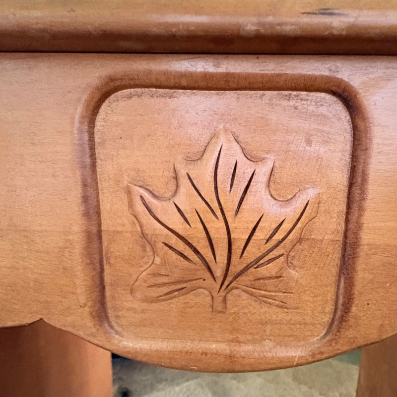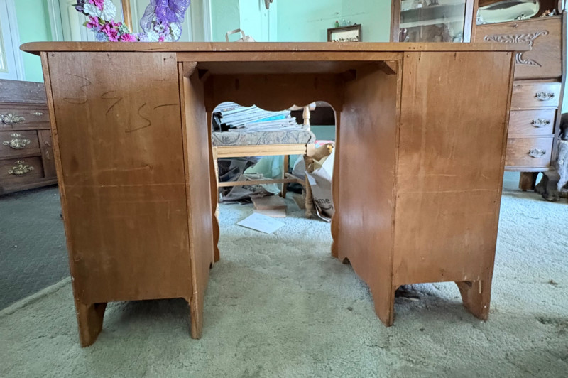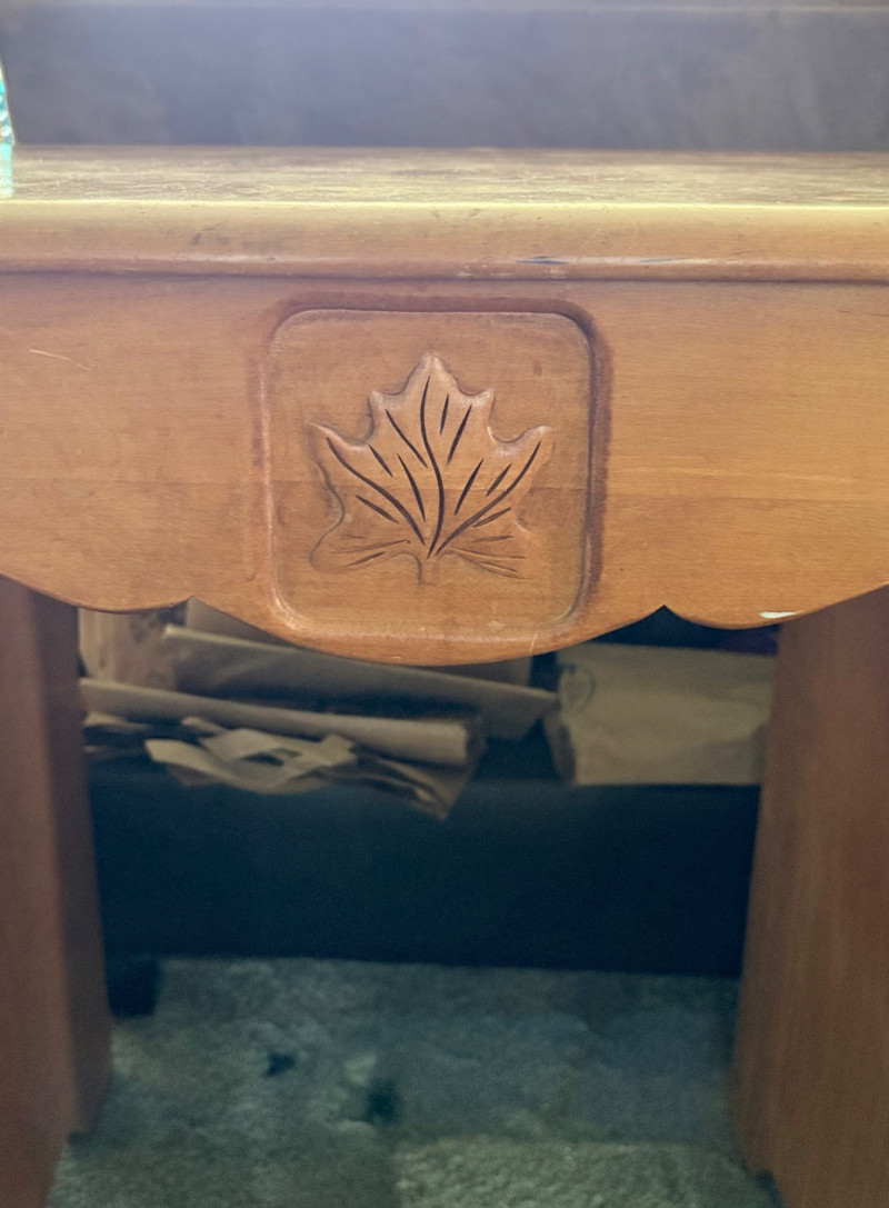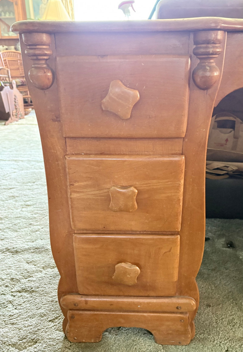 Retro deco desk from maker Virginia House has gentle curves and simplified classic styling. It has been well-loved but still has many years of use in it; given a little TLC/refinishing it could easily fit into a traditional, MCM, or modern setting. Desk in medium-tone wood with nicely rounded corners (no sharp edges). Dovetail joins in drawers. 3 drawers on either side with mapleleaf in-between the two smaller drawers in the apron. Measures 29" H x 46" W x 19.5" D. Like its partner, this piece shows wear (particularly on the top surface) but has nice solid construction. Small scrape on veneer at lower left rear. See last photo. NOTE: Matching chest of drawers in previous lot (#120) NOTE: Please bring 2 able-bodied people with you to move this.