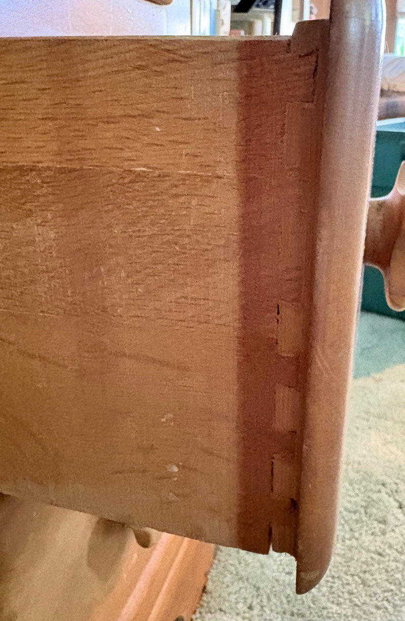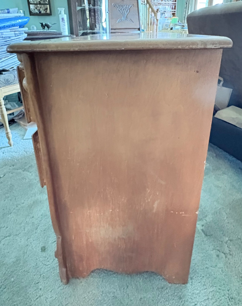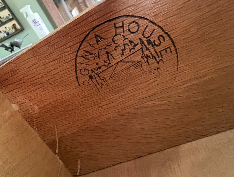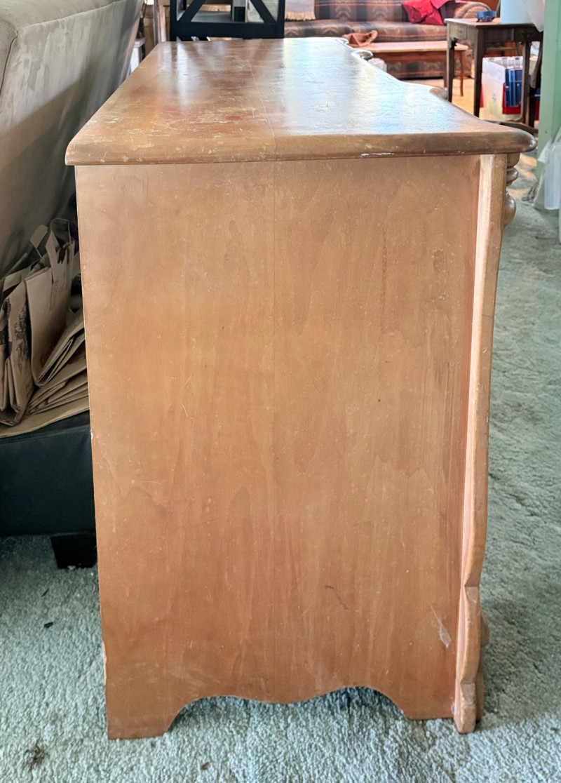 Retro deco desk from maker Virginia House has gentle curves and simplified classic styling. It has been well-loved but still has many years of use in it; given a little TLC/refinishing it could easily fit into a traditional, MCM, or modern setting. Desk in medium-tone wood with nicely rounded corners (no sharp edges). Dovetail joins in drawers. 3 drawers on either side with mapleleaf in-between the two smaller drawers in the apron. Measures 29" H x 46" W x 19.5" D. Like its partner, this piece shows wear (particularly on the top surface) but has nice solid construction. Small scrape on veneer at lower left rear. See last photo. NOTE: Matching chest of drawers in previous lot (#120) NOTE: Please bring 2 able-bodied people with you to move this.