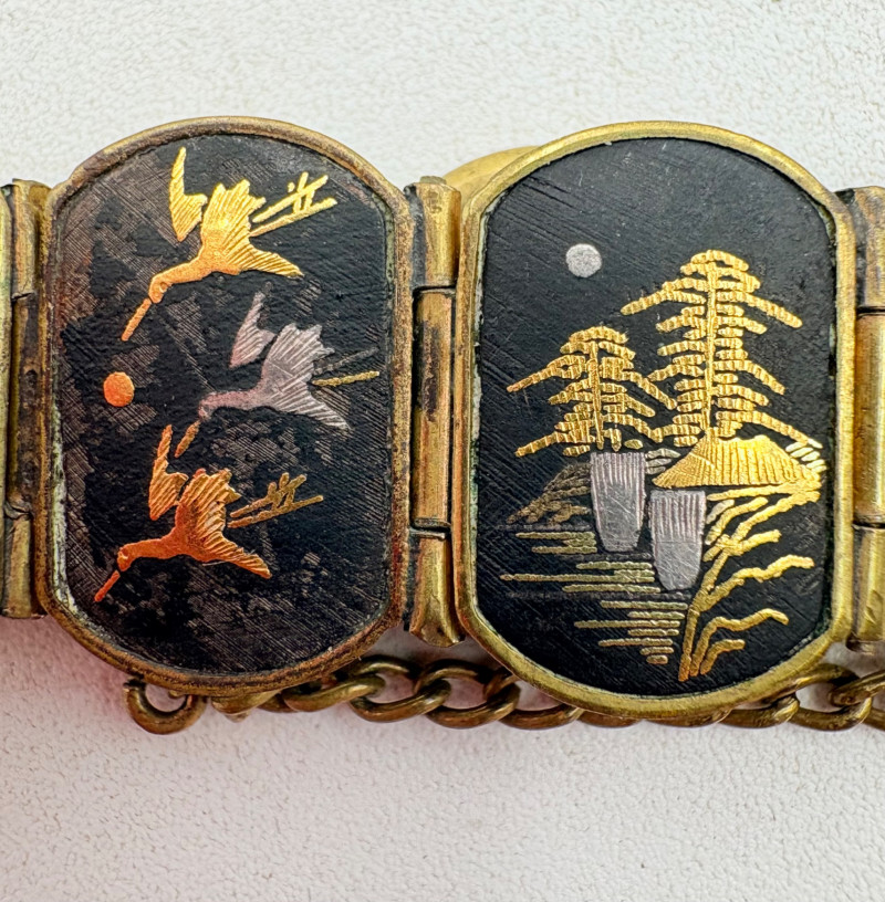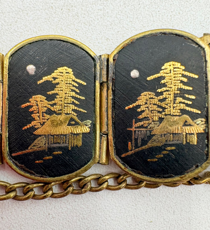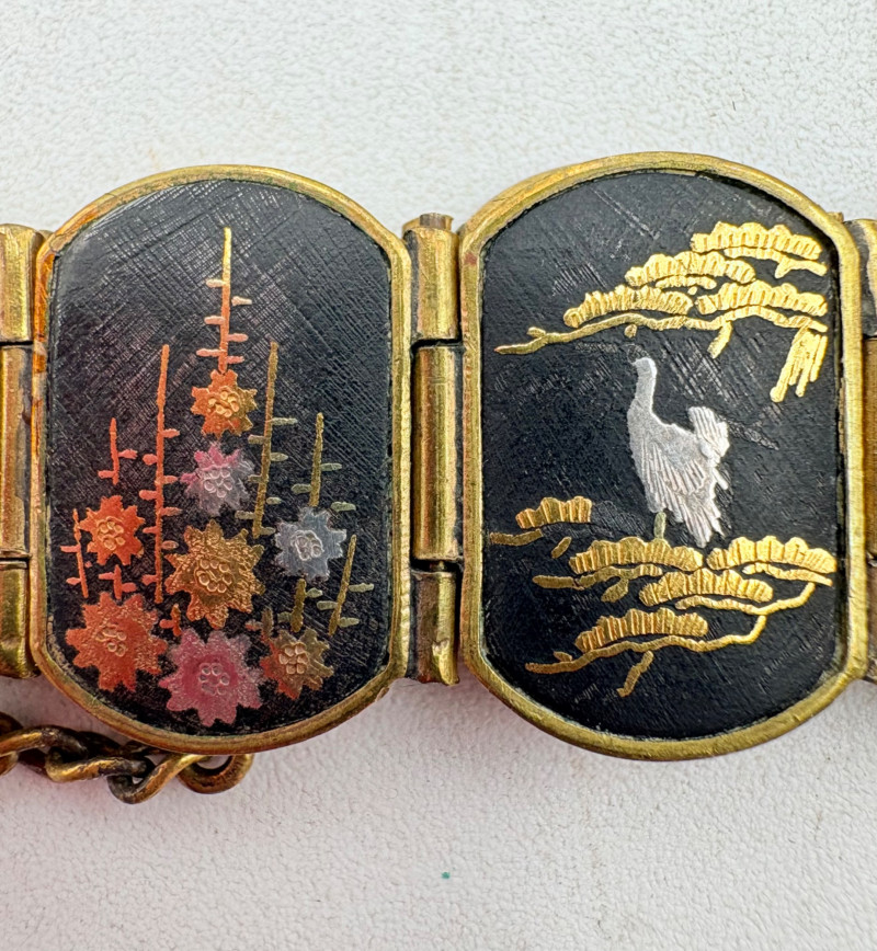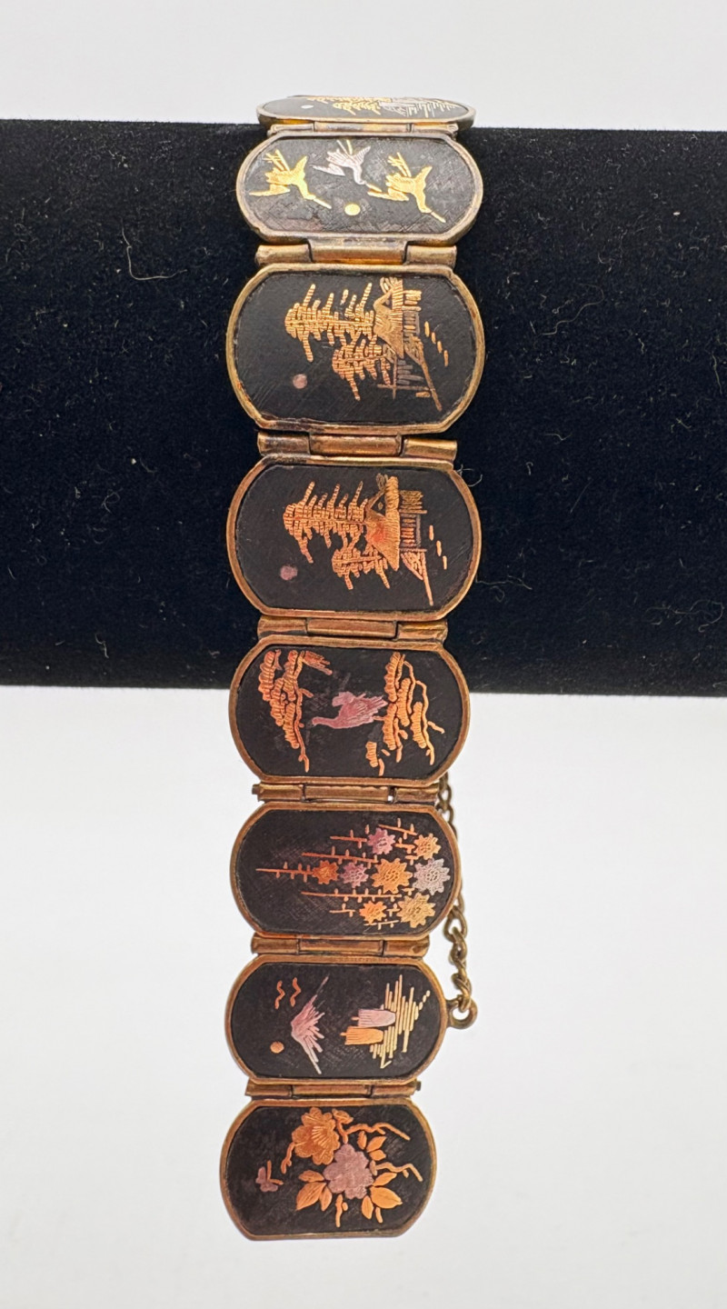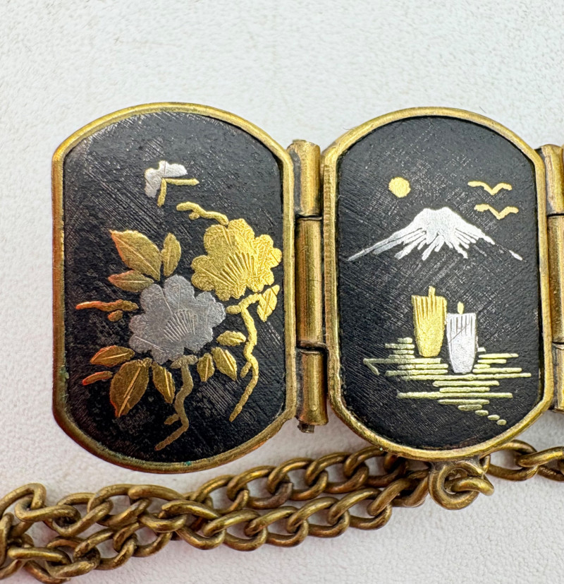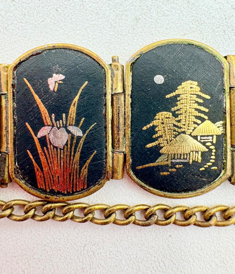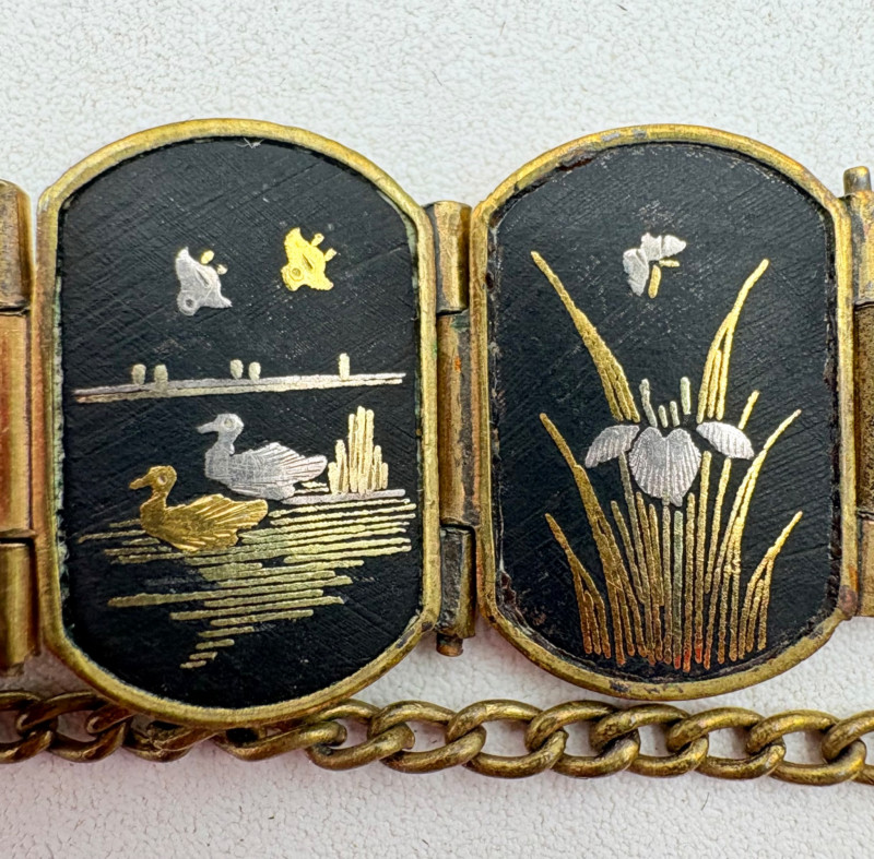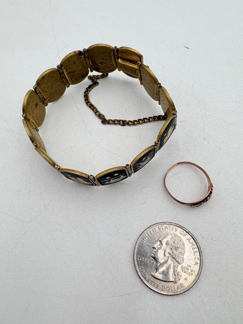 Pair of beautiful antique jewelry pieces that have stood the test of time. We believe the bracelet is a Japanese Damascene panel bracelet - each of the 13 panel scenes is unique and finely wrought. Traditionally these bracelets are made with gold & silver inlay on a steel or iron backing, but there is no indication of material on this bracelet. There is a maker's mark of an "M" inside an overdrawn diamond shape. A special touch with this bracelet is that the inside of the panels that are against the skin are also incised with individual floral motifs rather than being simply plain. The panels are 5/8" H and there is a safety chain. Small antique ring shows a fair amount of wear, but the delicacy is lovely - says "Oregon Gold" and was verified by the jeweler to be 10K. Note: please disregard the red cast to the bracelet photos - our red phone case was reflecting on the metal finish.