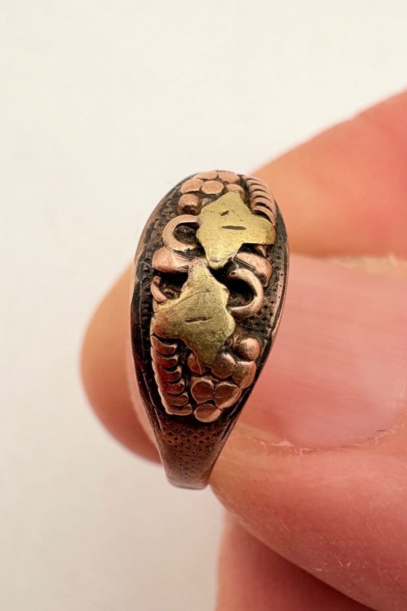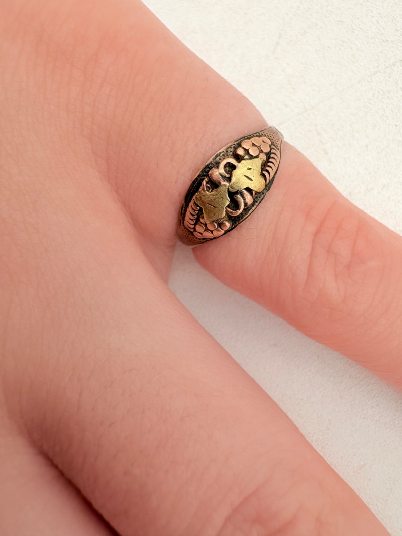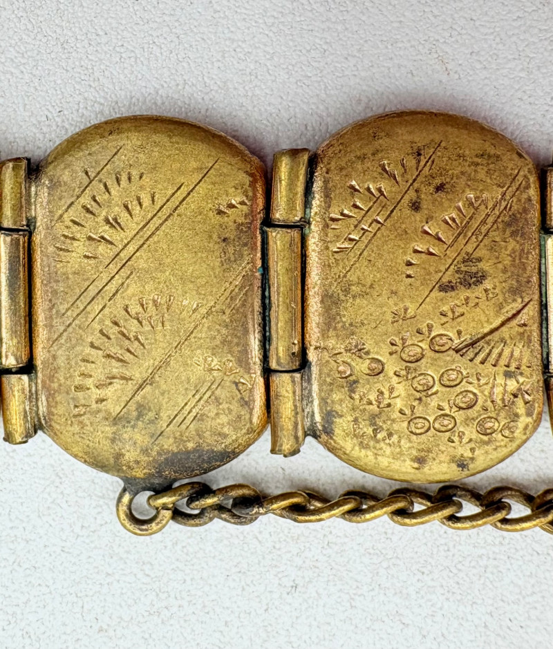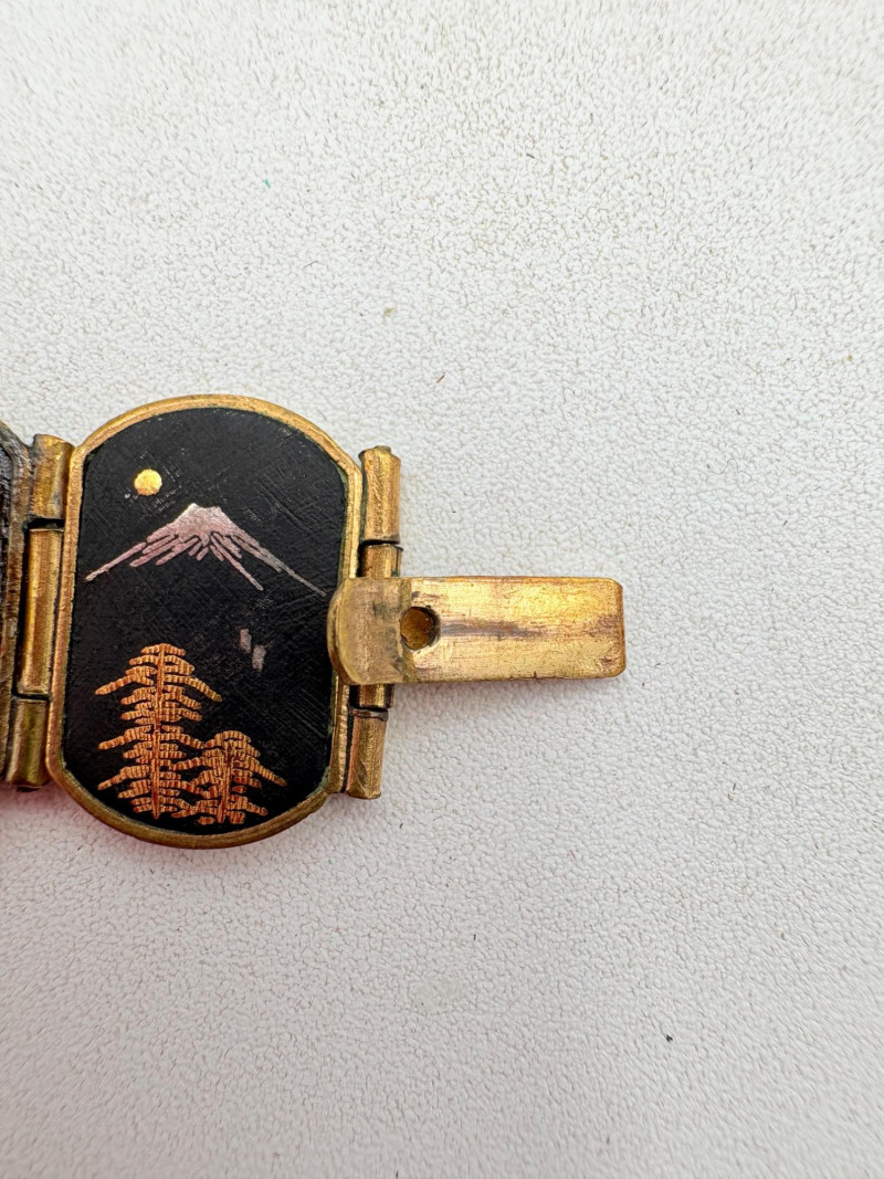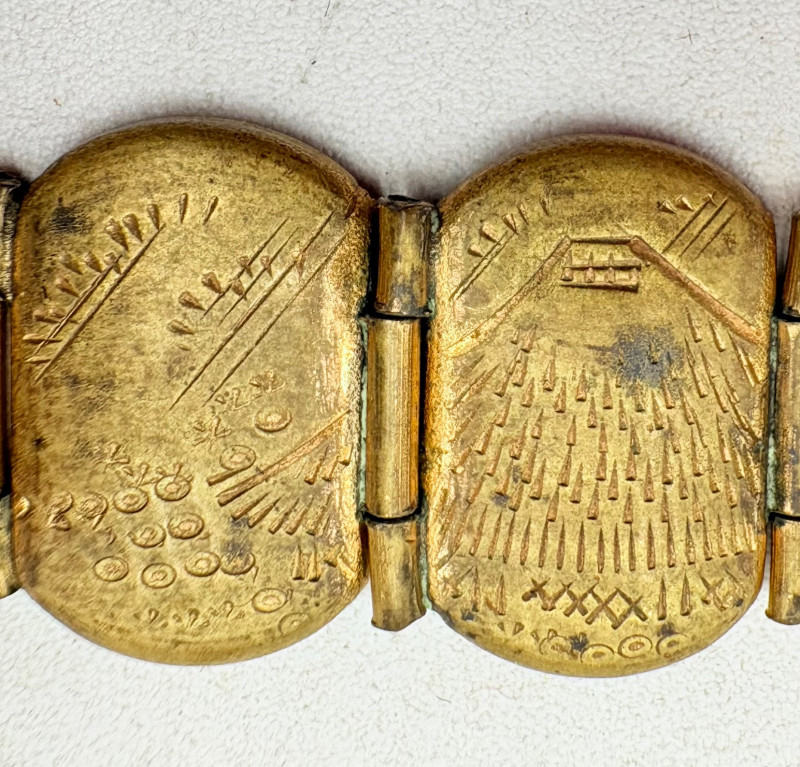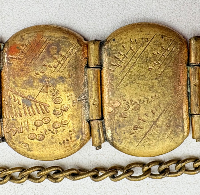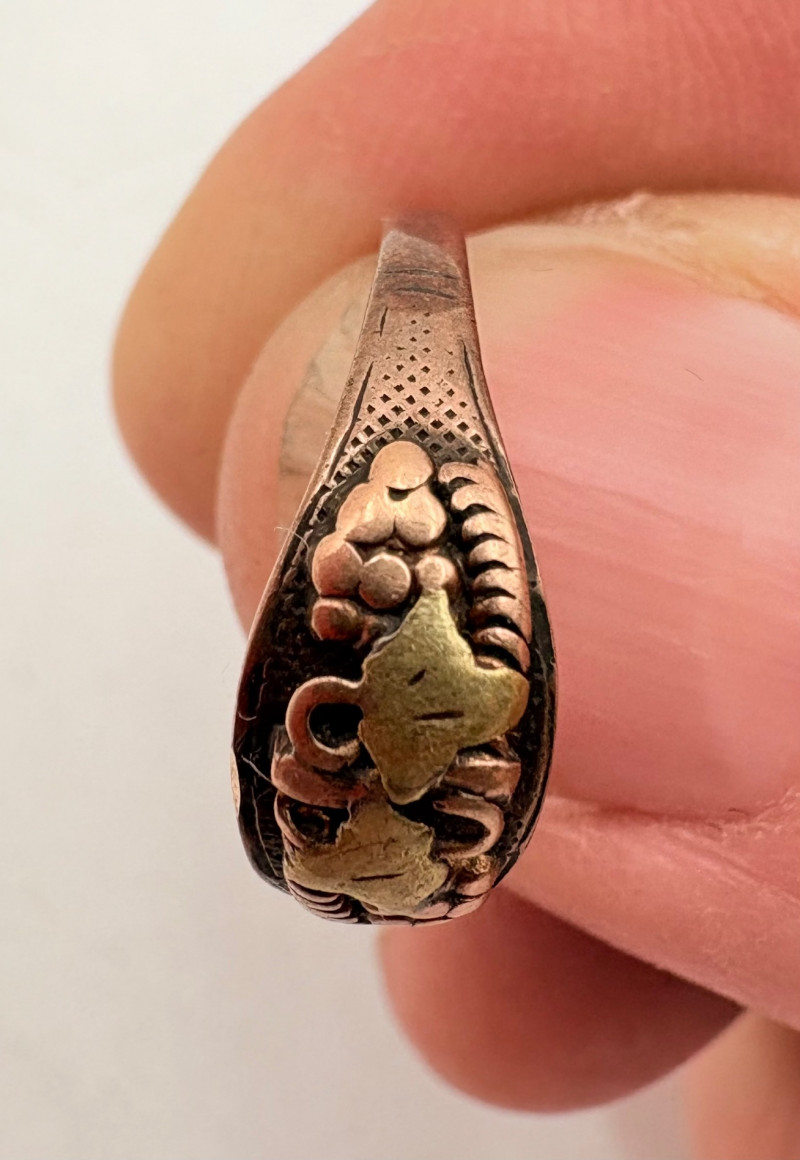 Pair of beautiful antique jewelry pieces that have stood the test of time. We believe the bracelet is a Japanese Damascene panel bracelet - each of the 13 panel scenes is unique and finely wrought. Traditionally these bracelets are made with gold & silver inlay on a steel or iron backing, but there is no indication of material on this bracelet. There is a maker's mark of an "M" inside an overdrawn diamond shape. A special touch with this bracelet is that the inside of the panels that are against the skin are also incised with individual floral motifs rather than being simply plain. The panels are 5/8" H and there is a safety chain. Small antique ring shows a fair amount of wear, but the delicacy is lovely - says "Oregon Gold" and was verified by the jeweler to be 10K. Note: please disregard the red cast to the bracelet photos - our red phone case was reflecting on the metal finish.