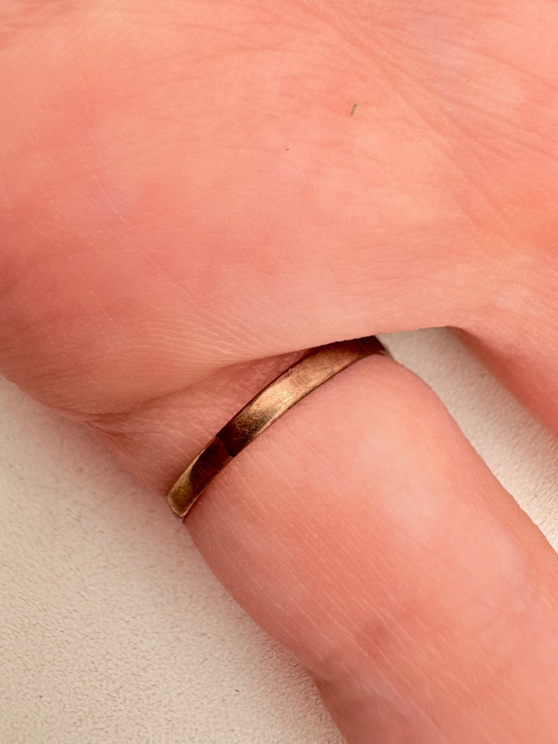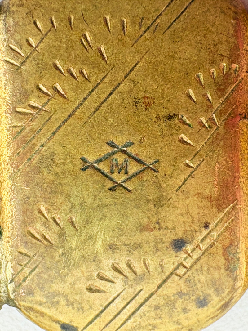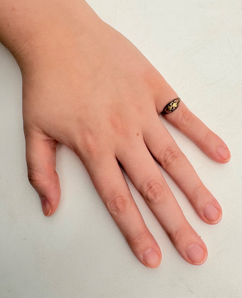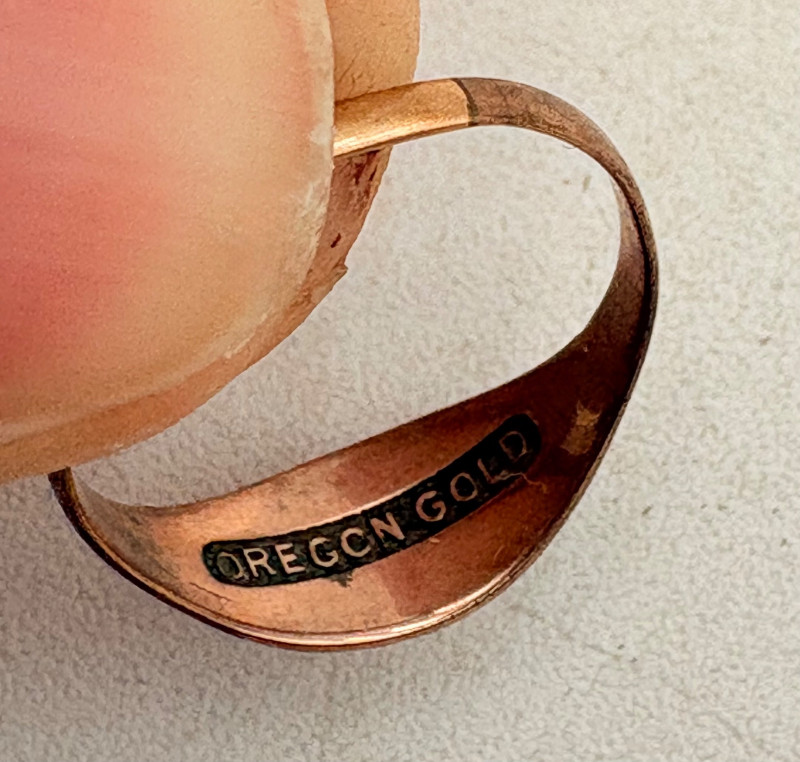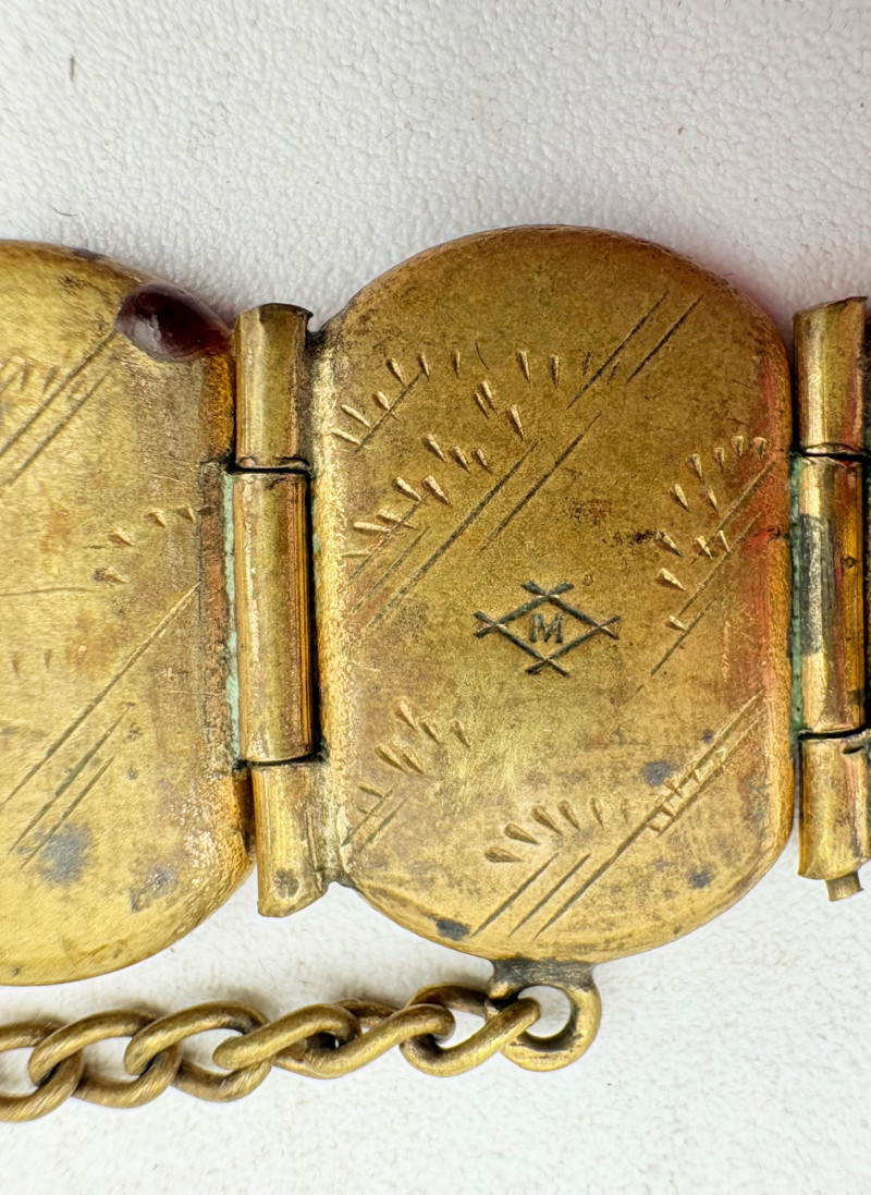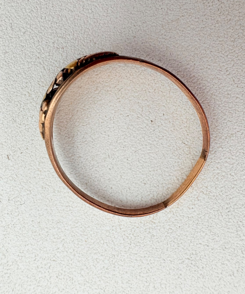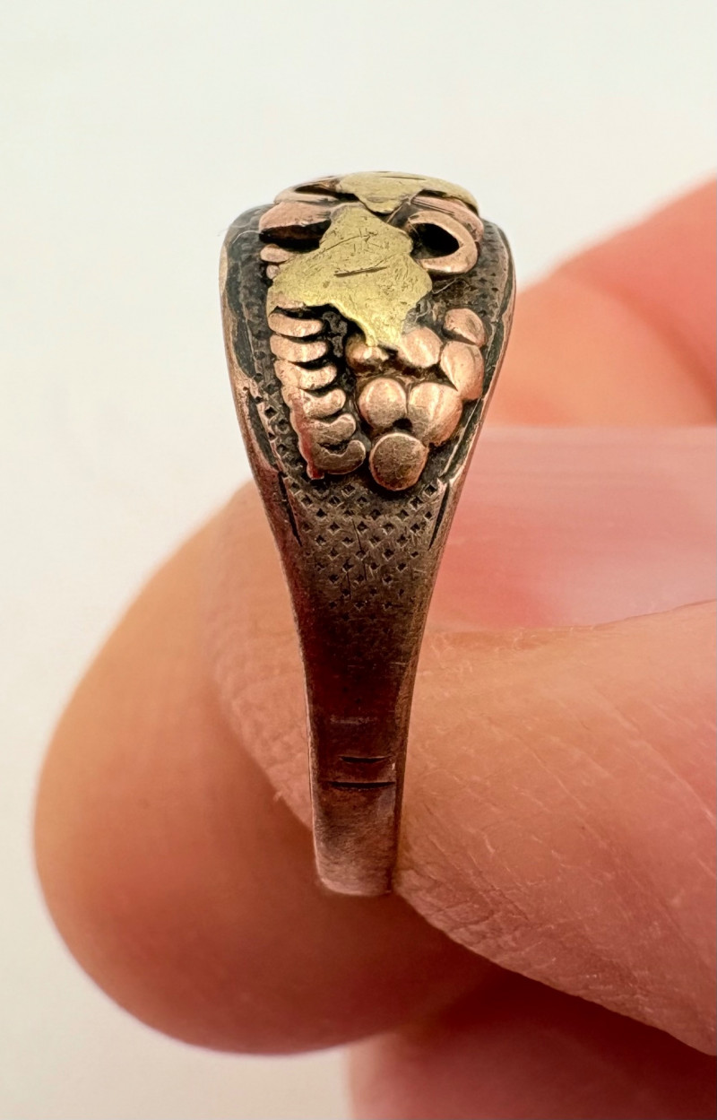 Pair of beautiful antique jewelry pieces that have stood the test of time. We believe the bracelet is a Japanese Damascene panel bracelet - each of the 13 panel scenes is unique and finely wrought. Traditionally these bracelets are made with gold & silver inlay on a steel or iron backing, but there is no indication of material on this bracelet. There is a maker's mark of an "M" inside an overdrawn diamond shape. A special touch with this bracelet is that the inside of the panels that are against the skin are also incised with individual floral motifs rather than being simply plain. The panels are 5/8" H and there is a safety chain. Small antique ring shows a fair amount of wear, but the delicacy is lovely - says "Oregon Gold" and was verified by the jeweler to be 10K. Note: please disregard the red cast to the bracelet photos - our red phone case was reflecting on the metal finish.