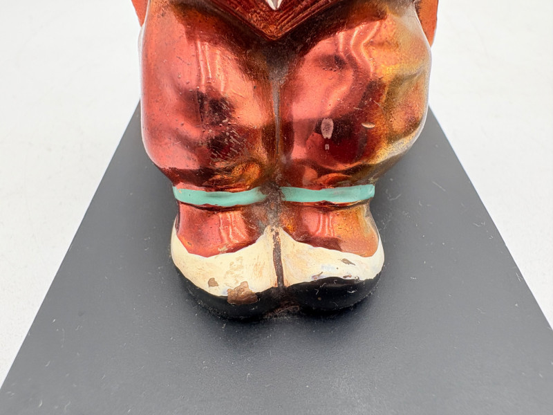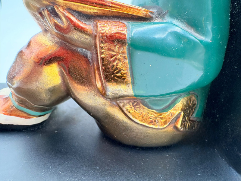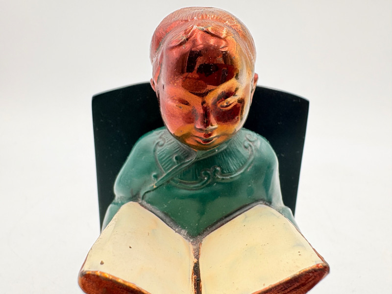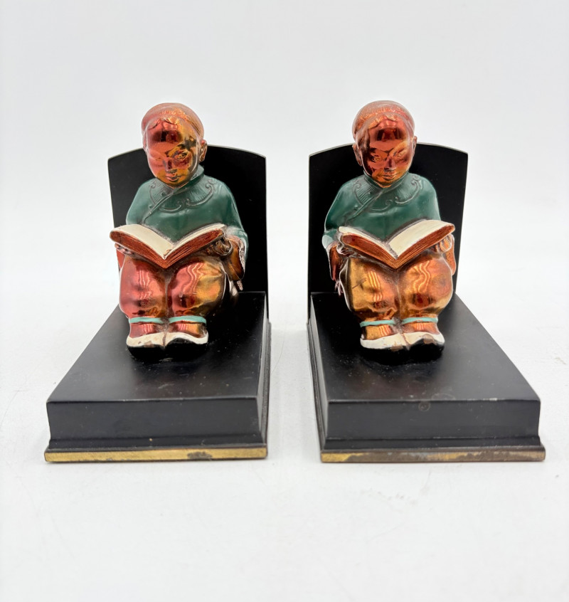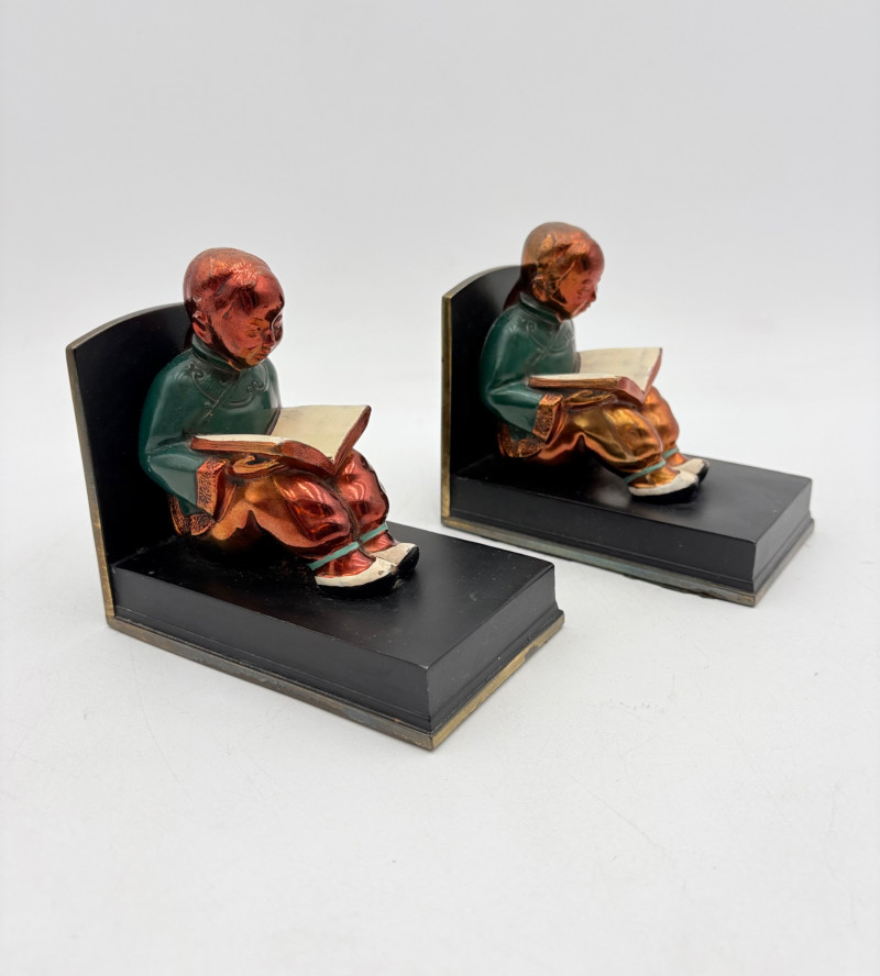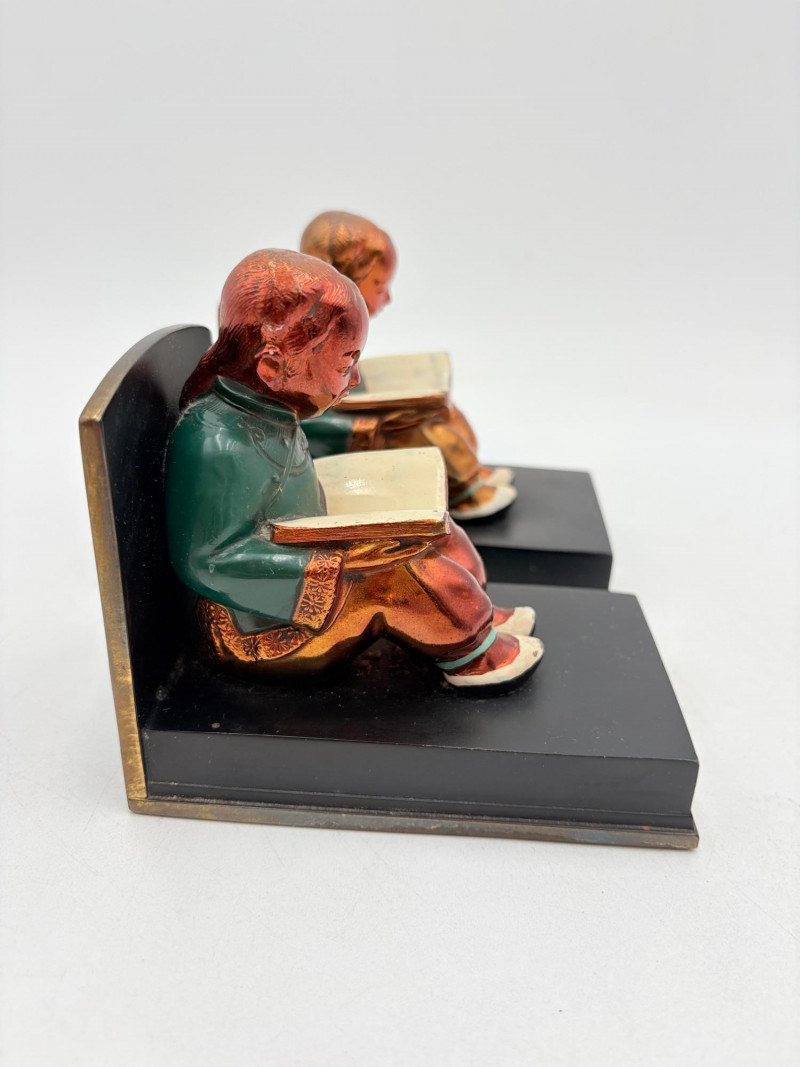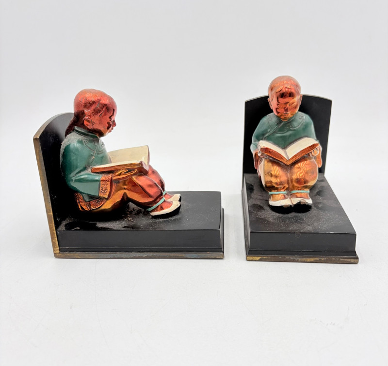 Nice pair of antique bookends with heavy metal bases and enameled readers in traditional East Asian garb. From Roos Brothers. This was a very popular image for bookends in the early 1900s when we think these may have been produced. While they are in good condition for their age, the felt needs to be replaced on the bottoms - please see photos for details. They measure 4.25" H x 4.75" L x 3" W.