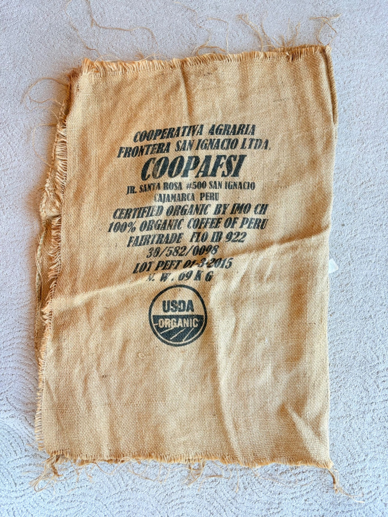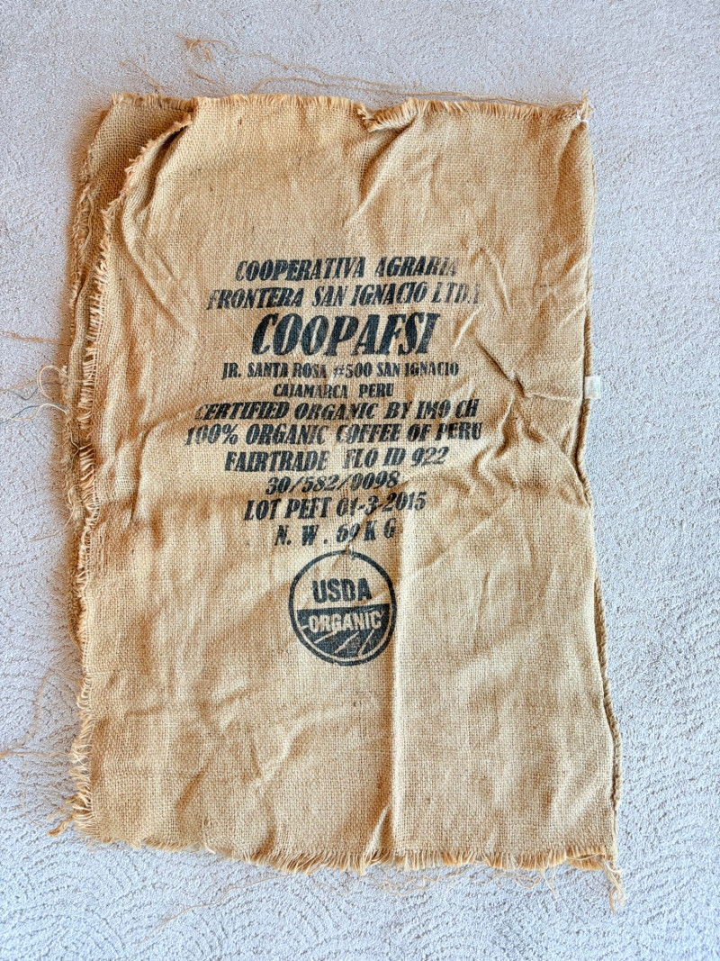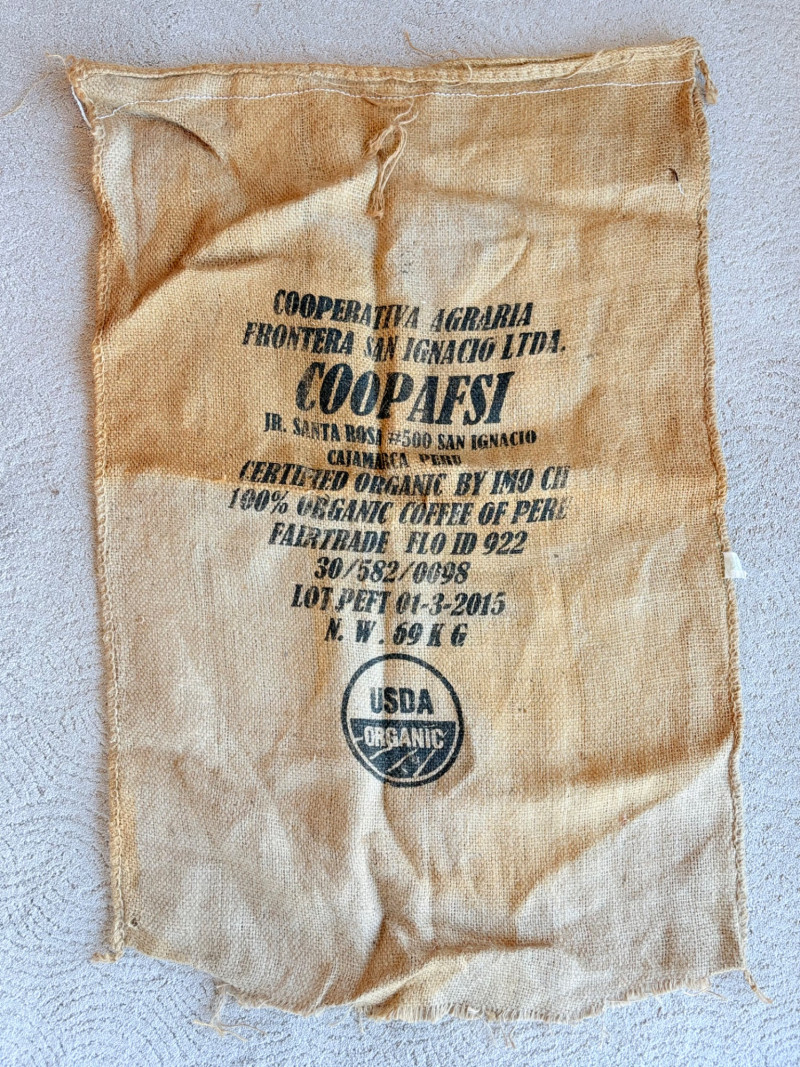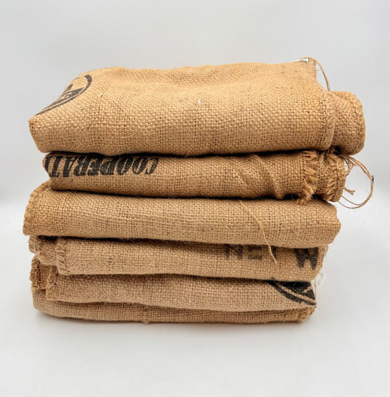 6 vintage jute coffee bags from 2 different sources. 4 of the 6 have a slit at one end where the beans were released into the processors. 2 of the bags have also been opened at seams on the side and the ends so they lay flat. Measure a little over 3' x 2'.