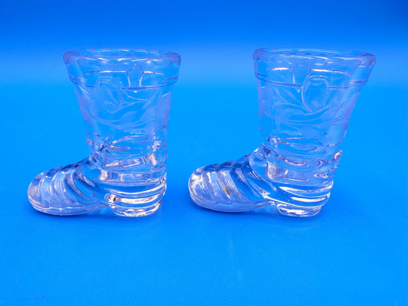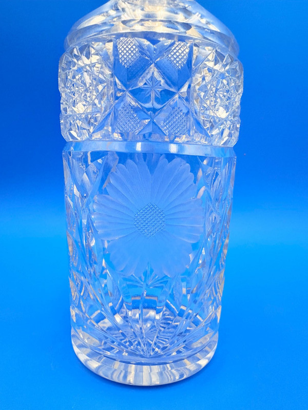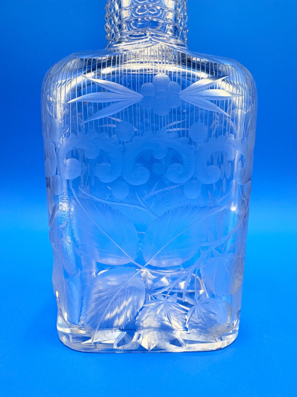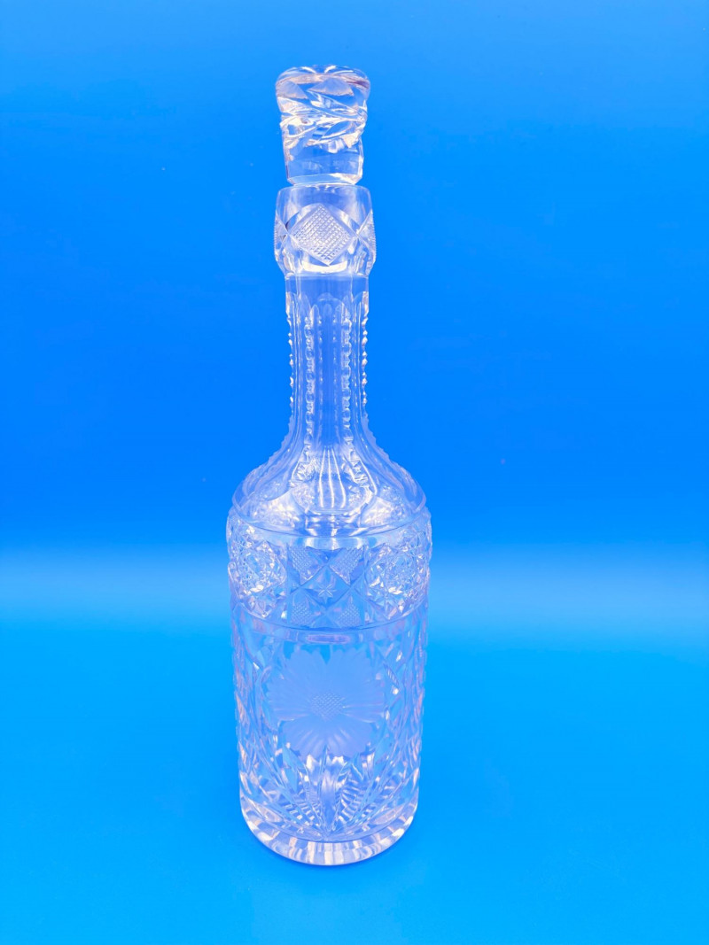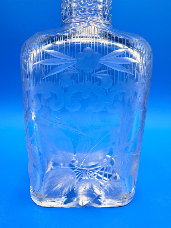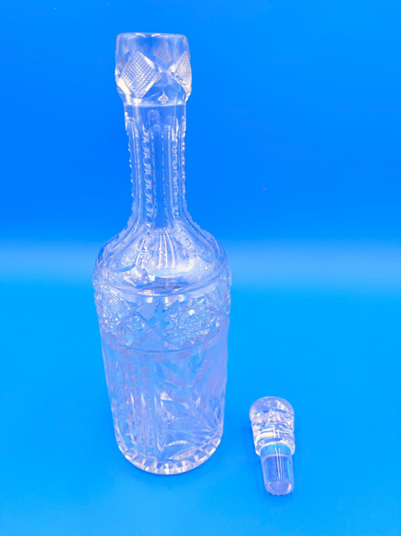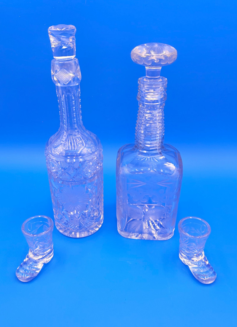 Pair of 2 lead crystal decanters - both are elegant, have the "ting" of fine crystal and are in great condition. We've added a couple of boot shot glasses to complete the lot ((they are not crystal, but blend with the decanters well with decorative incising) Lot includes: - Round bottle shaped decanter - pattern resembles American Brilliant Period cut crystal. Measures approx. 12" H. - Square bottle decanter is incised with floral motifs. Measures approx. 12' H. - 2 boot shot glasses with incised flower motif. Measure 3" H. BONUS: we found a shot glass that matched the square decanter after doing lead photos!