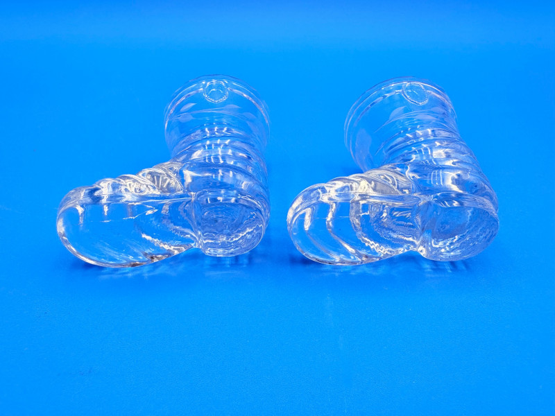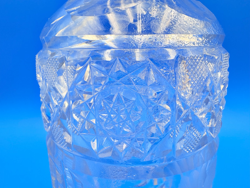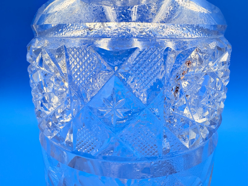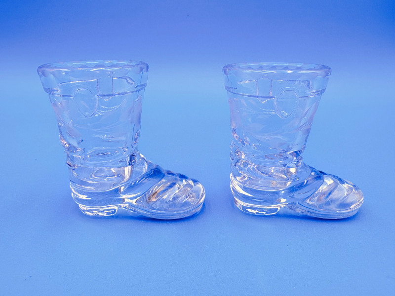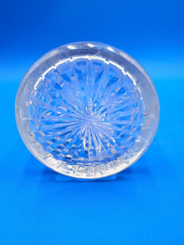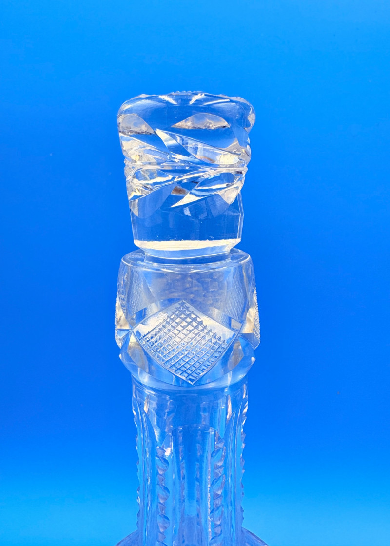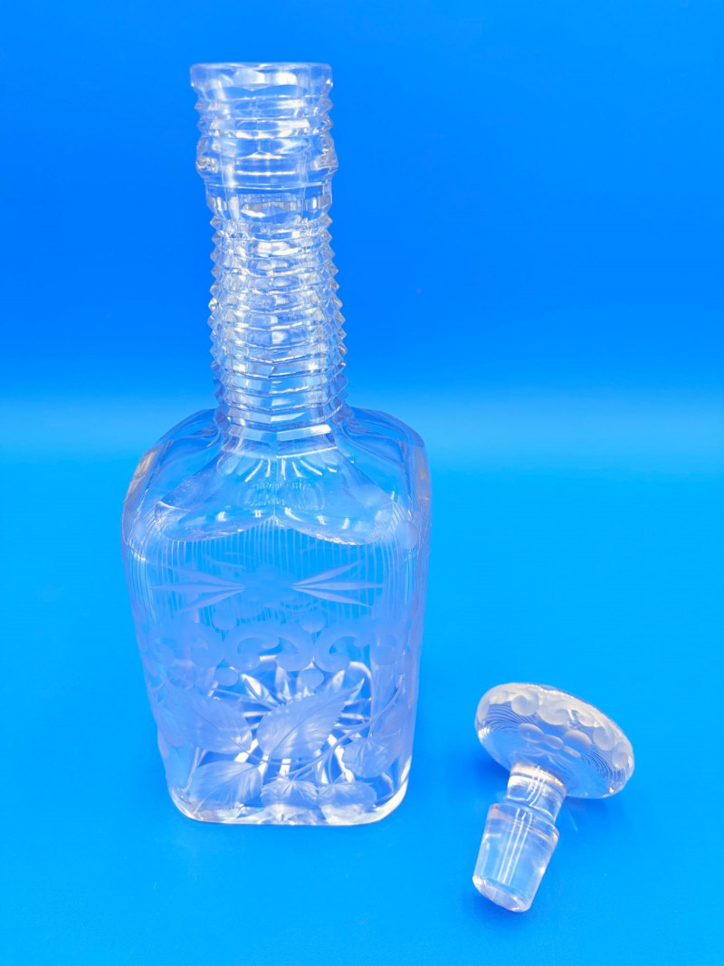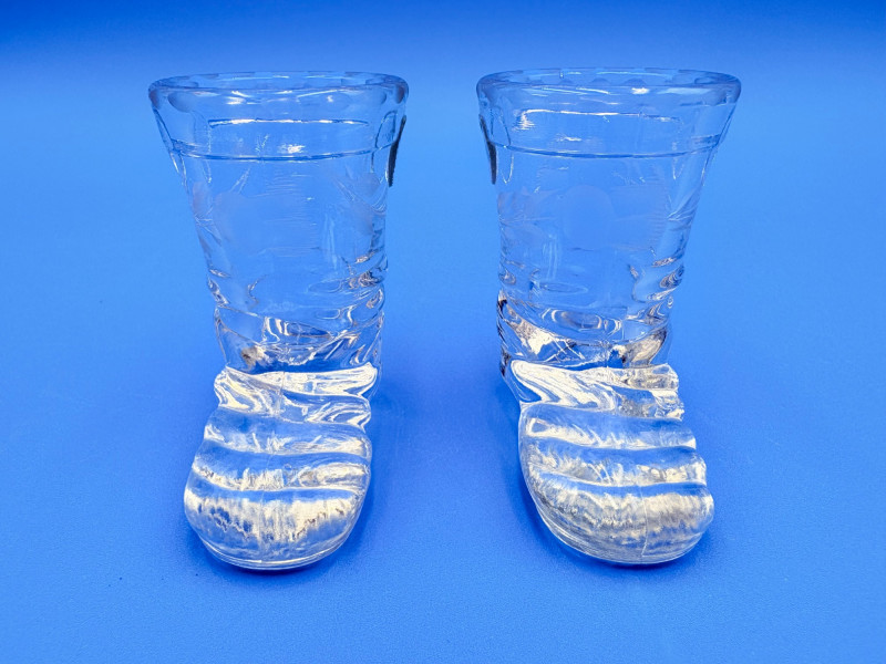 Pair of 2 lead crystal decanters - both are elegant, have the "ting" of fine crystal and are in great condition. We've added a couple of boot shot glasses to complete the lot ((they are not crystal, but blend with the decanters well with decorative incising) Lot includes: - Round bottle shaped decanter - pattern resembles American Brilliant Period cut crystal. Measures approx. 12" H. - Square bottle decanter is incised with floral motifs. Measures approx. 12' H. - 2 boot shot glasses with incised flower motif. Measure 3" H. BONUS: we found a shot glass that matched the square decanter after doing lead photos!