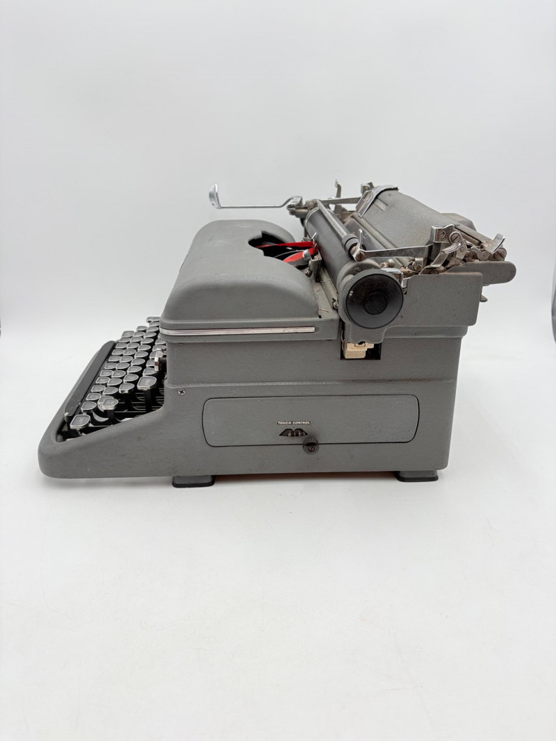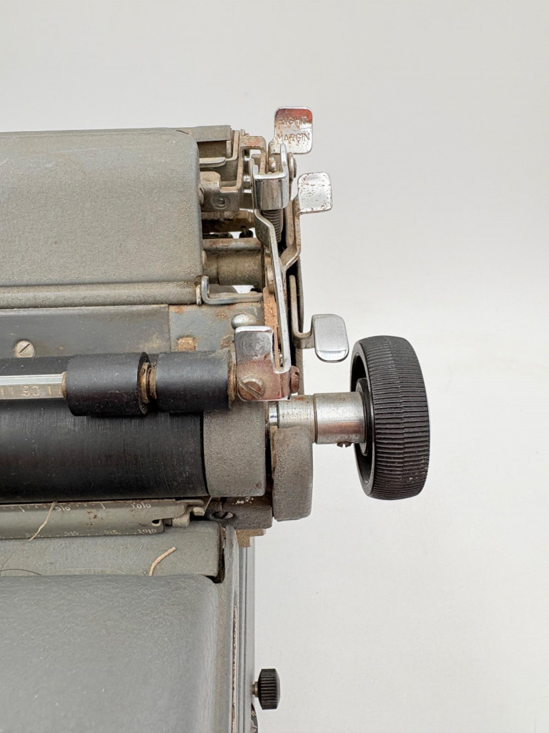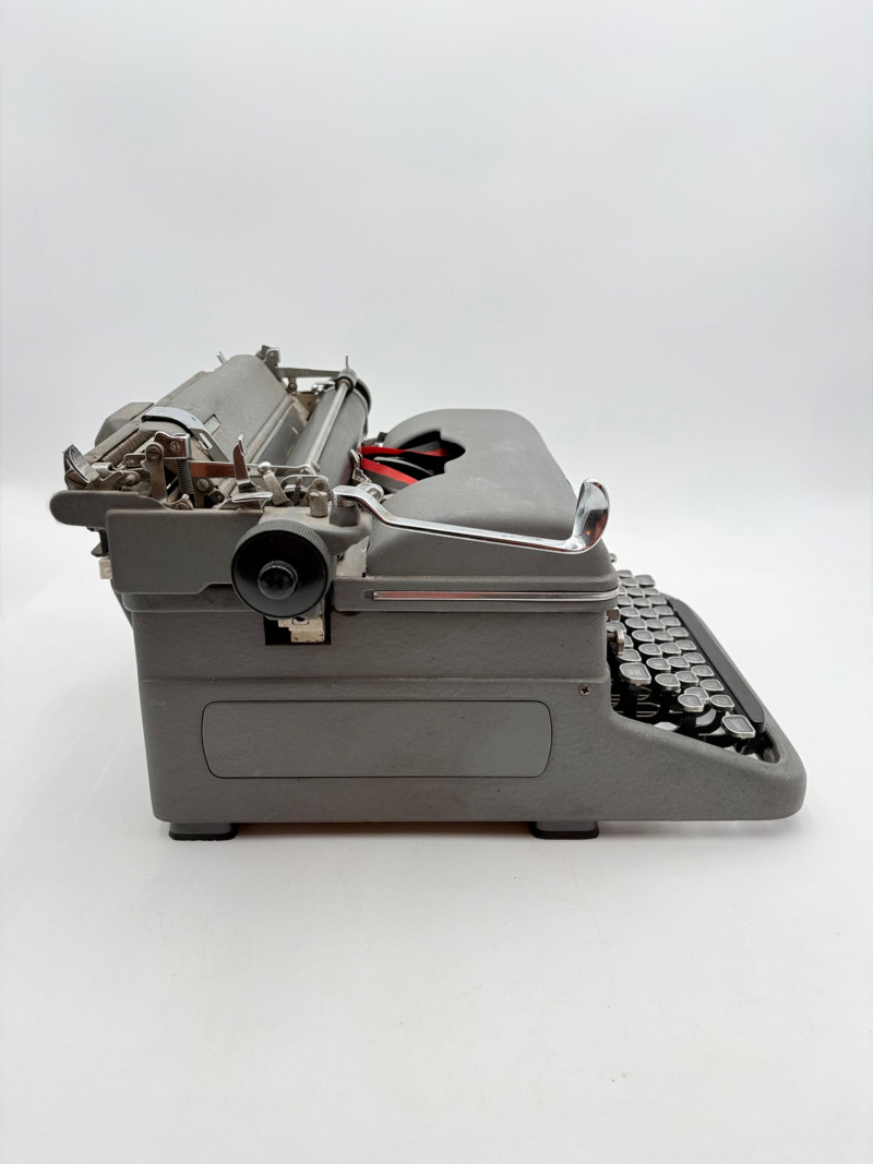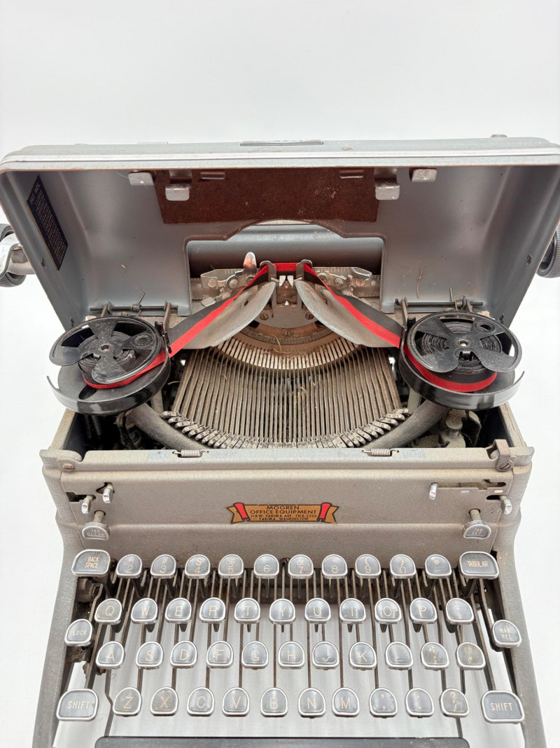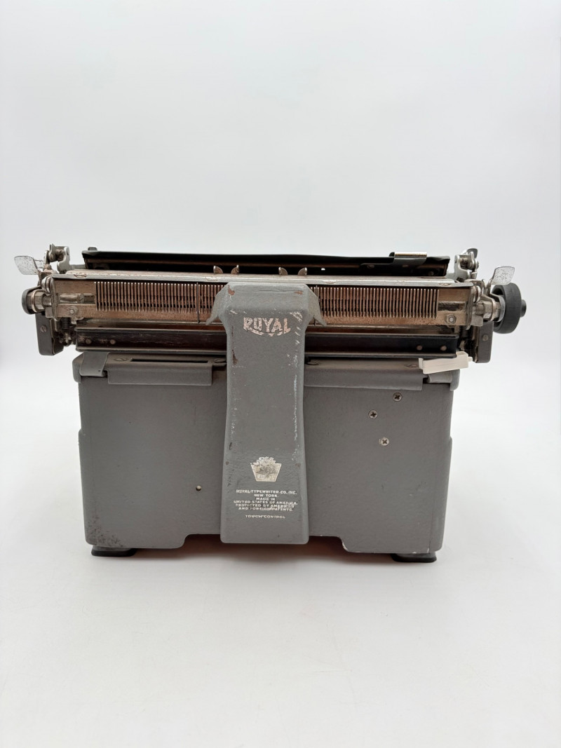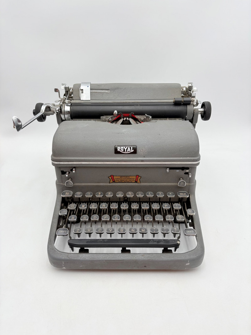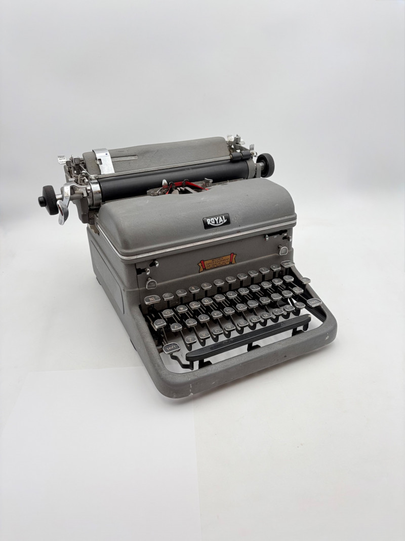 Great lines on this older typewriter! This heavy metal Royal model is from the 1940s and reminds us of all those great movies from that period where a detective types out his notes! It appears to be in solid condition in terms of construction but has been in storage for many years and needs some TLC. It is quite dirty and in good need of a clean as well as a tune-up to fix some sticky keys/non-working keys (we think cleaning might improve the key action - they are very dusty). It is also in need of a new ribbon. We believe this was used by our client early in his long career as a working journalist and professor in the pre-computer era.