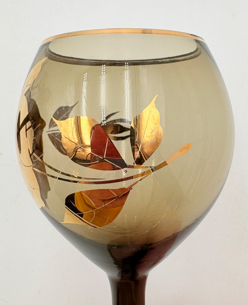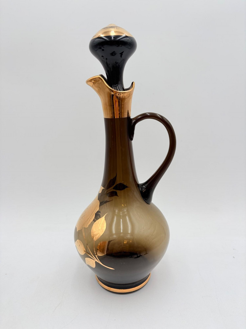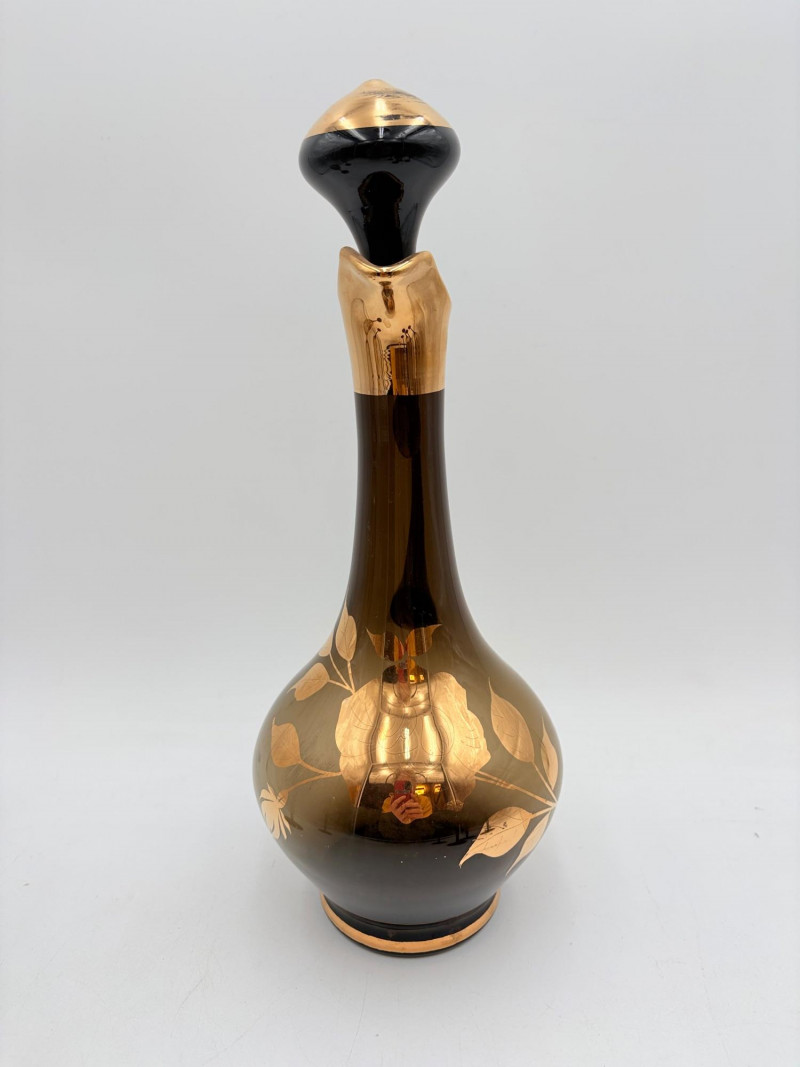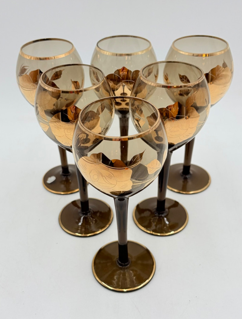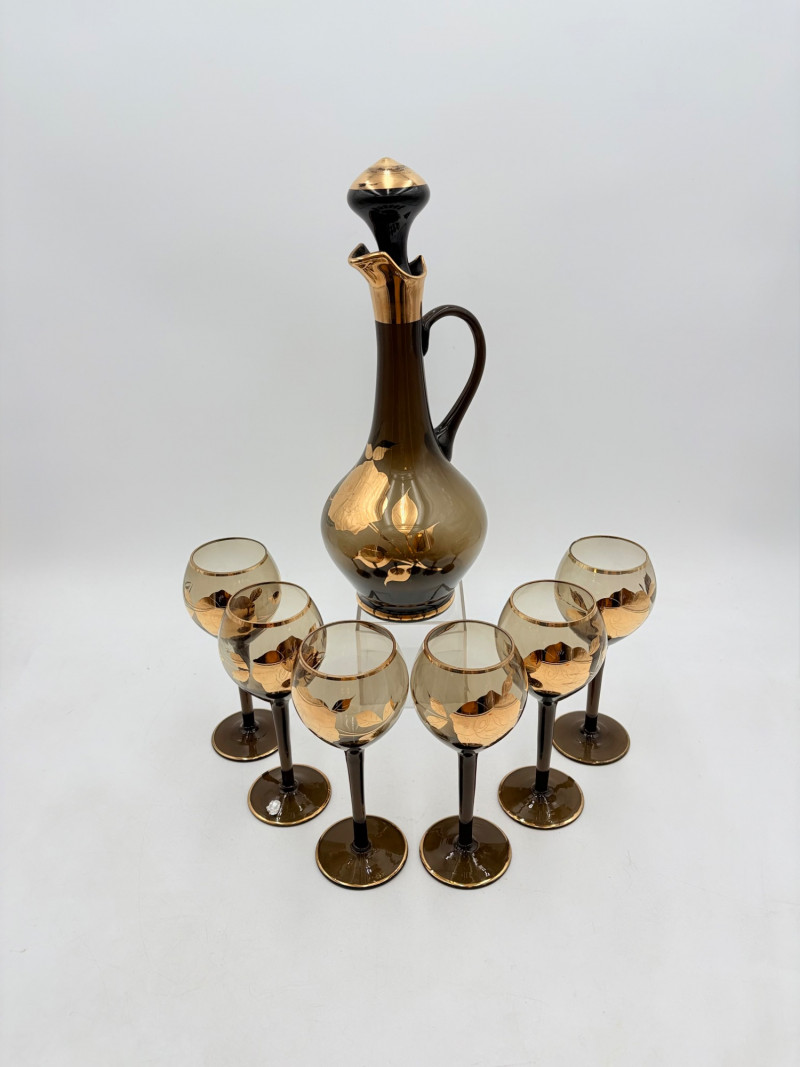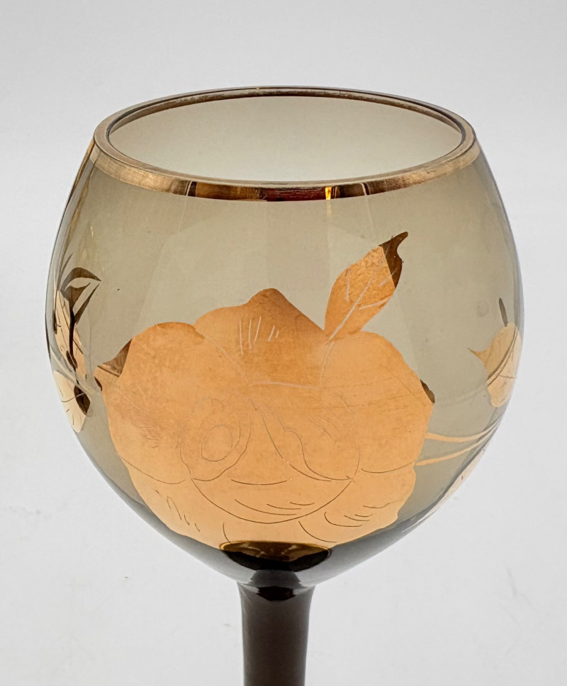 Really lovely MCM Romanian dark smoked glass decanter with stopper in grey-black with golden rose motif. 6 matching wine glasses. In wonderful vintage condition only showing slight wear on the stopper's gold paint - see photo. Unfortunately, the gold surface is highly reflective, so we had a hard time really showing how lovely the rose motif is with its incised details. One of the glasses still has a tag from the maker, but it has faded so much we can't make the name out. Decanter measures 14" H.
