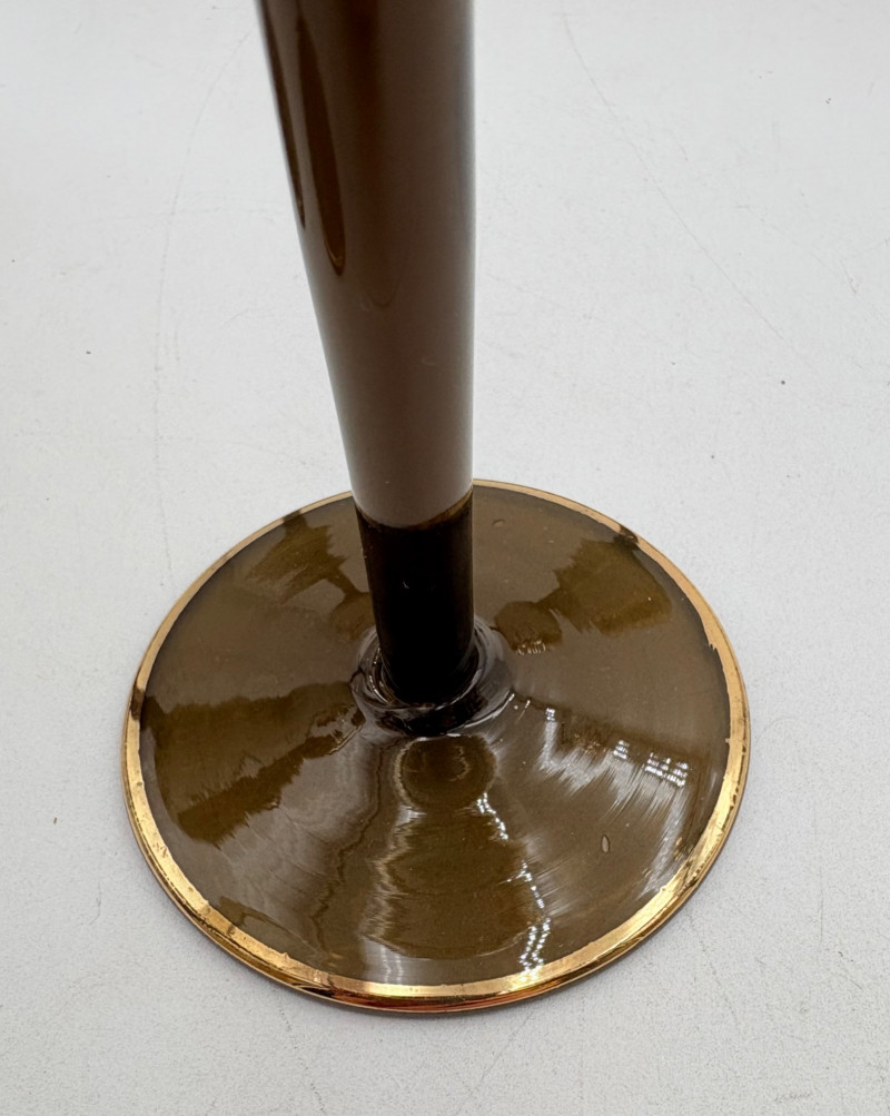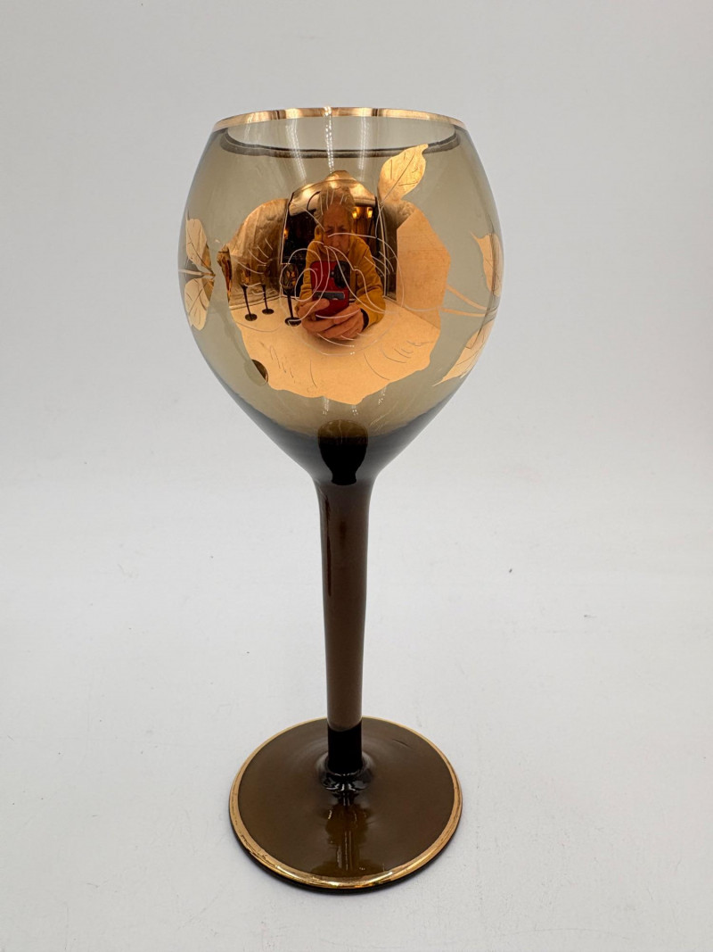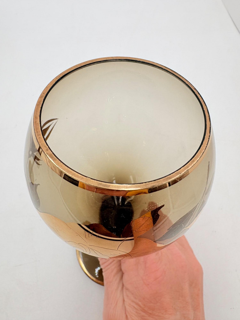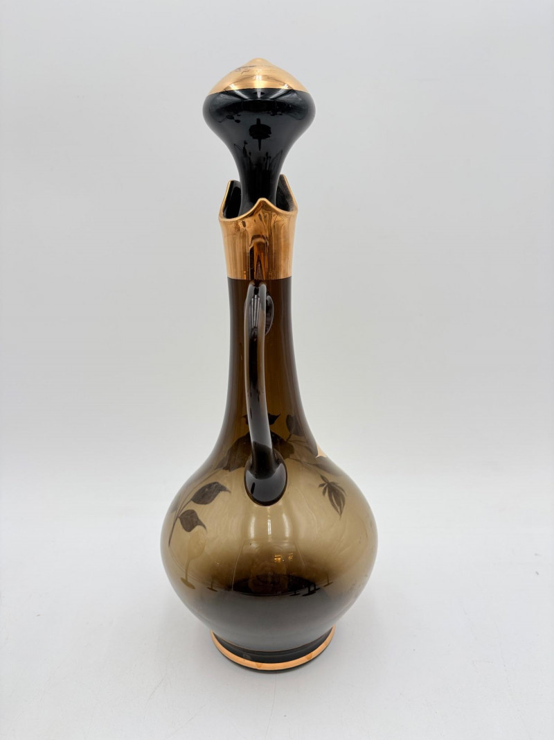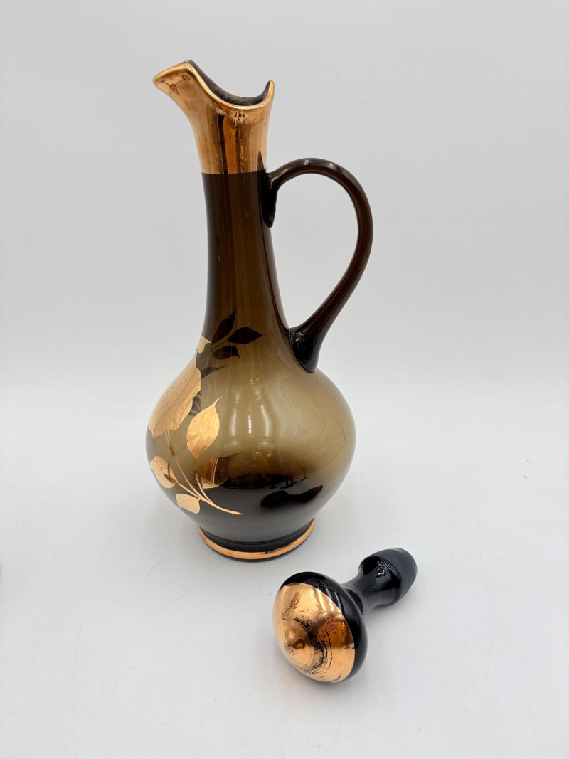 Really lovely MCM Romanian dark smoked glass decanter with stopper in grey-black with golden rose motif. 6 matching wine glasses. In wonderful vintage condition only showing slight wear on the stopper's gold paint - see photo. Unfortunately, the gold surface is highly reflective, so we had a hard time really showing how lovely the rose motif is with its incised details. One of the glasses still has a tag from the maker, but it has faded so much we can't make the name out. Decanter measures 14" H.