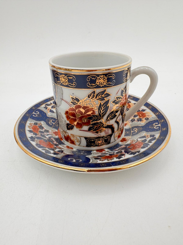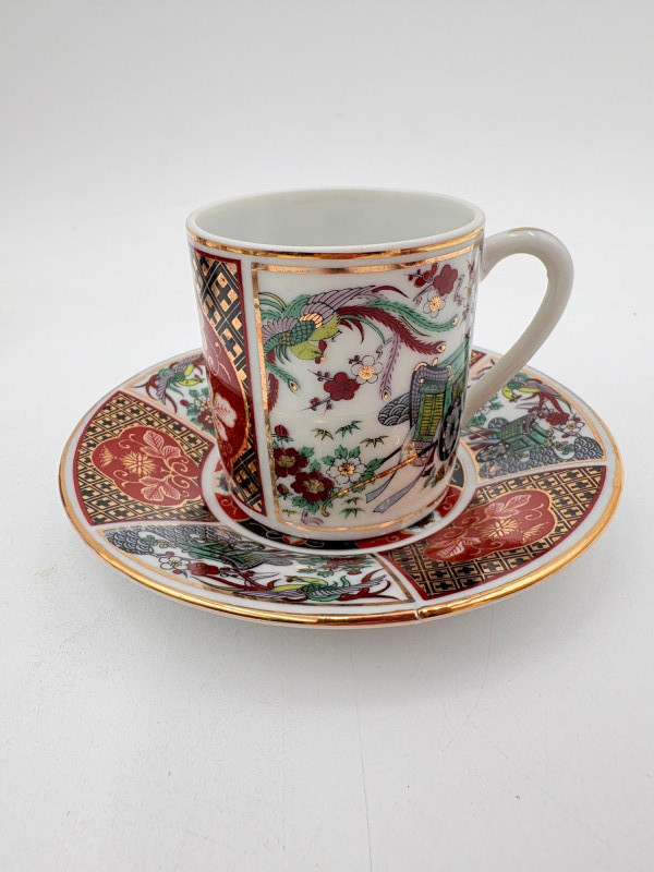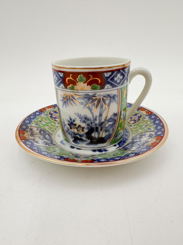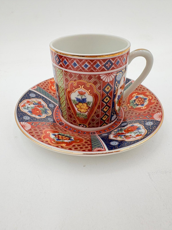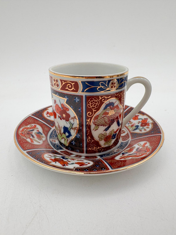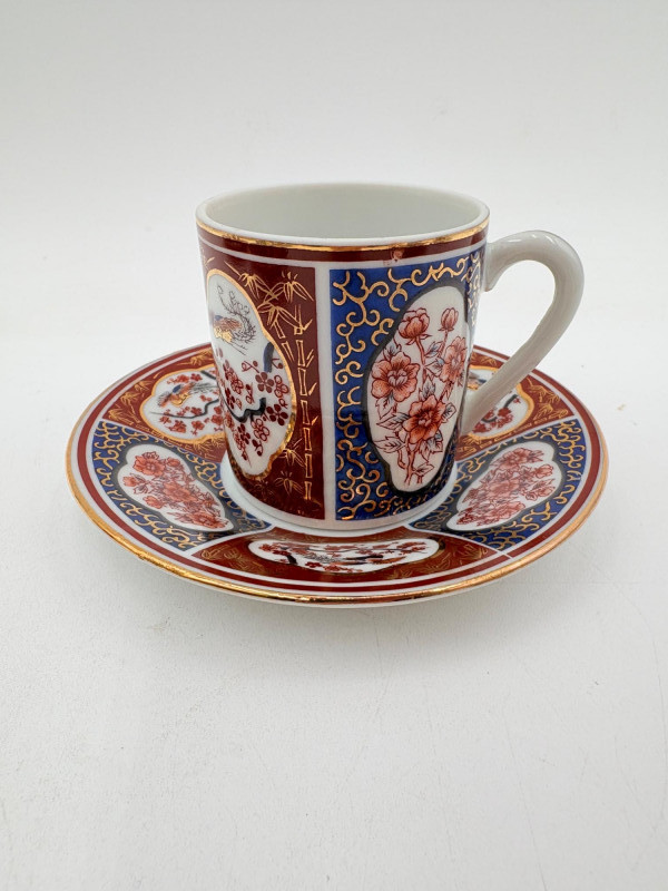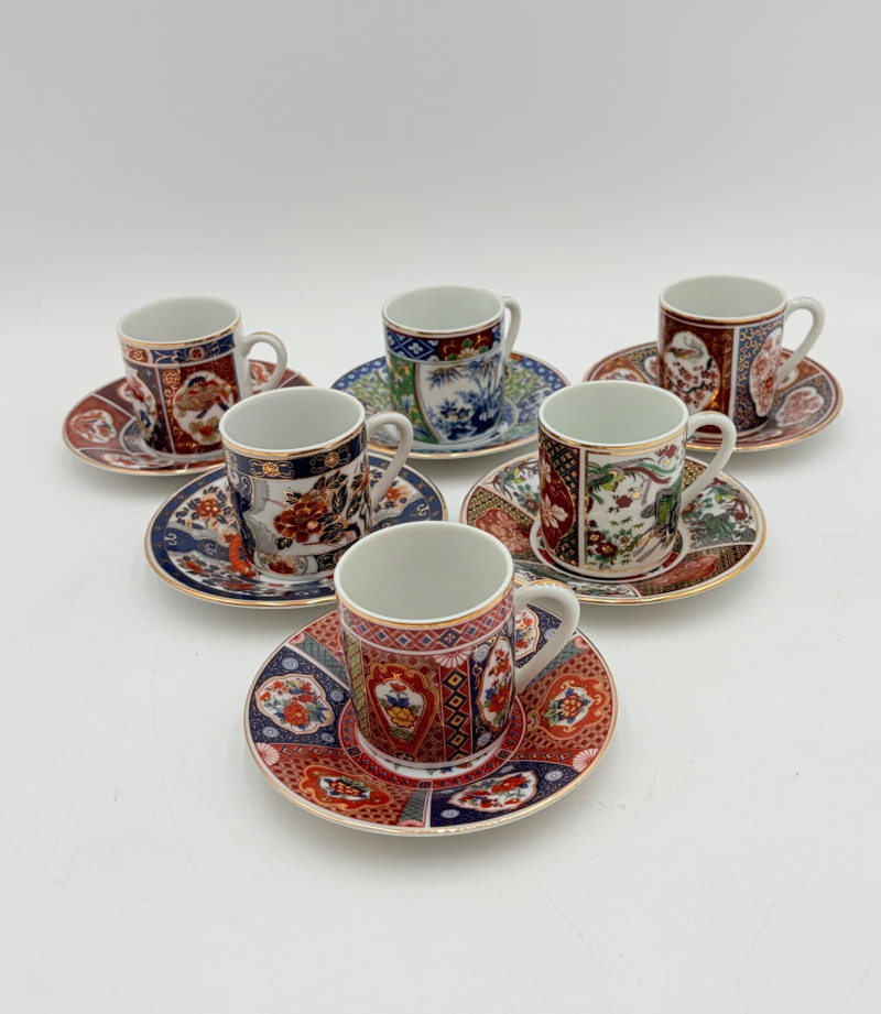 Cups for those who prefer smaller servings! Bisque brown teapot, creamer, and 4 cups/saucers. Cups are 1.25" H. 6 slightly larger cups & saucers in 6 distinct Imari-style patterns. Cups are 2.25" H. (perfect espresso size)